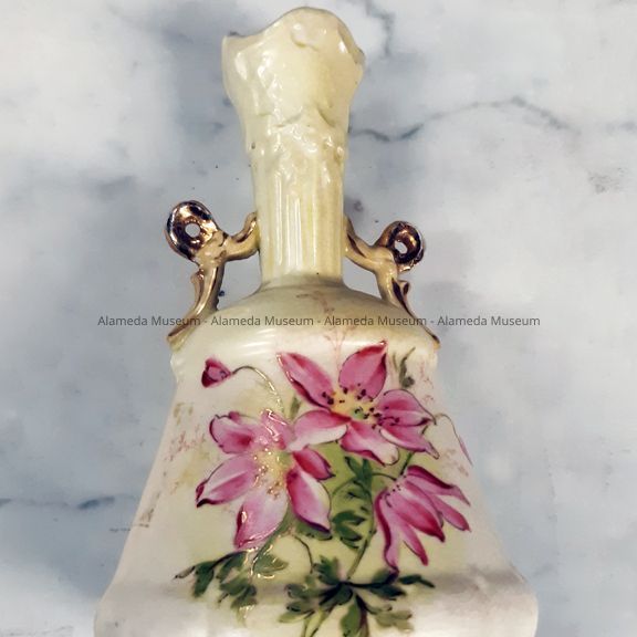 Semi-porcelain bud vase with pink flowers and gold handles, c. 1900Entry/Object ID