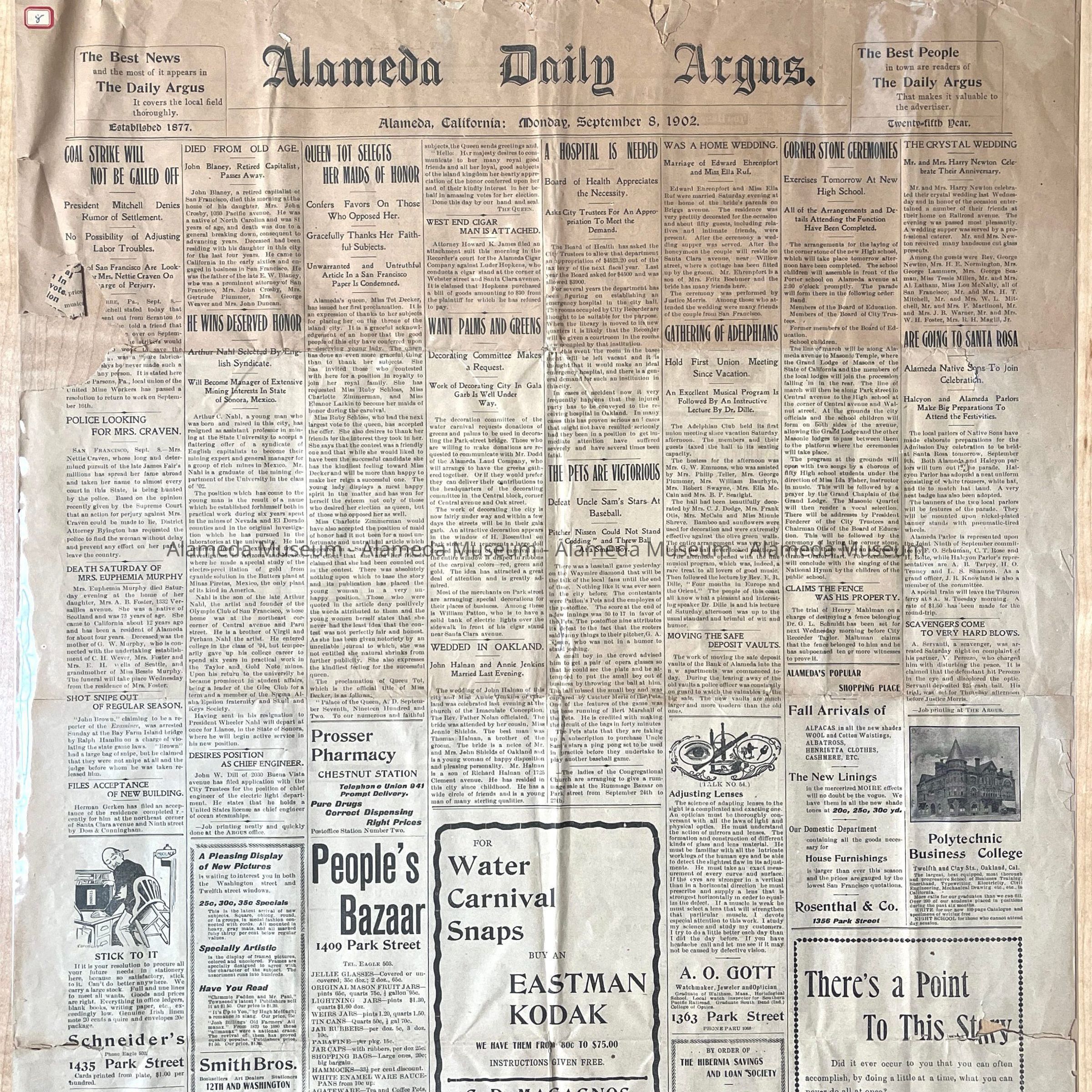 September 8, 1902 Daily Argus from the 1902 Alameda High School Cornerstone BoxEntry/Object ID