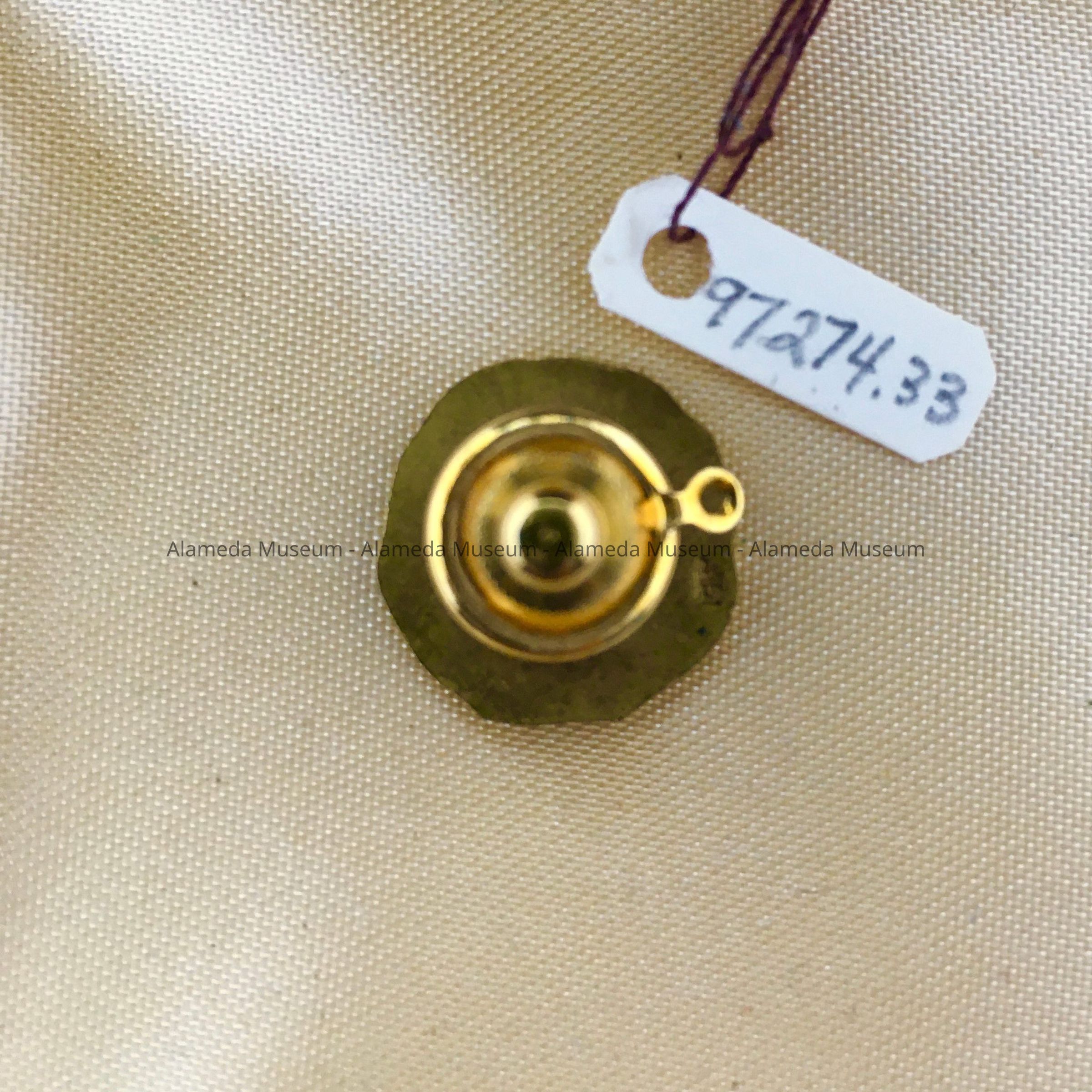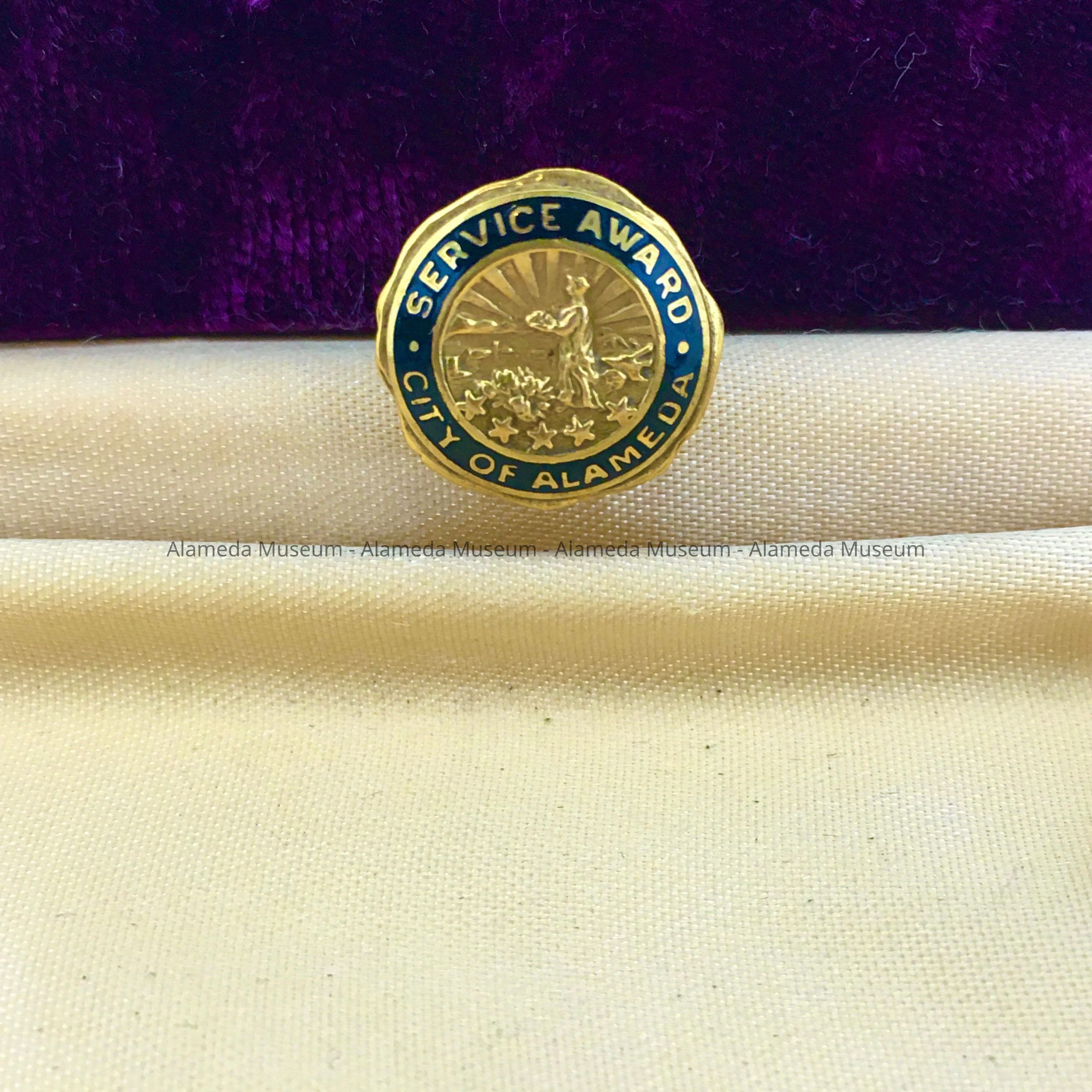 CIRCULAR-SHAPED, GOLD-PLATED TIE PIN, WITH CENTER MOTIF OF A REPLICATION OF THE SEAL OF THE CITY OF ALAMEDA. THE DESIGN ALSO CONSISTS OF A BORDER OF BLACK ENAMELING, WITH A CAPTION, "SERVICE AWARD, CITY OF ALAMEDA," IN GOLD-COLORED LETTERING.