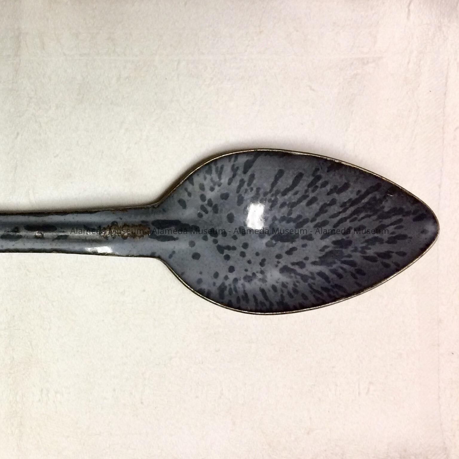 Description: A grey and black mottled enamel spoon. Its handle is pierced for hanging.