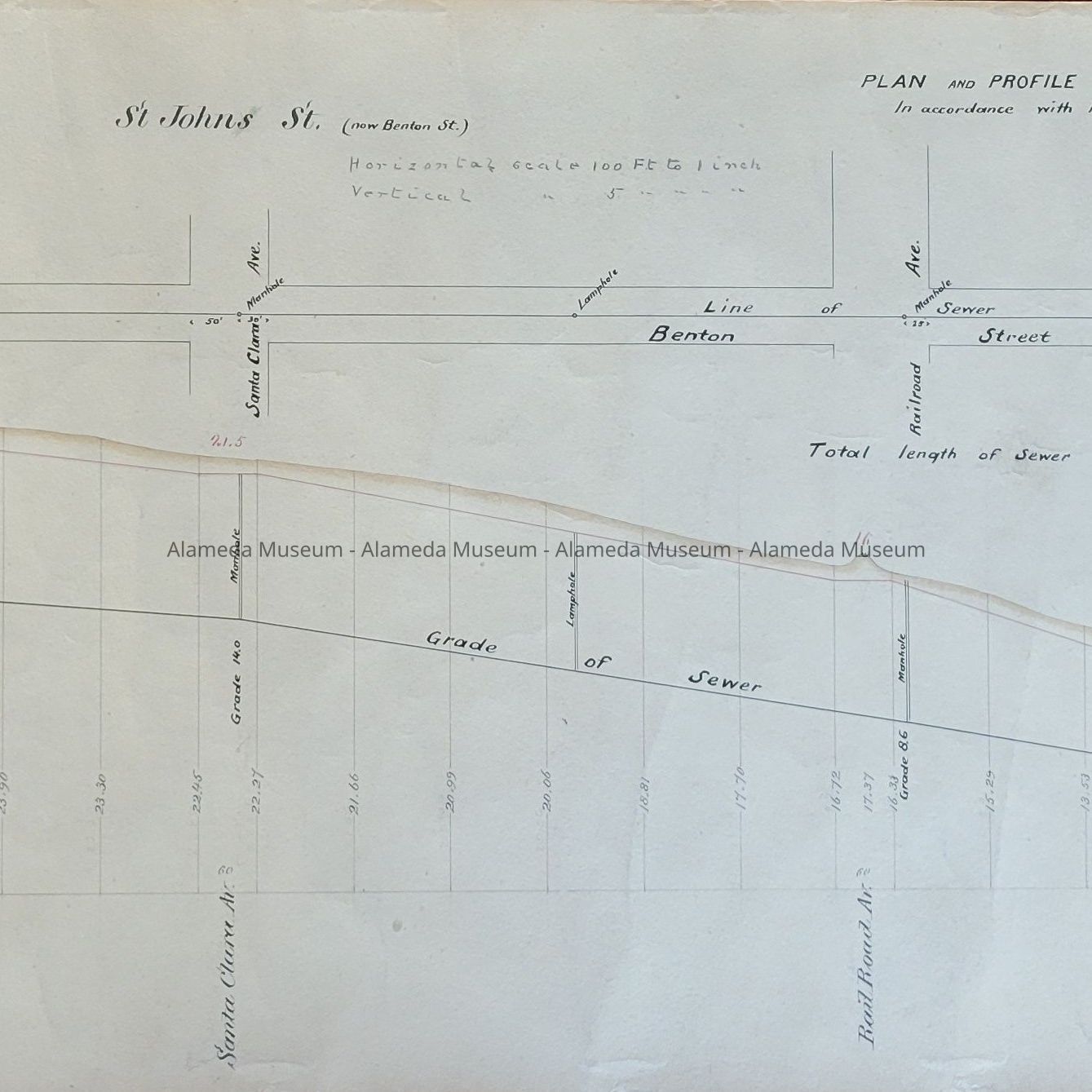 Description: Hand-drawn on heavy-stock paper in black ink, showing the sewer main on Benton St., between Encinal Ave. and Eagle Ave in plan and profile views. Locations of manhole and lamphole locations are also shown