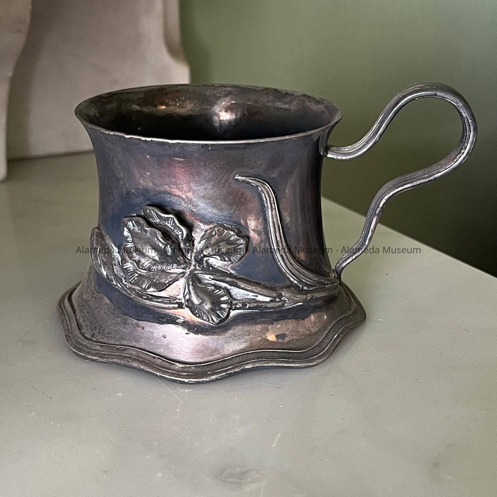 Description: Silver plated shaving mug with decorative motifs (in the "art nouveau" style) consisting of a raised iris design. Signed on base (incised stamp) "Made and Guaranteed by Meriden-B. Company, Rogers Bros., 322, U.S.A.