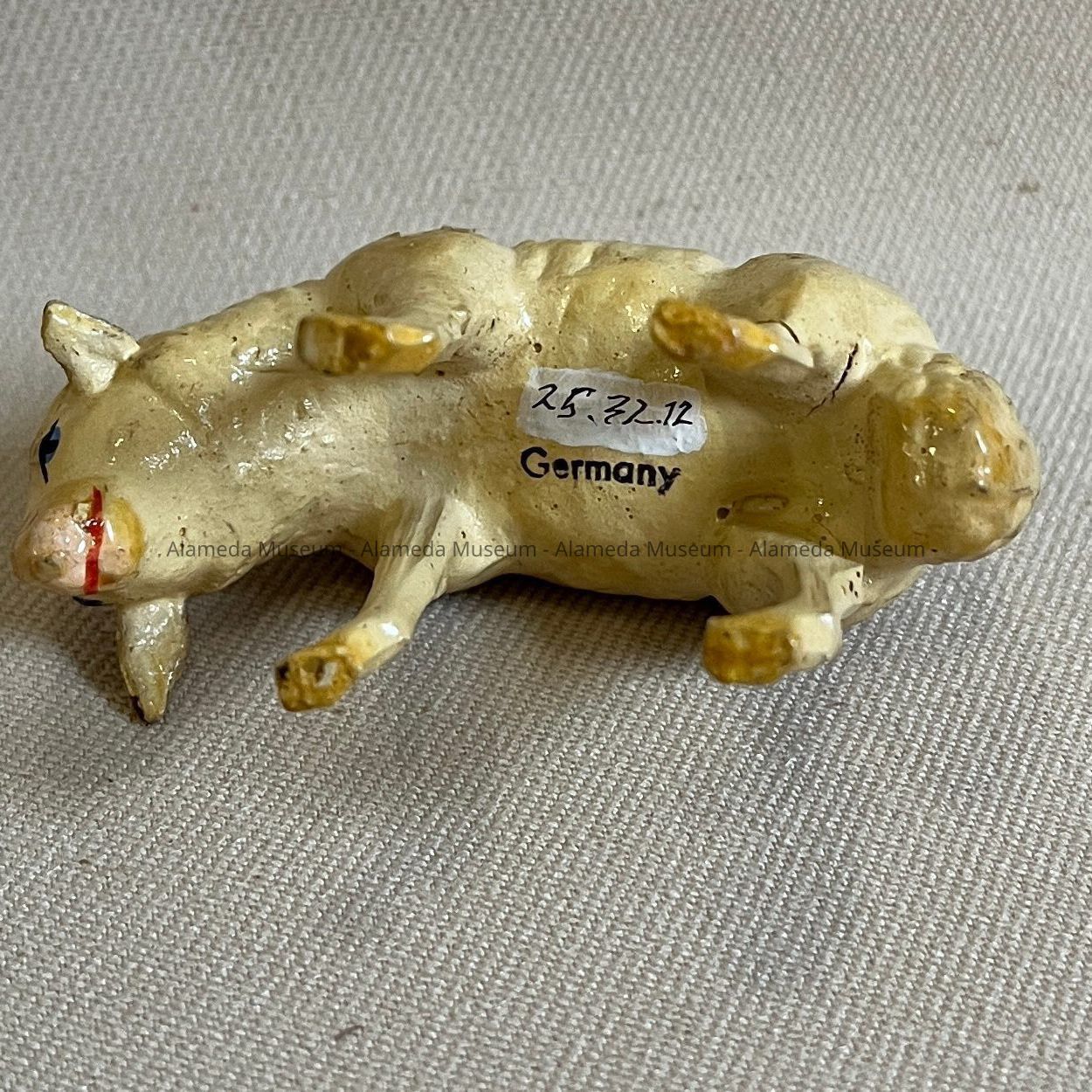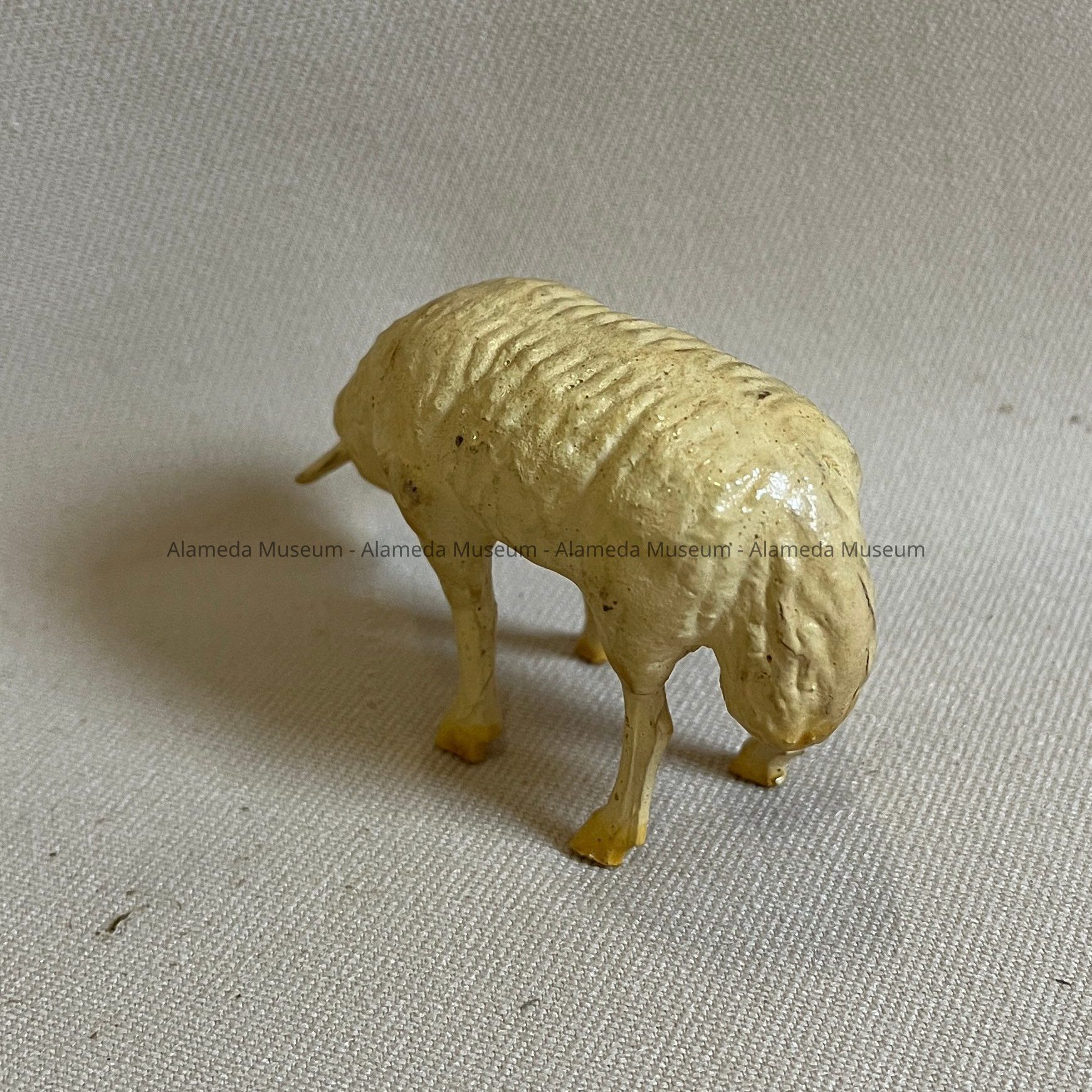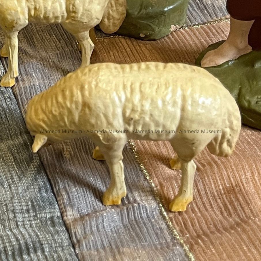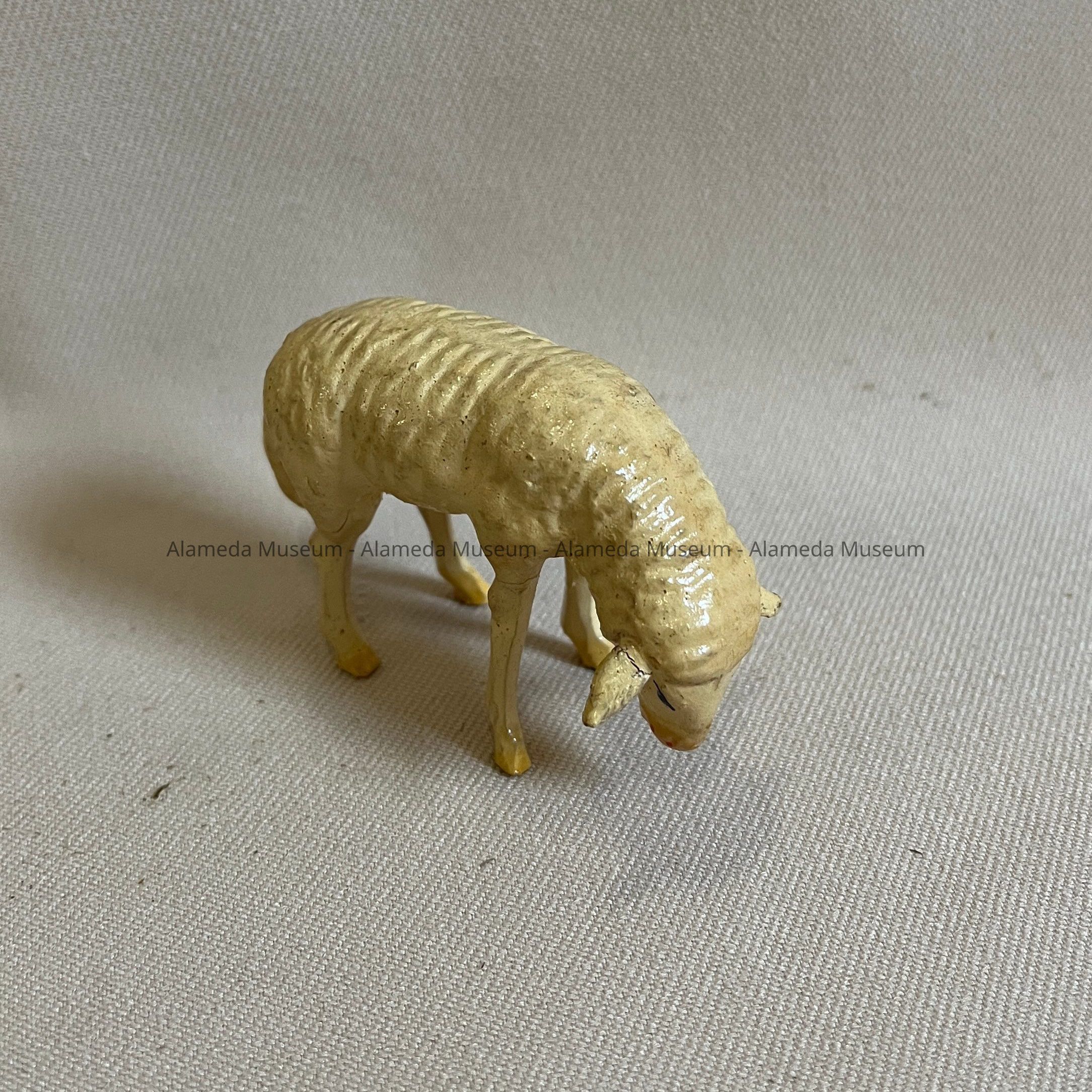 History of Object: Figurine of a sheep with long tail. Part of a Manger or Nativity Scene of the Martin Family, who came to Alameda in the early 1900s.
