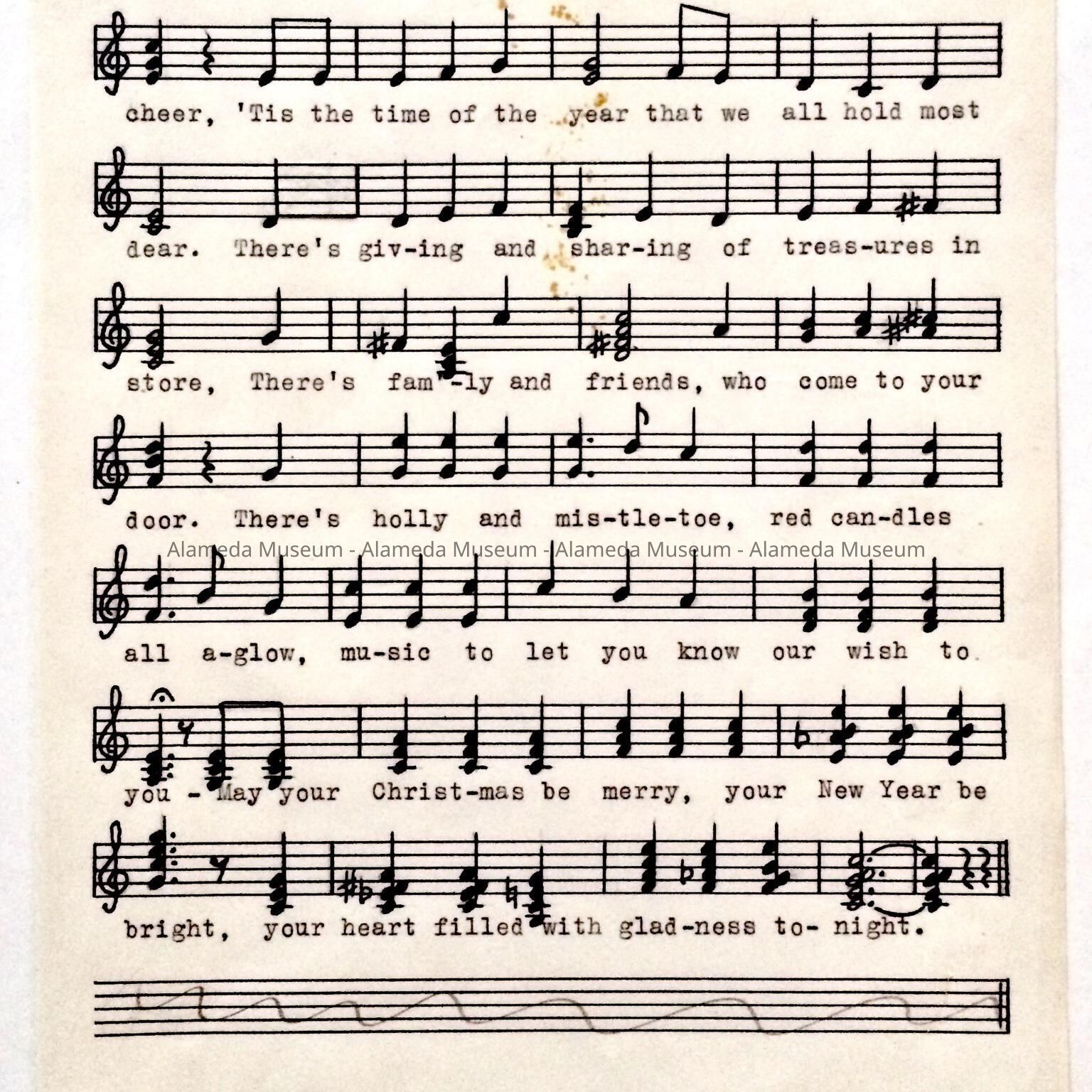 A CHRISTMAS SONG WHICH WAS LATER ADAPTED TO GREETING CARDS, WRITTEN BY THE LATE CAROL AND ARTHUR HESCHE. CAROL WAS THE GRANDDAUGHTER OF W W CHIPMAN, CO-FOUNDER OF THE CITY OF ALAMEDA. HER HUSBAND, ARTHUR, WAS A LONG-TIME PRINCIPAL OF WASHINGTON SCHOOL, ALAMEDA.