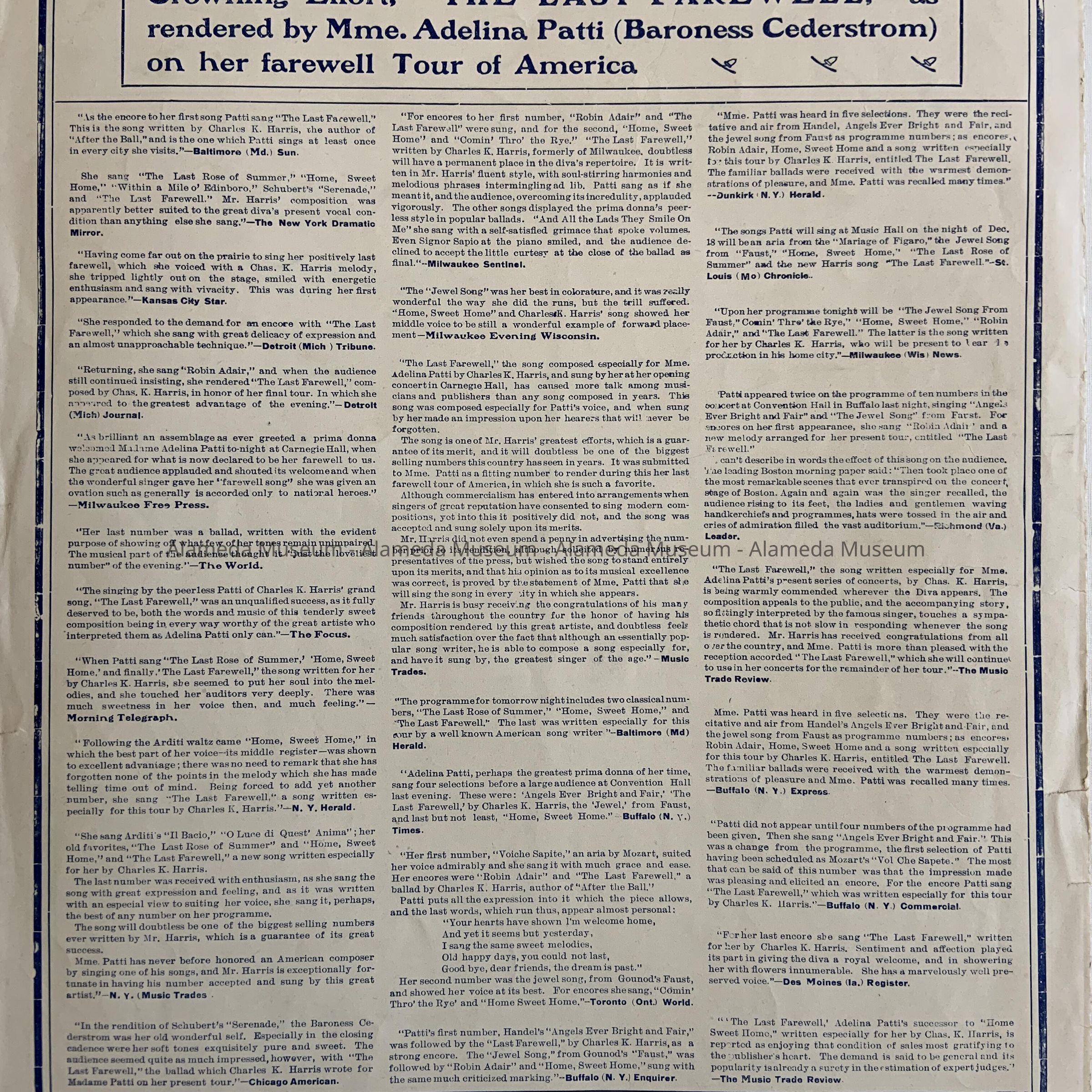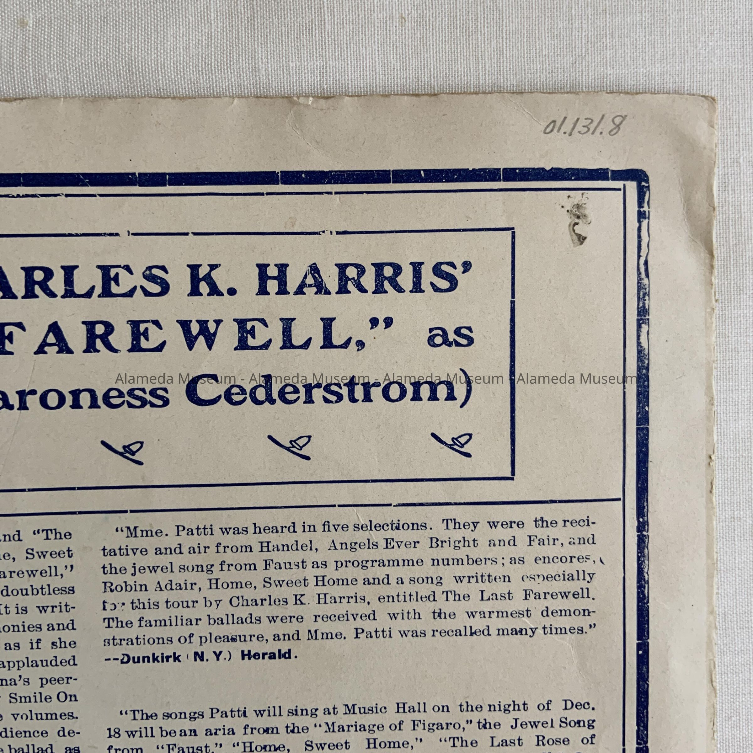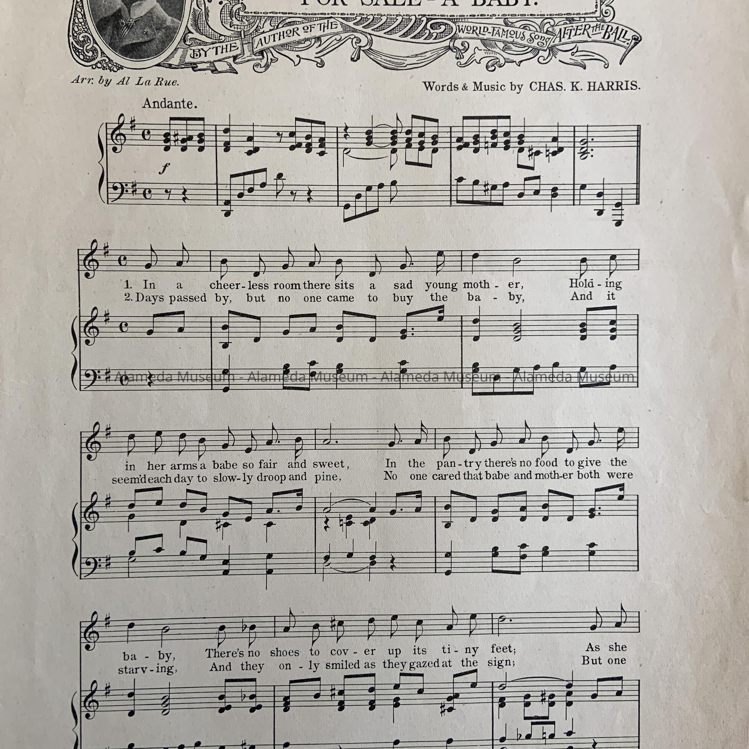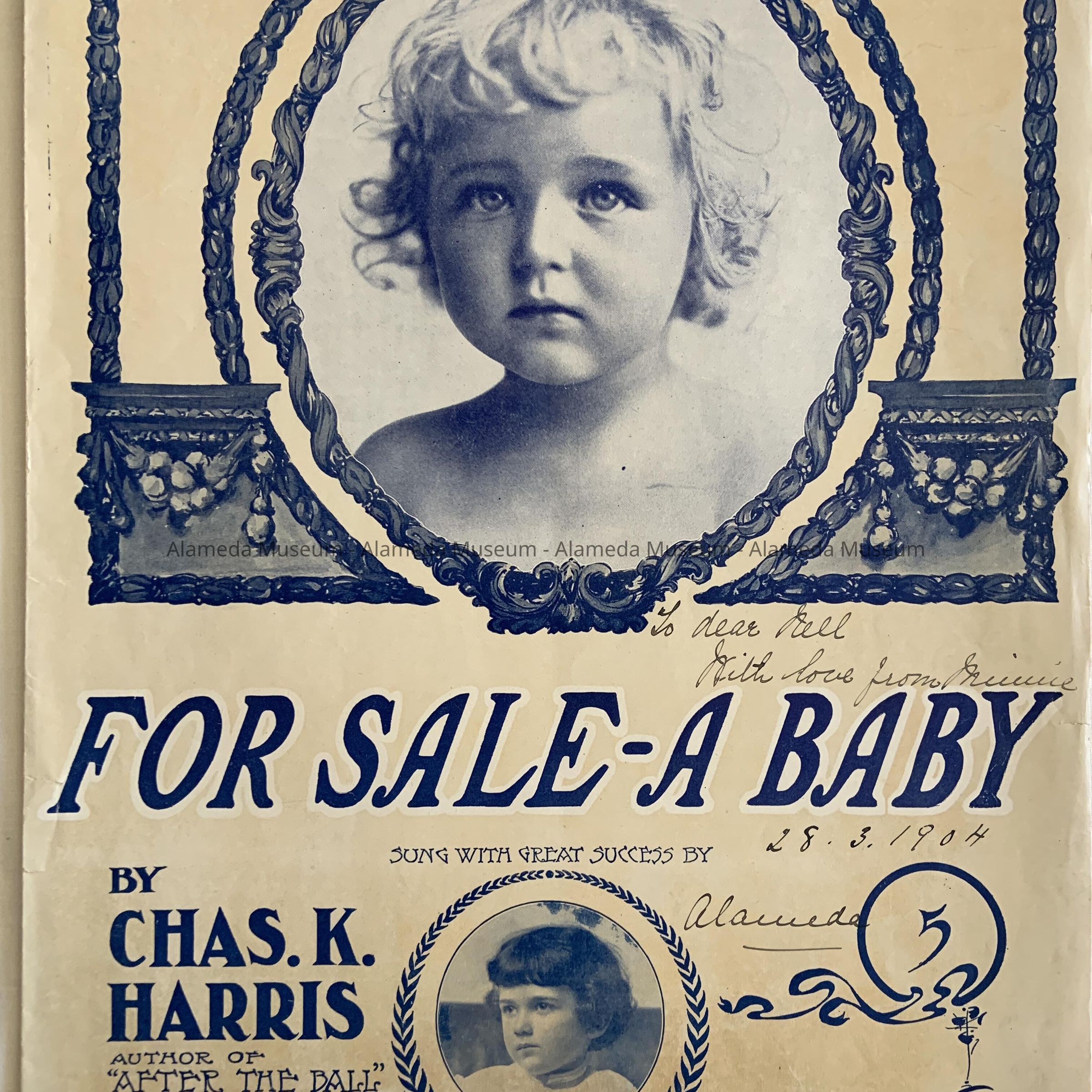 History: Music sheet titled, “For Sale, A Baby”, given to Nell Nomens, resident of Alameda, from a friend, March 28, 1904.