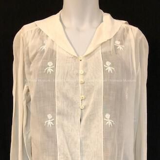 Very fine short waist white cotton fabric blouse with sailor collar, full length sleeves with mock buttons that snap. Secured in front by 6 pearl buttons. Has embroidered flowers on the bodice and repeated on sleeves.