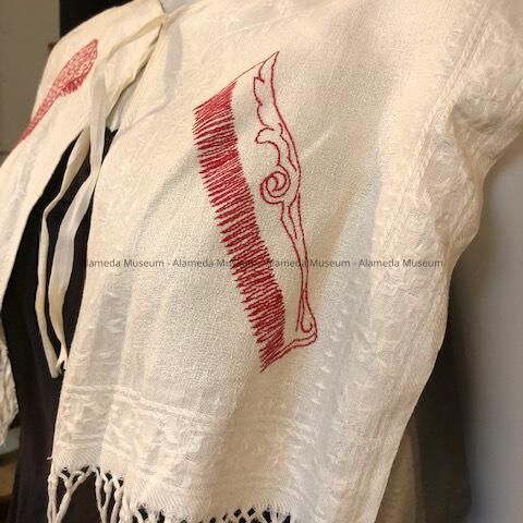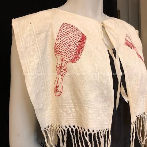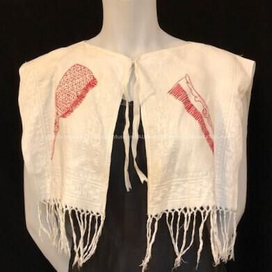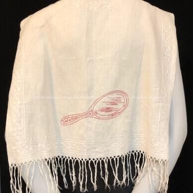 WHITE LINEN, DAMASK SHOULDER DUSTER, WITH DESIGNS OF HAND MIRROR, COMB, AND BRUSH EMBROIDERED IN RED-COLORED THREAD. DUSTER IS SECURED AT NECK BY WHITE LINEN TIE. WARP OF FABRIC USED FOR CREATING FRINGE AT BASE OF DUSTER. SHOULDER DUSTER THROWN OVER ONE'S SHOULDERS WHILE STYLING HAIR.