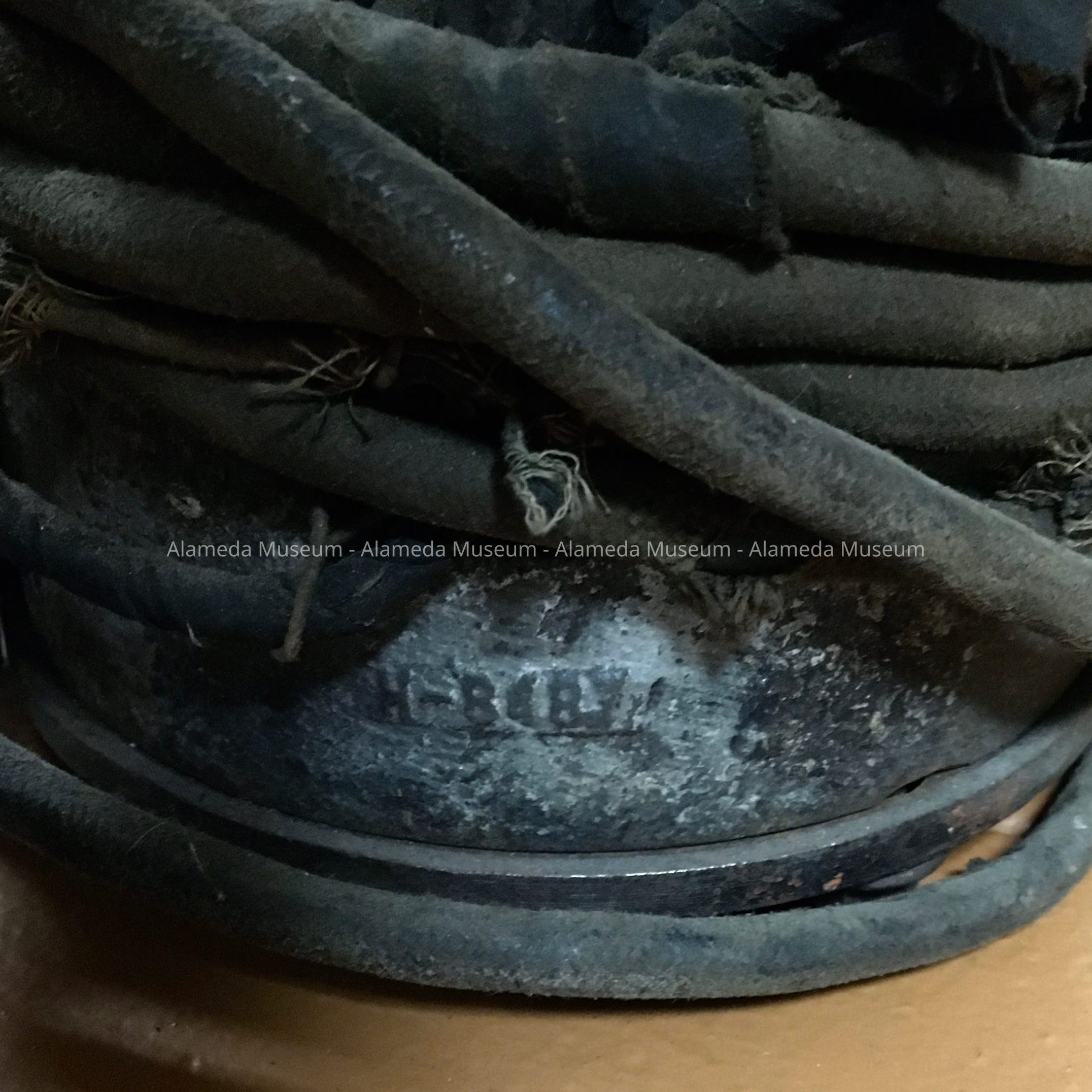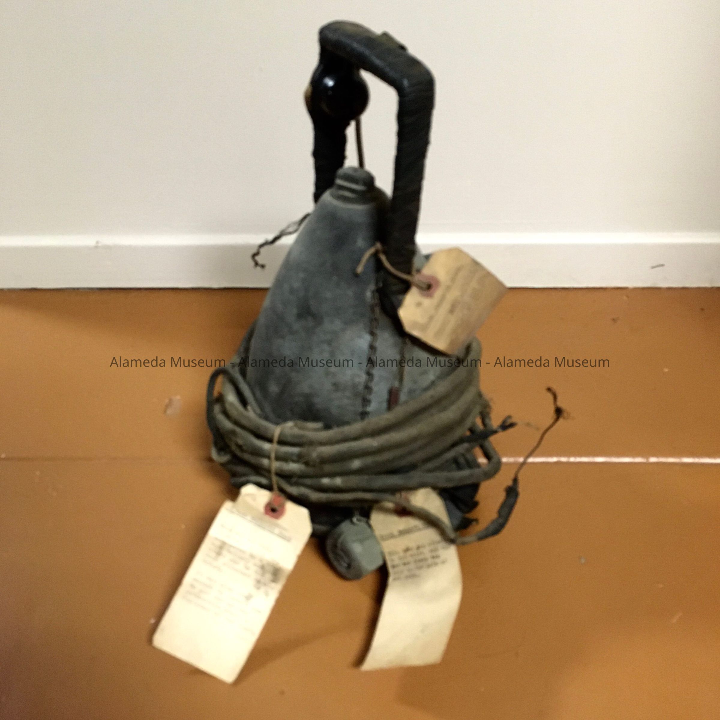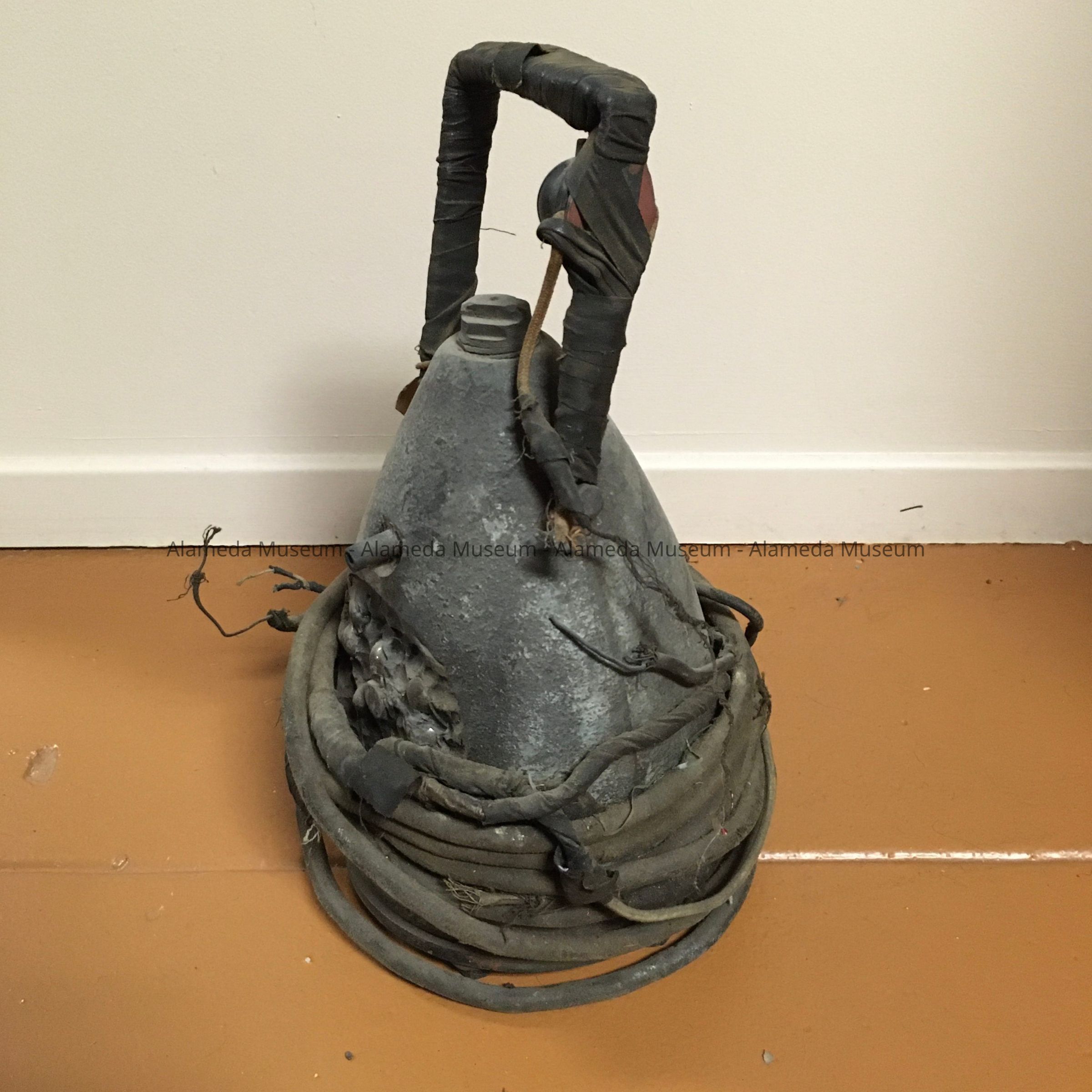 Description: A heavy bell or cone shaped metal object with flat bottom attached with 6 bolts, and a handle, with cables attached, and a chain with heavy metal nut filled with small pieces of metal. Appears to be home-grown, created from a warhead or similar shaped metal object, which has raised characters H-8187. Three old tags with typed text are attached.