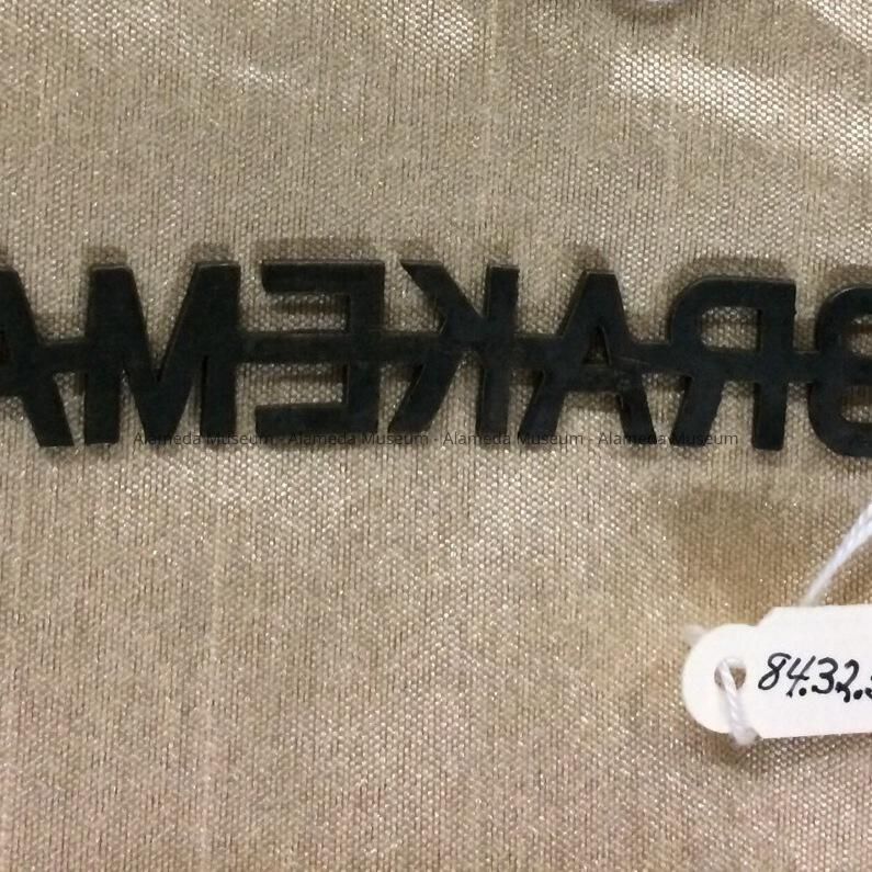 Insignia stating "Brakeman", from the uniform of Harry Hall, gateman, Southern Pacific Red Trains, Alameda, Ca. He was employed by the company for approximately 15 years, until his death at an early age. He was the son of Edward S. & Bertha Hall, old time residents of the East End, and brother of the late Grace Hall Smith.