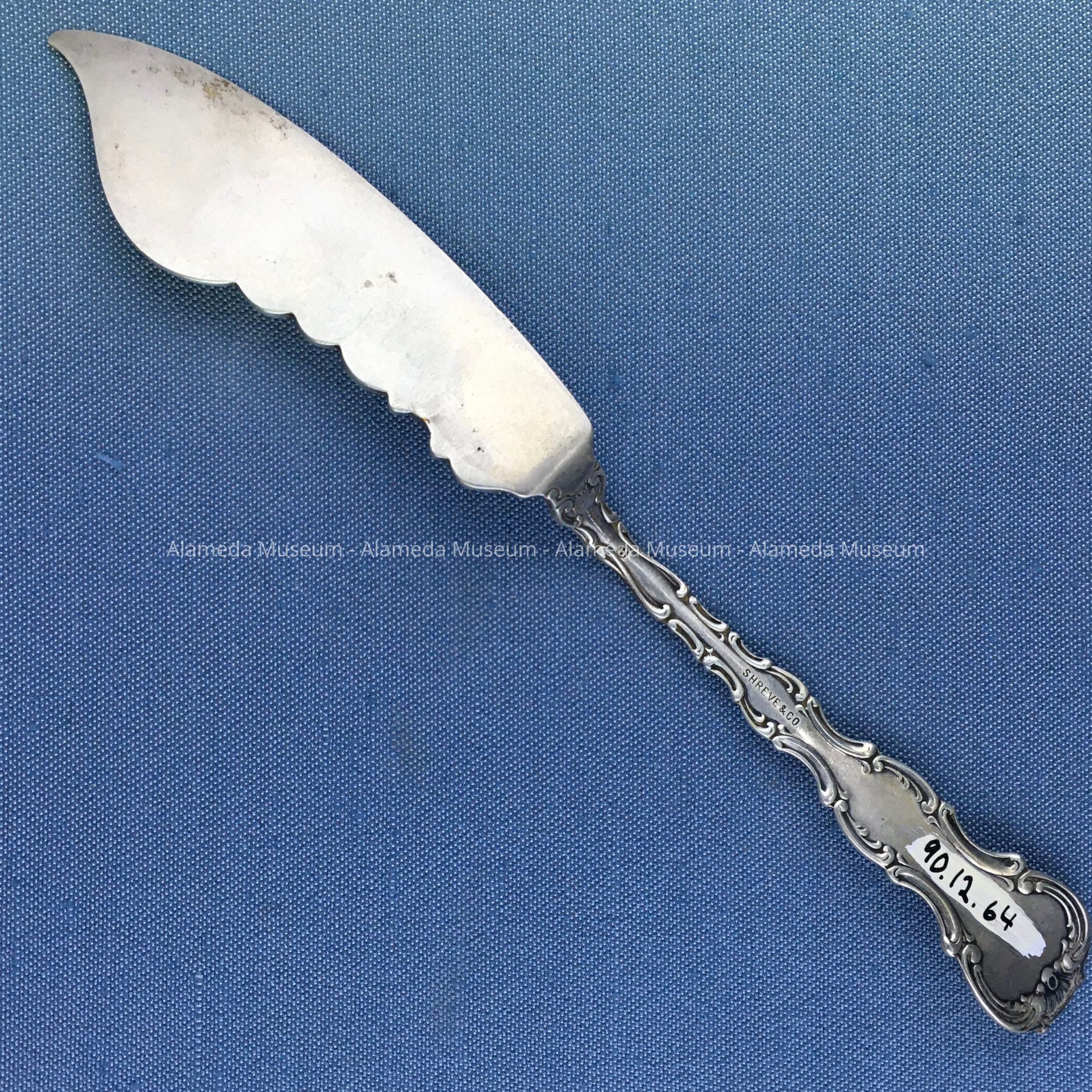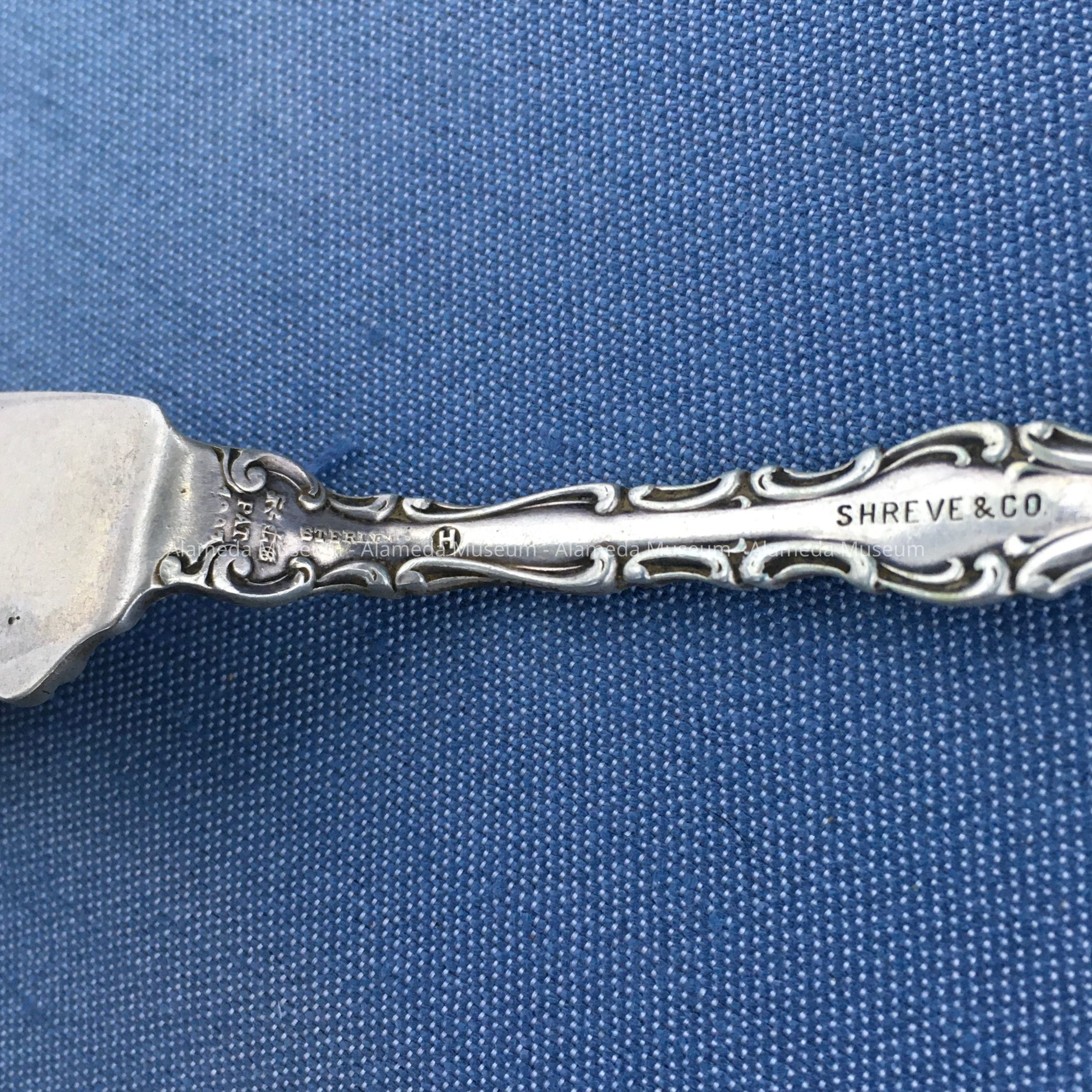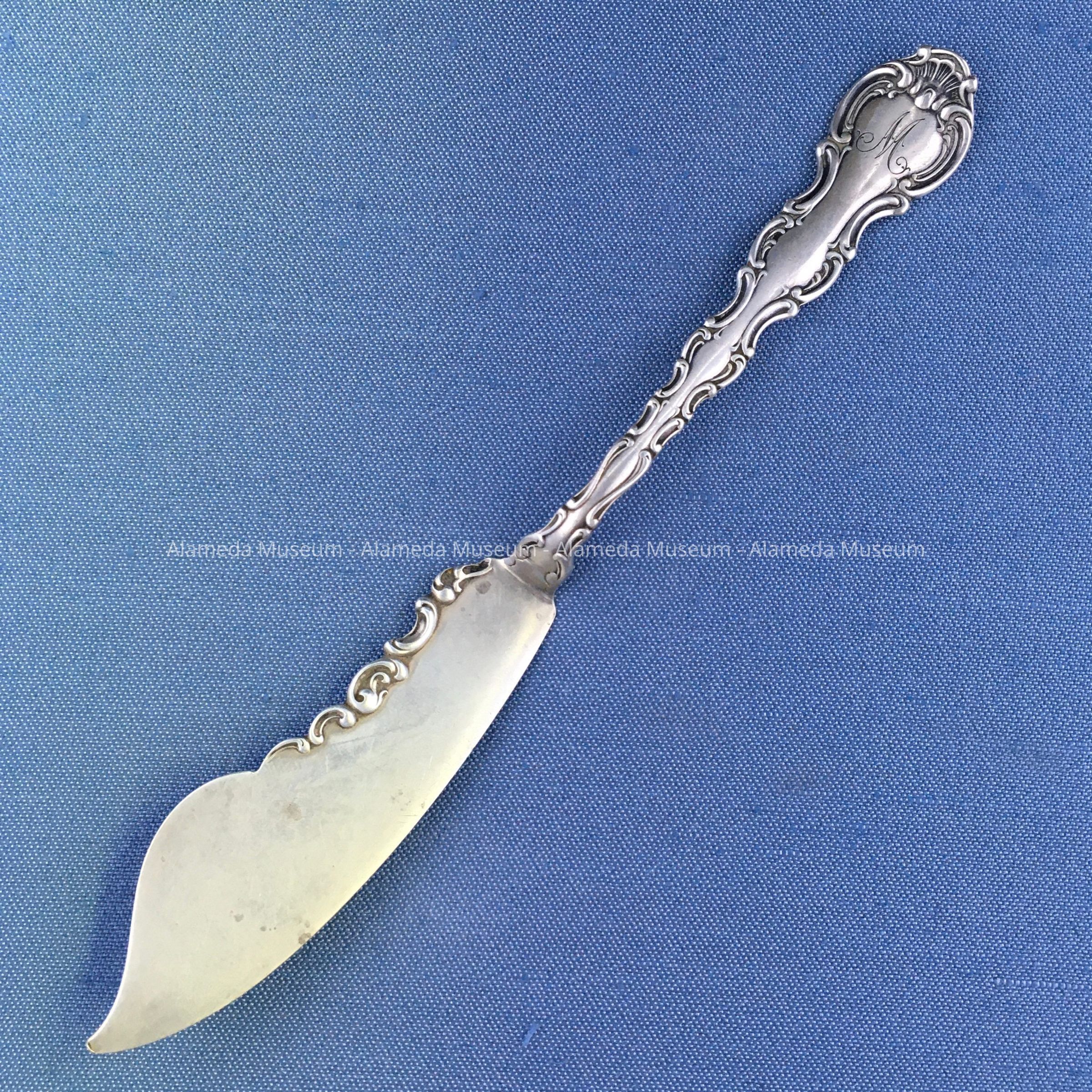 Butter knife with decorative designs in repossee, engraved initial “M," and marked "Shreve & Co.," "Sterling."