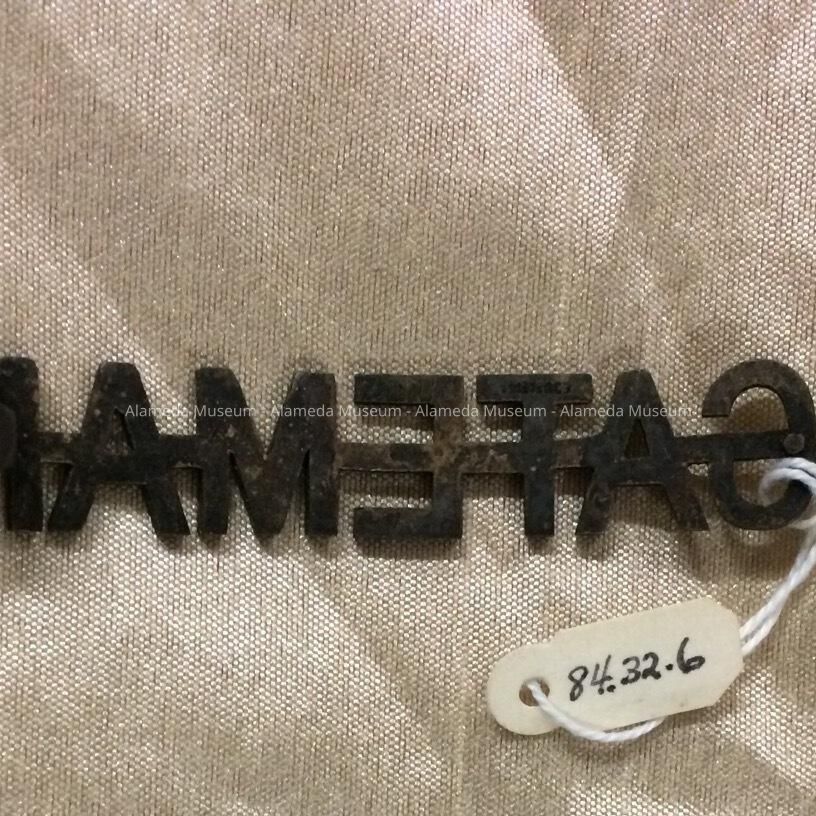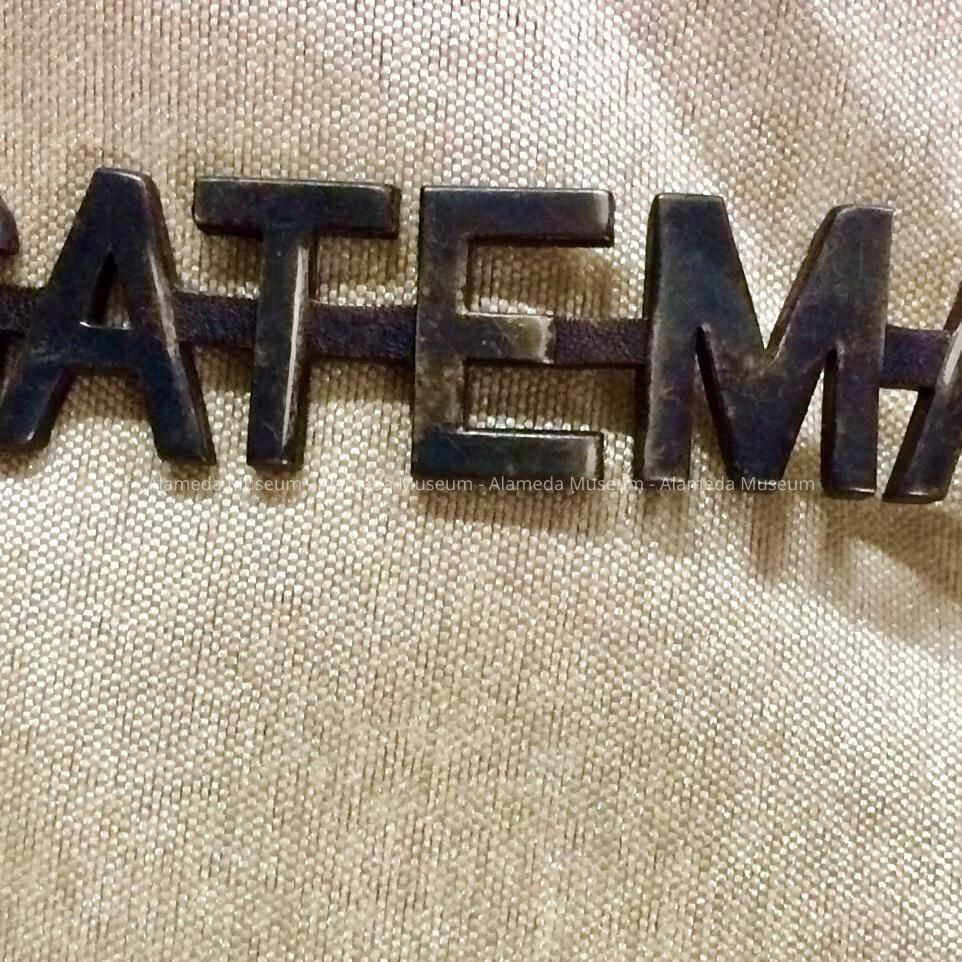 Insignia stating "Gateman", from the uniform of Harry Hall, gateman, Southern Pacific Red Trains, Alameda, Ca. He was employed by the company for approximately 15 years, until his death at an early age. He was the son of Edward S. & Bertha Hall, old time residents of the East End, and brother of the late Grace Hall Smith.