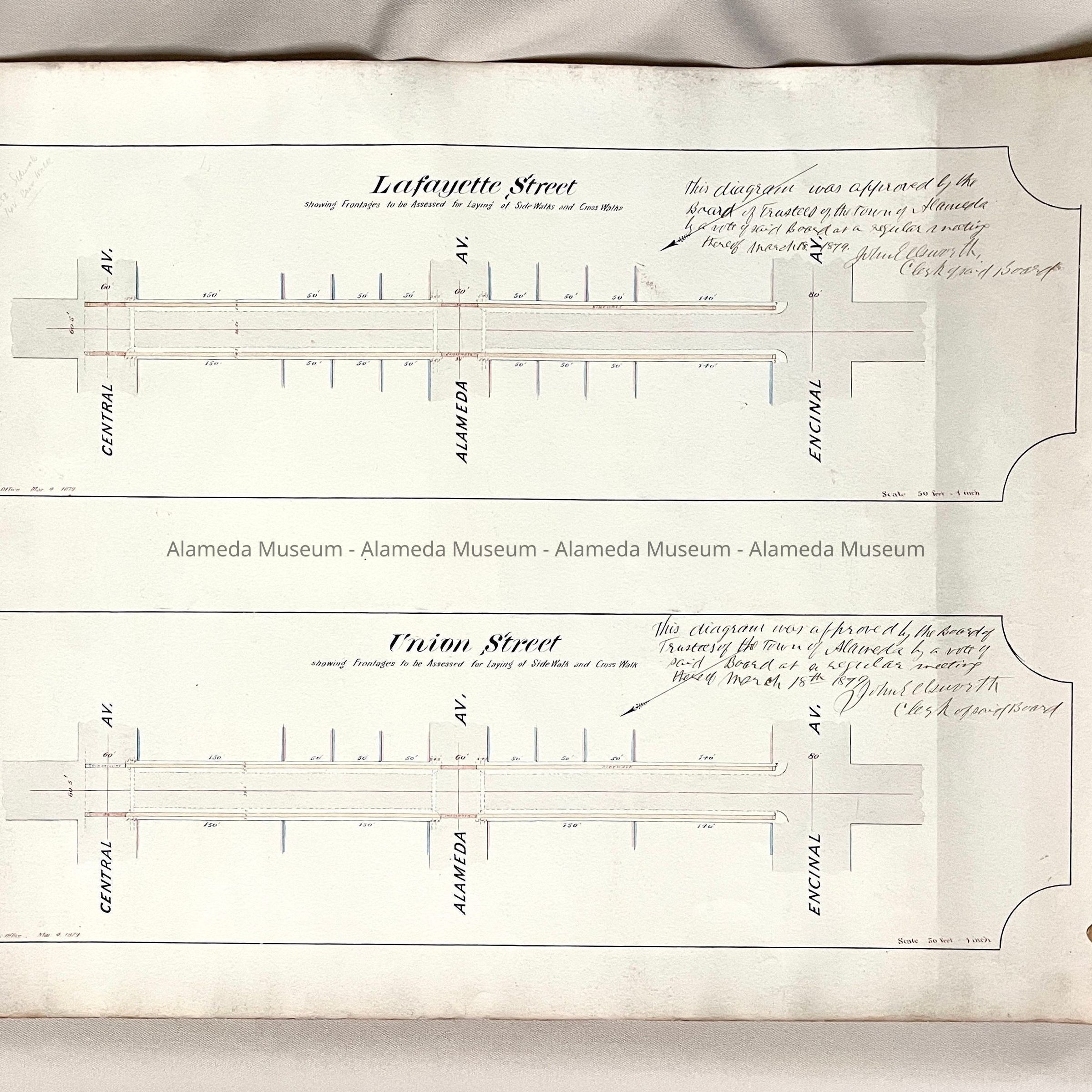 A DRAWN DIAGRAM OF SIDEWALK AND CROSSWALK PROJECTS TO BE LOCATED ON LAFAYETTE STREET BETWEEN ENCINAL AND CENTRAL AVENUES. HANDWRITTEN NOTE STATES, "THIS DIAGRAM WAS APPROVED BY THE BOARD OF TRUSTEES OF THE TOWN OF ALAMEDA BY A VOTE OF THE SAID BOARD AT A REGULAR MEETING HELD ON MARCH 18, 1879, AND SIGNED BY JOHN ELLSWORTH, CLERK OF SAID BOARD." BEFORE 1907, THE CITY OF ALAMEDA WAS GOVERNED BY A BOARD OF TRUSTEES. MR. ELLSWORTH WOULD LATER BECOME A CITY JUDGE.