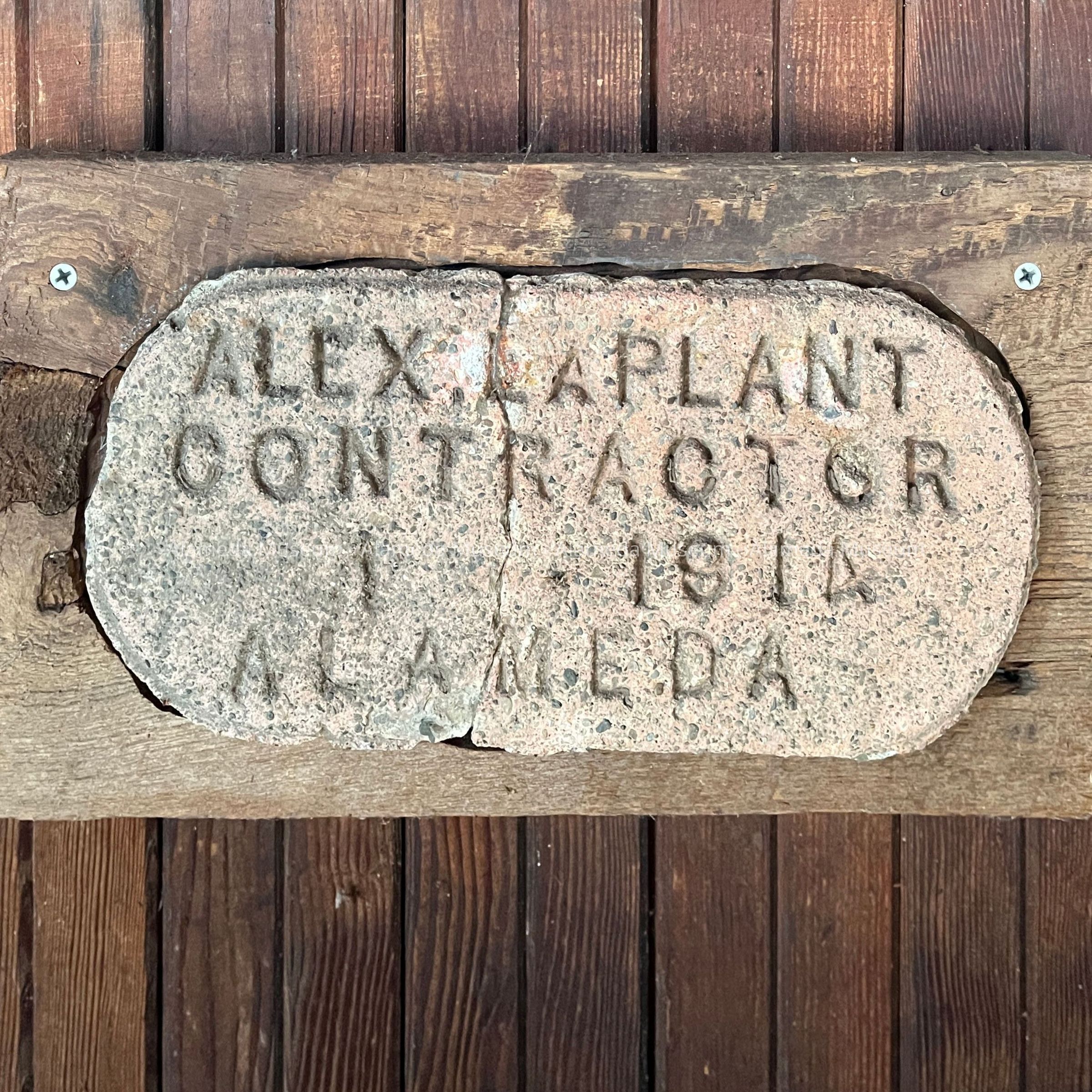 HISTORY OF OBJECT: A SIDEWALK I.D. REMNANT STATING, "ALEX LA PLANT, CONTRACTOR, 1914, ALAMEDA," IN RECOVERED FORM. CAME FROM THE DRIVEWAY OF A SIDEWALK AT 1040 FAIR OAKS AVE, ADDRESS OF THE DONOR SINCE 1958.
