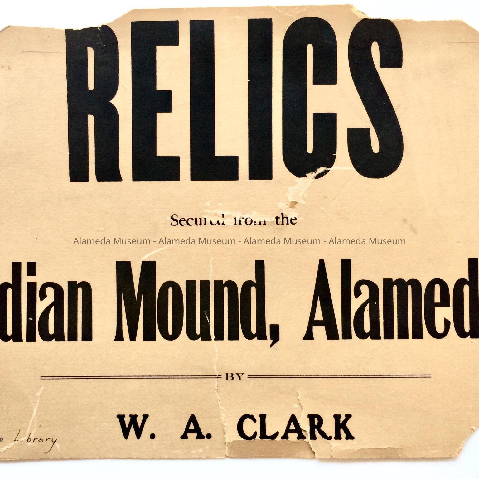 History: Original sign that was placed near the Indian Artifacts excavated under the direction of W.A. Clark in 1908 and displayed in the Alameda Free Library.