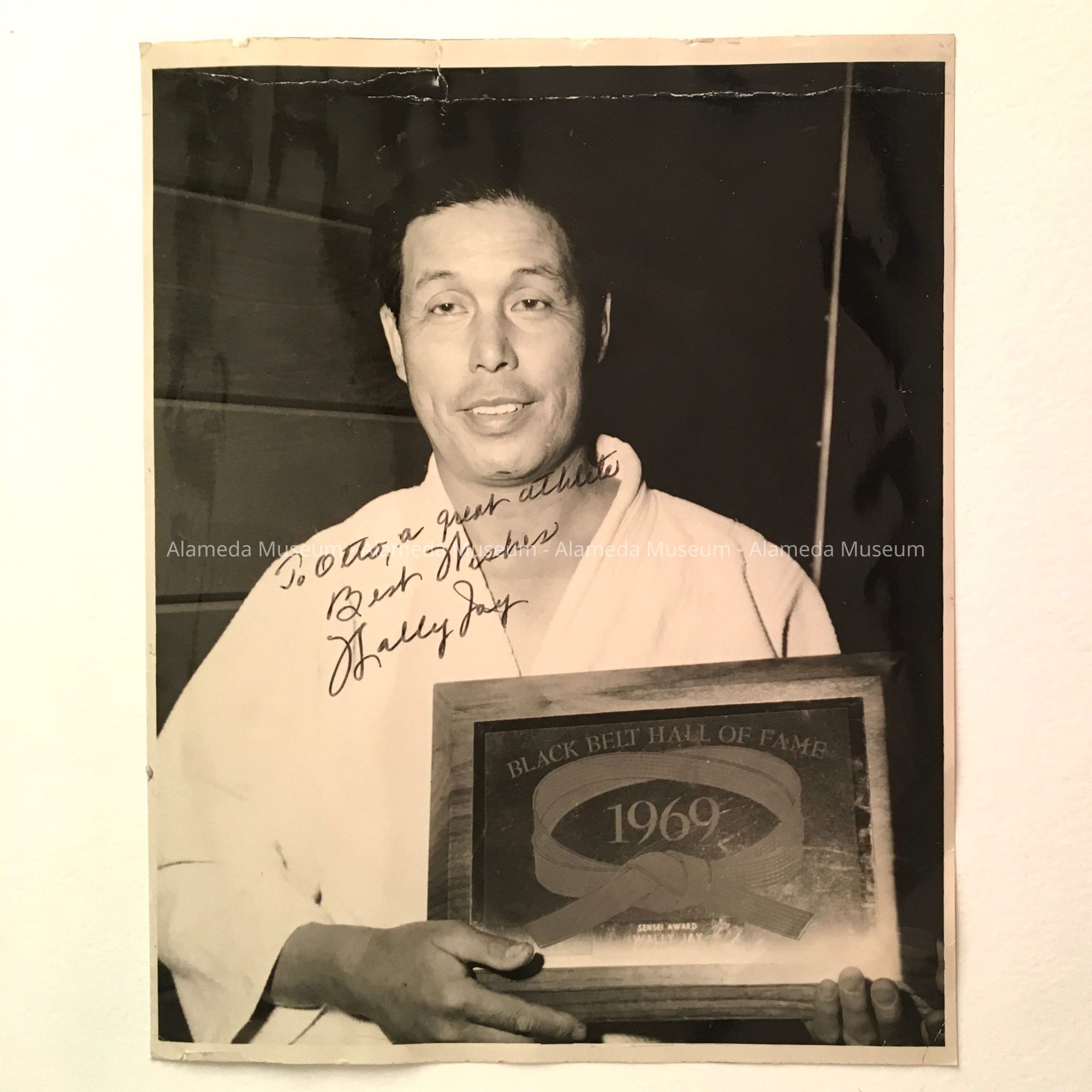 Description: Photograph of a man in white martial arts costume, holding a framed award certificate stating: 'Black Belt Hall of Fame 1969 / Sensei Award / Wally Jay'. Dedicated and signed on the front: 'To Otto, a great athlete / Best Wishes / Wally Jay'