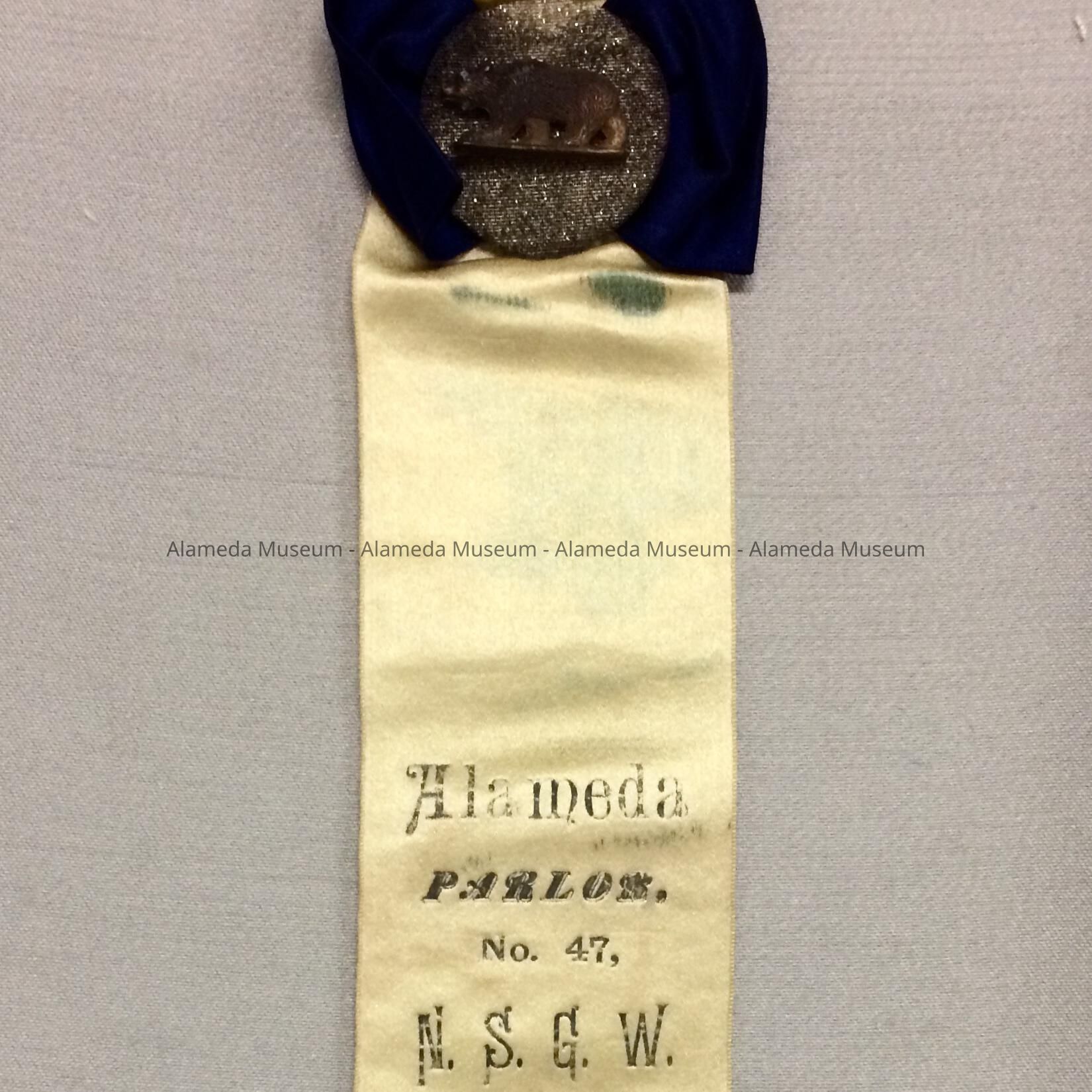 Silk banner badge, Alameda Parlor No. 47, Native Sons of the Golden West, c. 1980Entry/Object ID