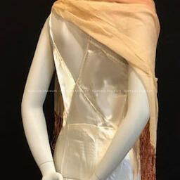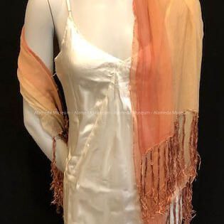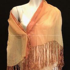 Description: Oblong silk chiffon scarf in graduated colors of terra cotta to ecru. Silk fringe edging.