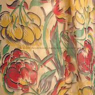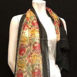 Silk chiffon scarf, rectangular shaped, with central panel of multicolored stylized flowers, bordered in black.