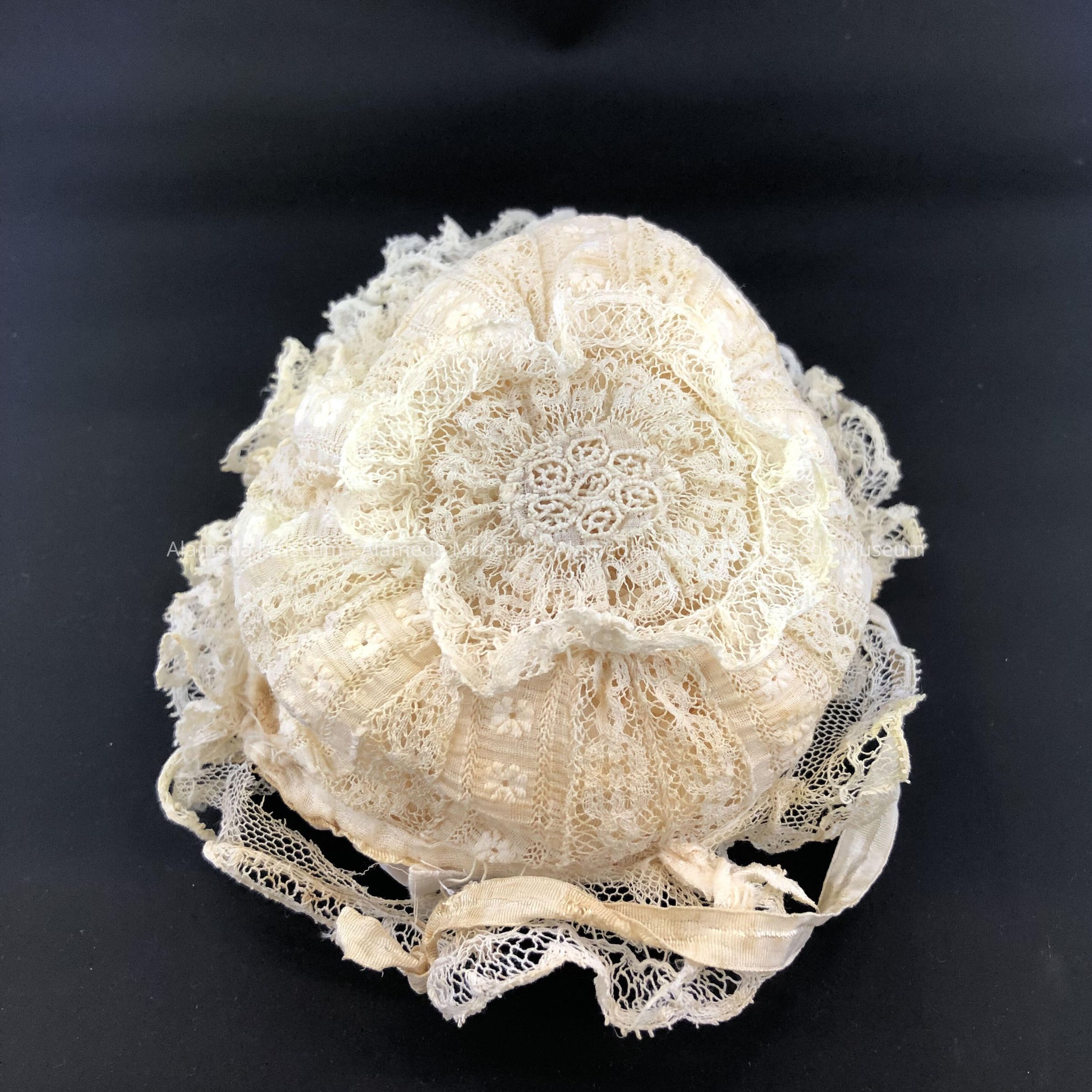 OFF-WHITE-COLORED BABY BONNET OF MACHINED LACE. BONNET IS EDGED IN RUFFLED MACHINED LACE, ACCENTUATED WITH OFF-WHITE SILK RIBBON. INTERIOR IS LINED WITH OFF-WHITE SILK. BONNET APPEARS TO HAVE BEEN HANDSEWN.
