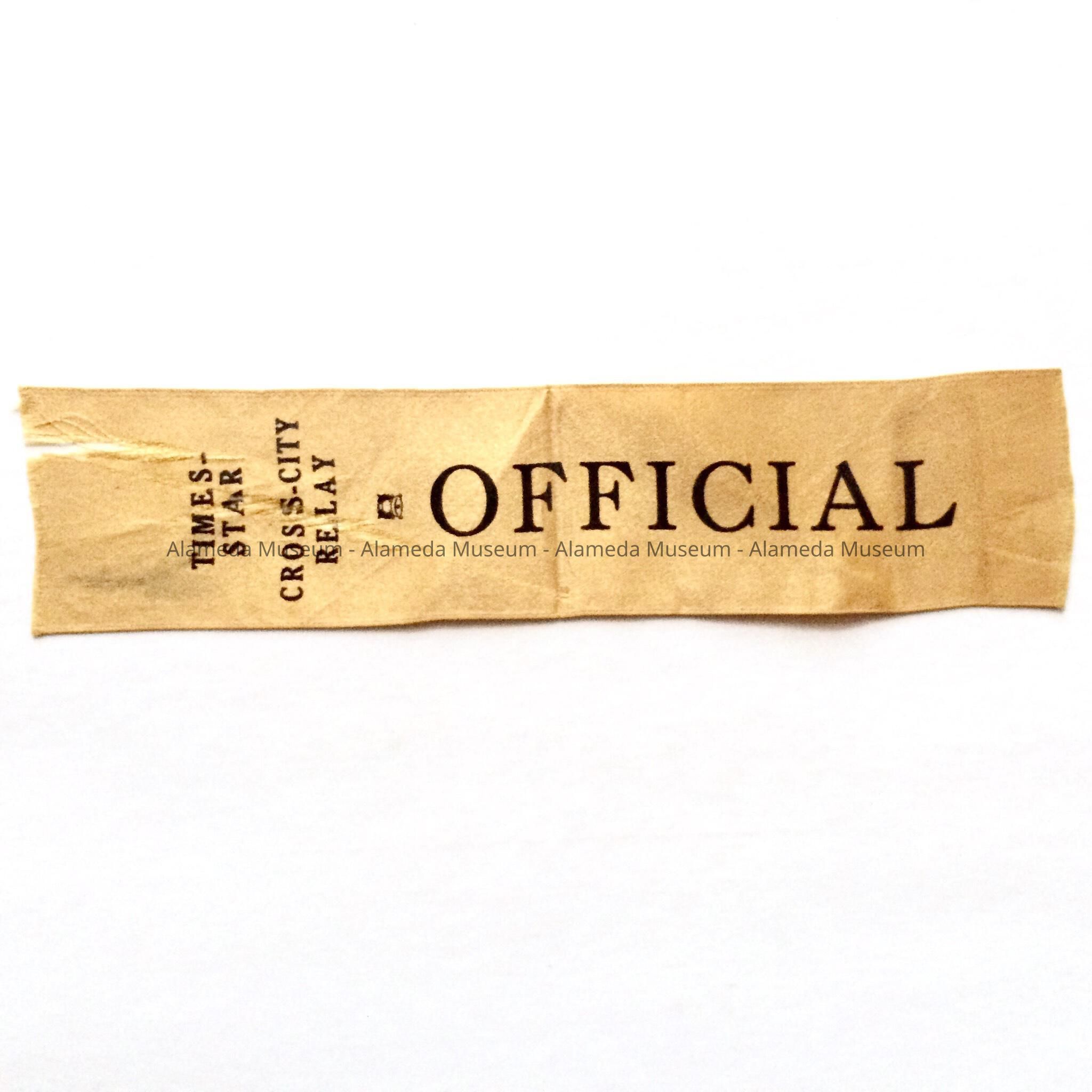 A RIBBON WORN BY THE LATE JACK HANLY, FOR THE CROSS-CITY RELAY RACE SPONSORED BY THE ALAMEDA TIMES STAR NEWSPAPER.