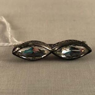 Description: Brooch consisting of sterling-silver frame with oblong shaped faceted clear glass.