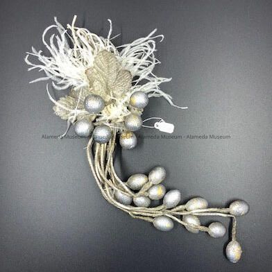 Description: Trim off a hat or dress composed of white ostrich feathers, silver leaves, and cascading silver oblong balls covered in black netting.