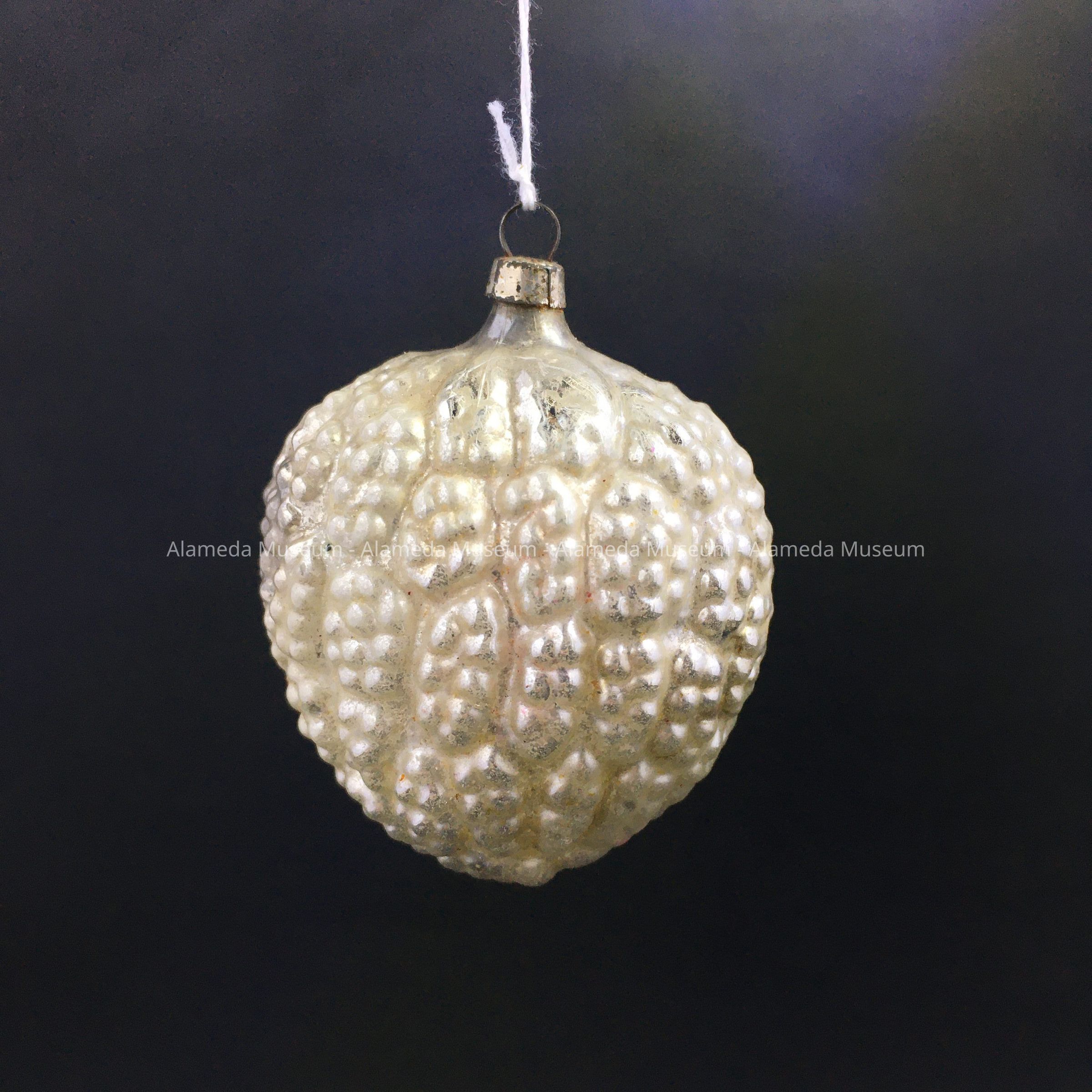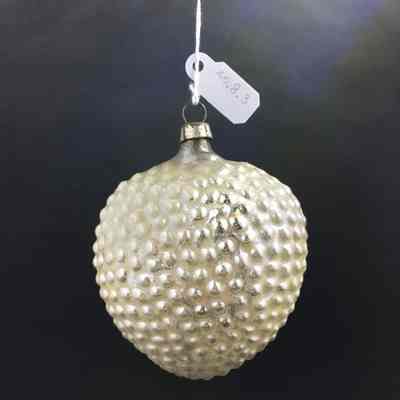 Description: Silver and ivory glass ornament, shaped like a lychee fruit, but much larger. On one side scales have been formed, the other side only has indentations.