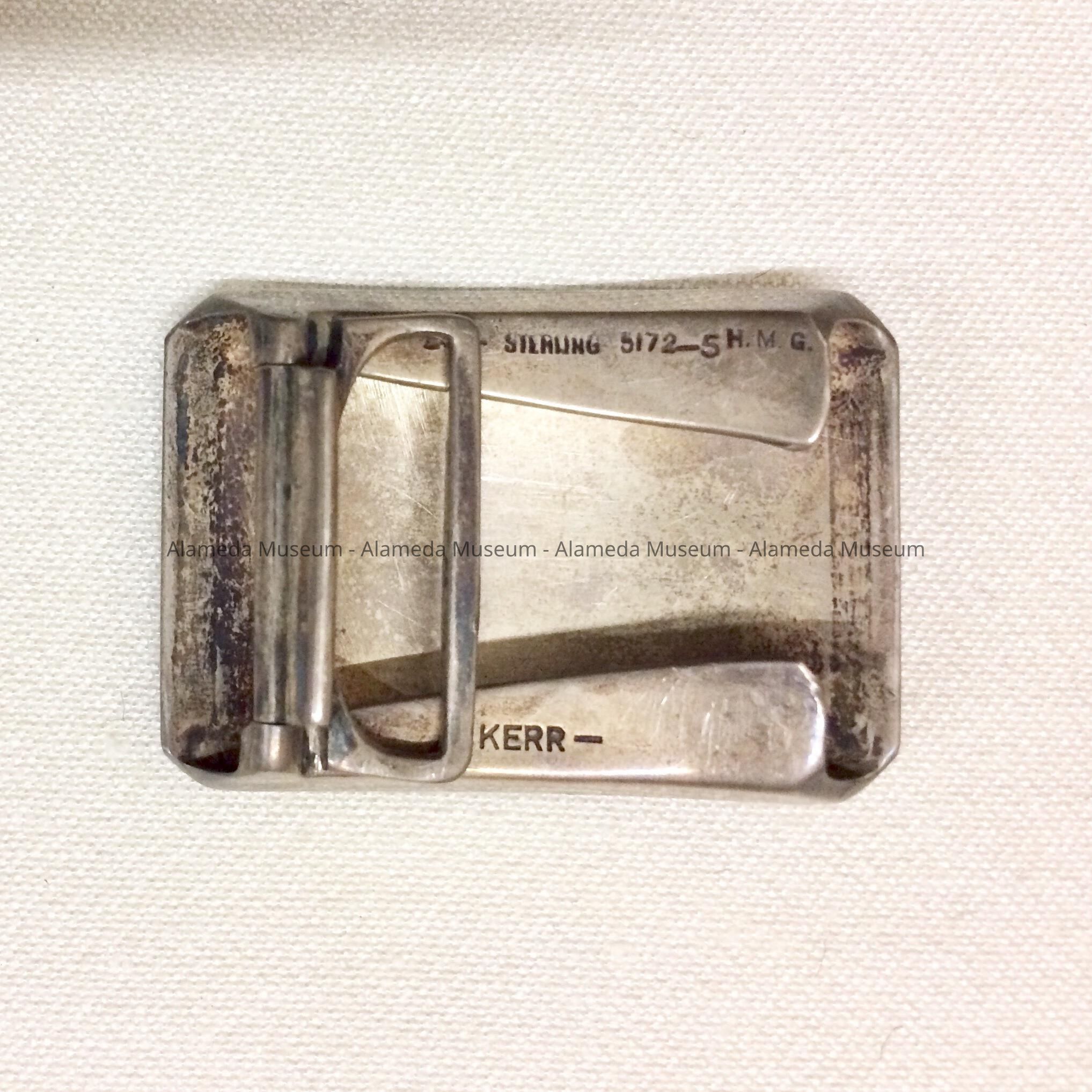 HISTORY OF OBJECT: BELT BUCKLE WORN BY THE LATE ROBERT AMES (1900-1982). MR. AMES WAS A RESIDENT OF 2146 SAN JOSE AVENUE, ALAMEDA FROM 1921 UNTIL 1982.