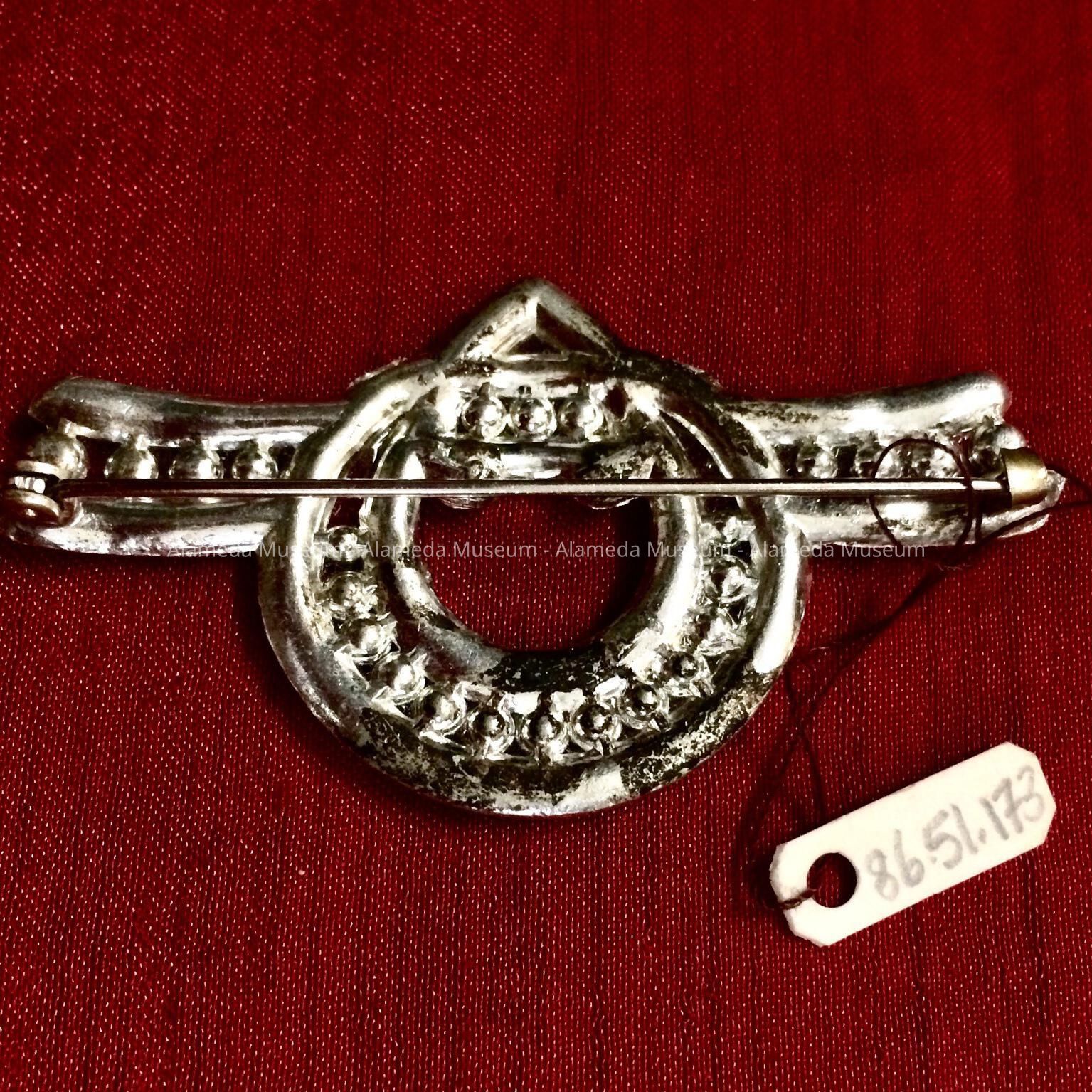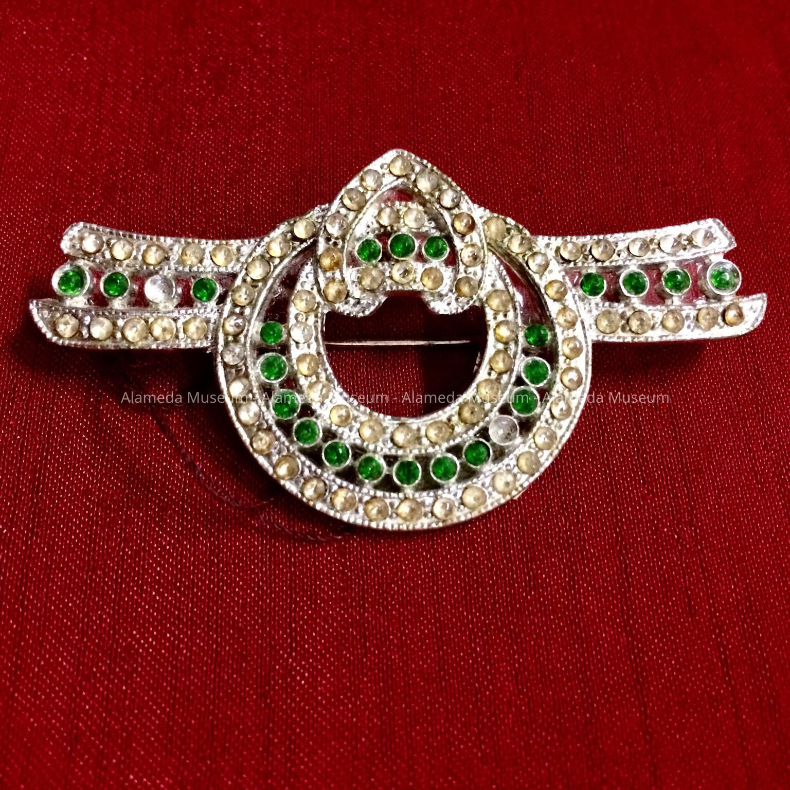 Silver plated brooch of a stylized ribbon with rhinestones and green glass, 1930Entry/Object ID
