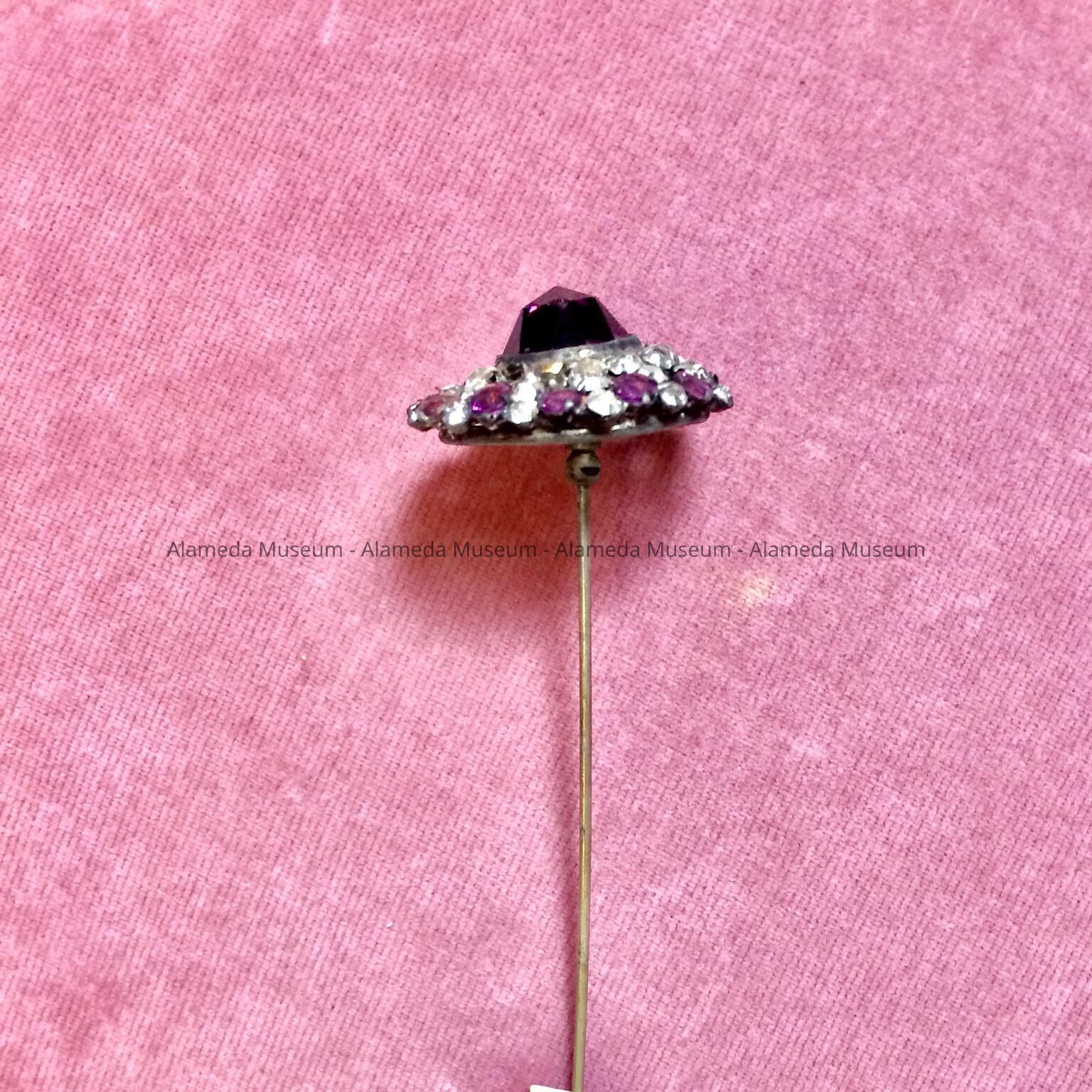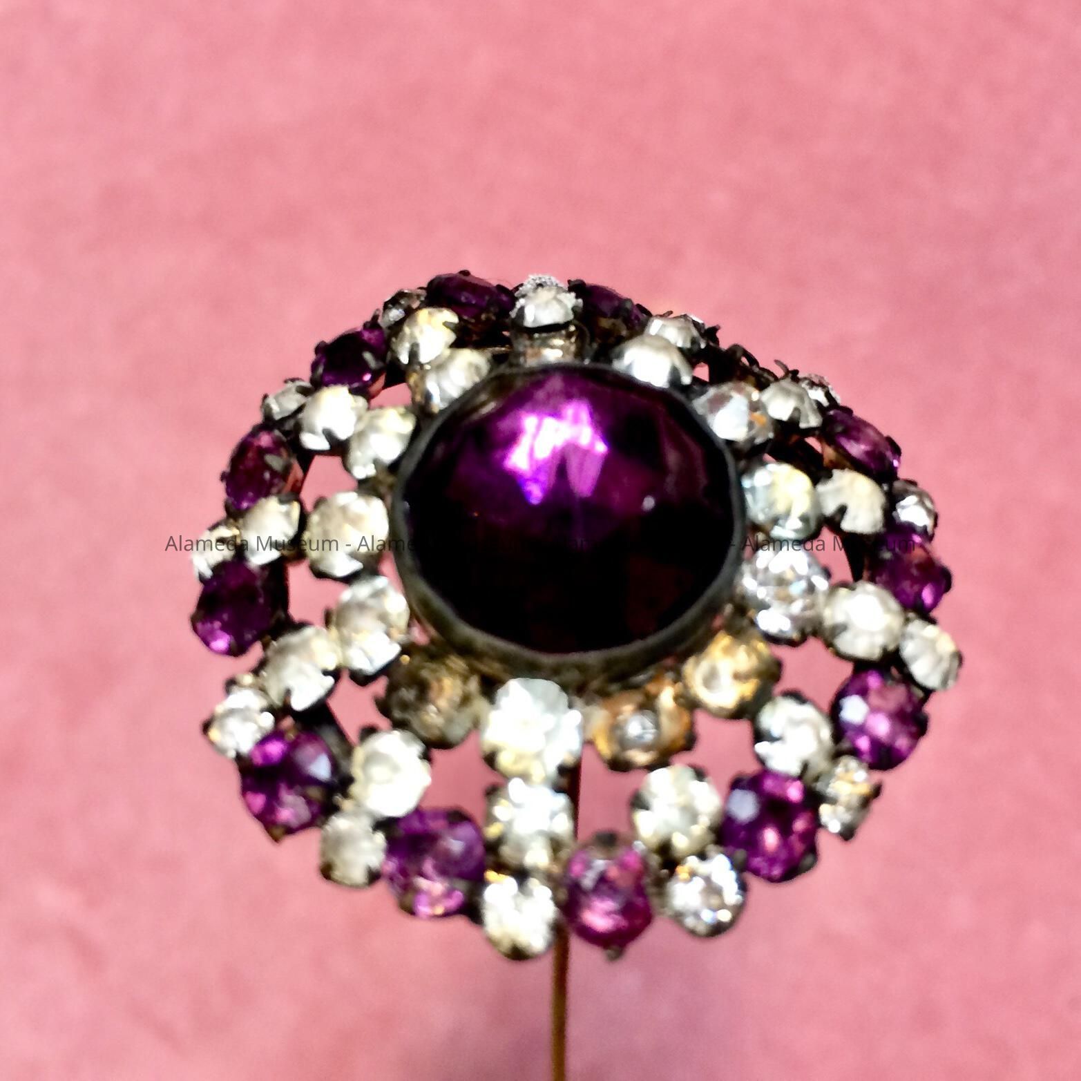 Silver plated hat pin with rhinestones and amethyst glass, c. 1908Entry/Object ID