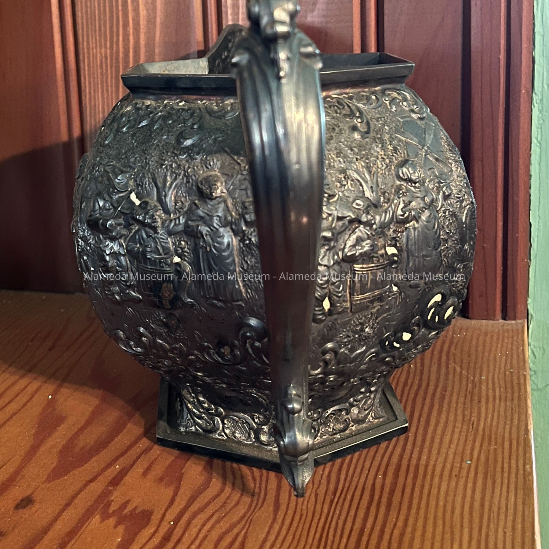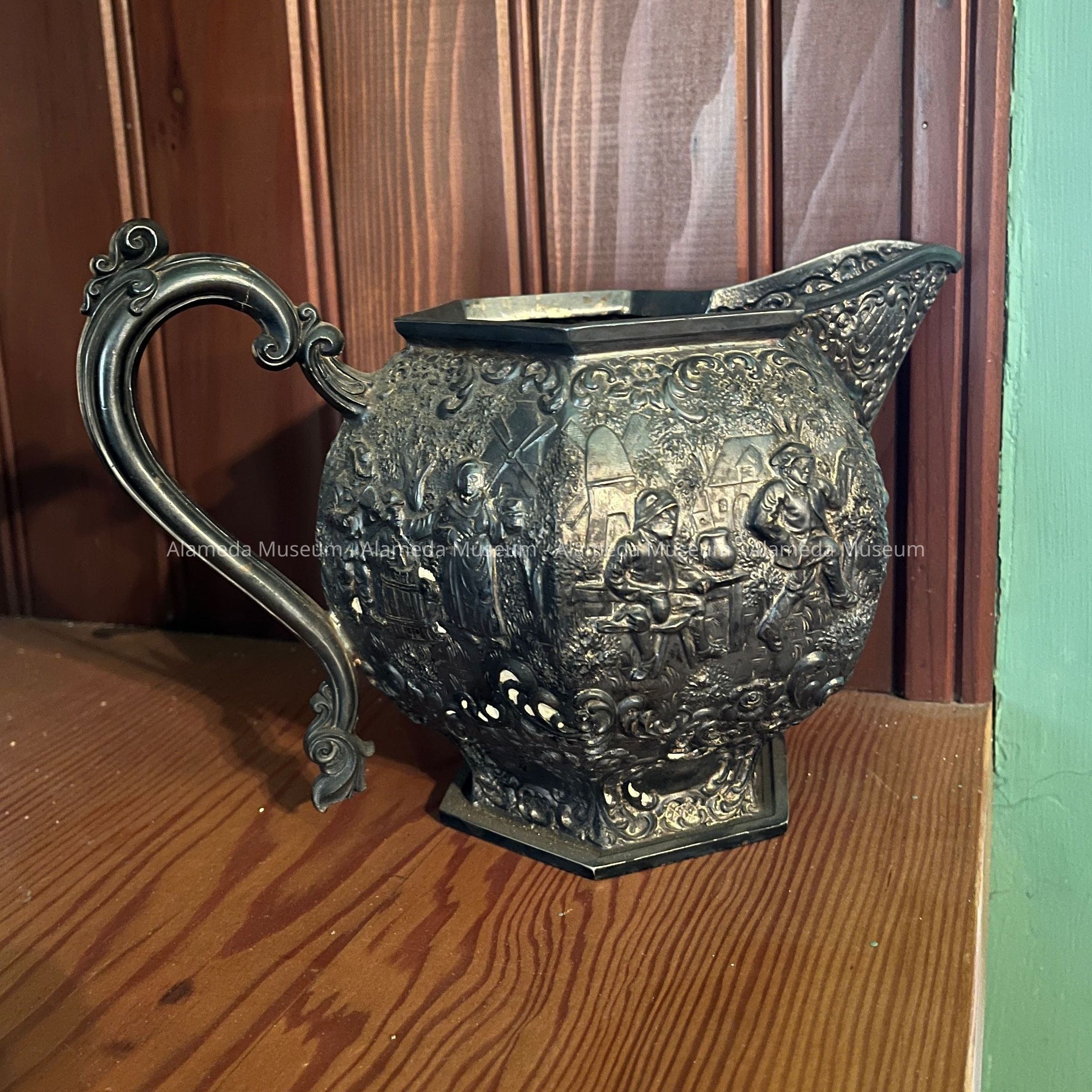 Silver plated pitcher with repousse of Dutch peasants, c. 1920sEntry/Object ID