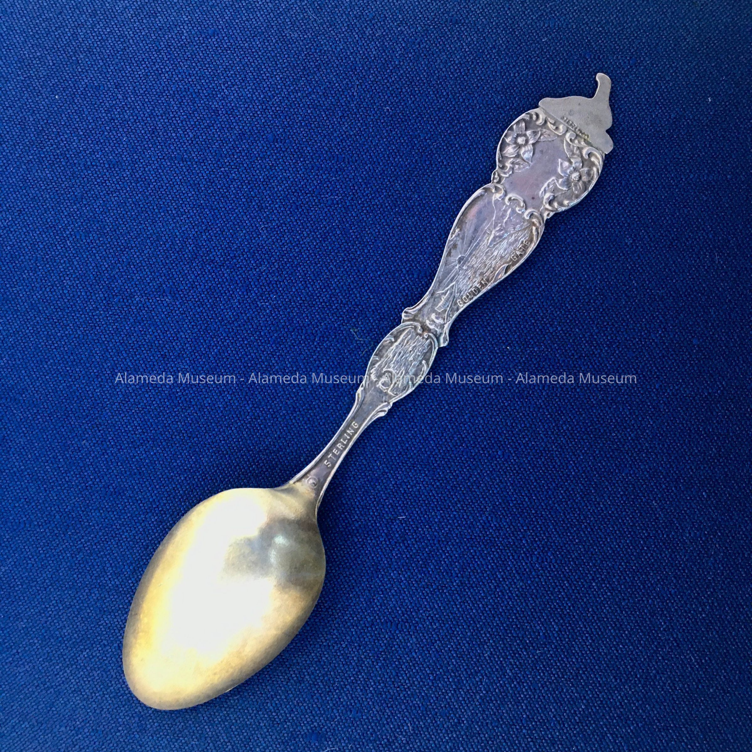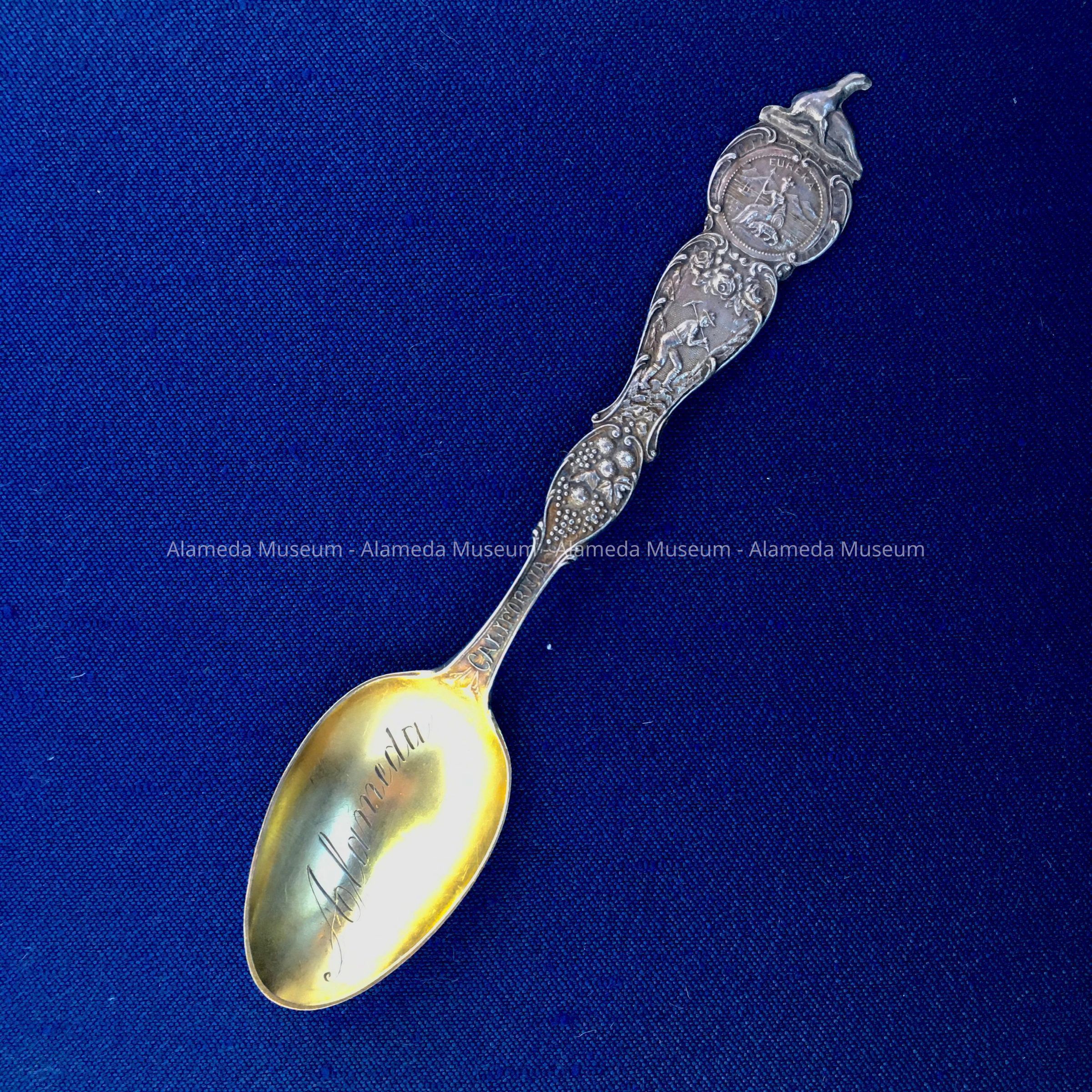 DESCRIPTION: A STERLING SILVER SOUVENIR SPOON WITH DECORATIVE HANDLE. HANDLE IS IN REPOUSSE AND BEARS THE STATE SEAL: A MINER, FRUIT, REDWOOD TREE, POPPIES, AND A PANORAMIC VIEW OF THE GOLDEN GATE (PRIOR TO CONSTRUCTION OF THE GOLDEN GATE BRIDGE). BOWL OF SPOON IS GOLD-WASHED AND ENGRAVED, "ALAMEDA."