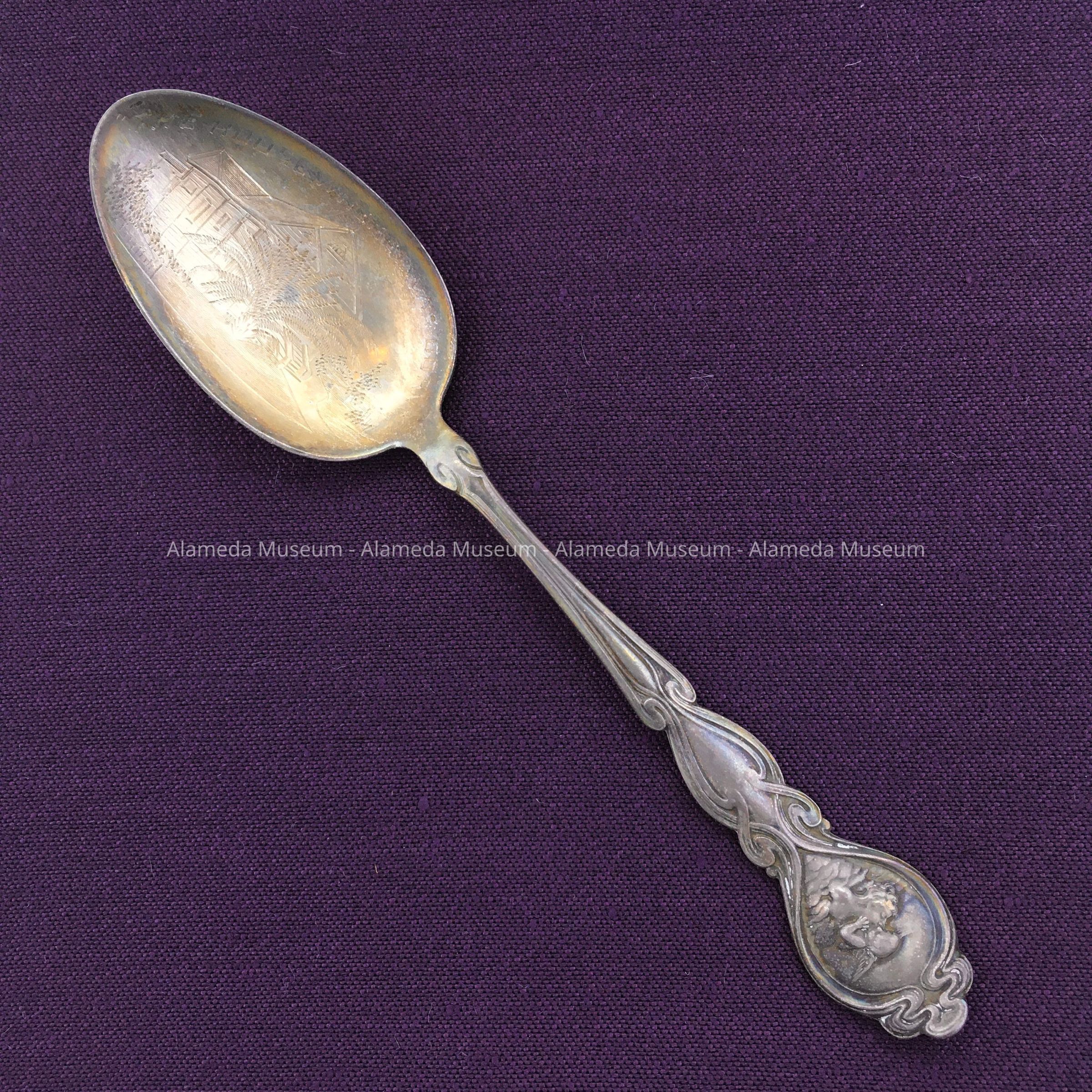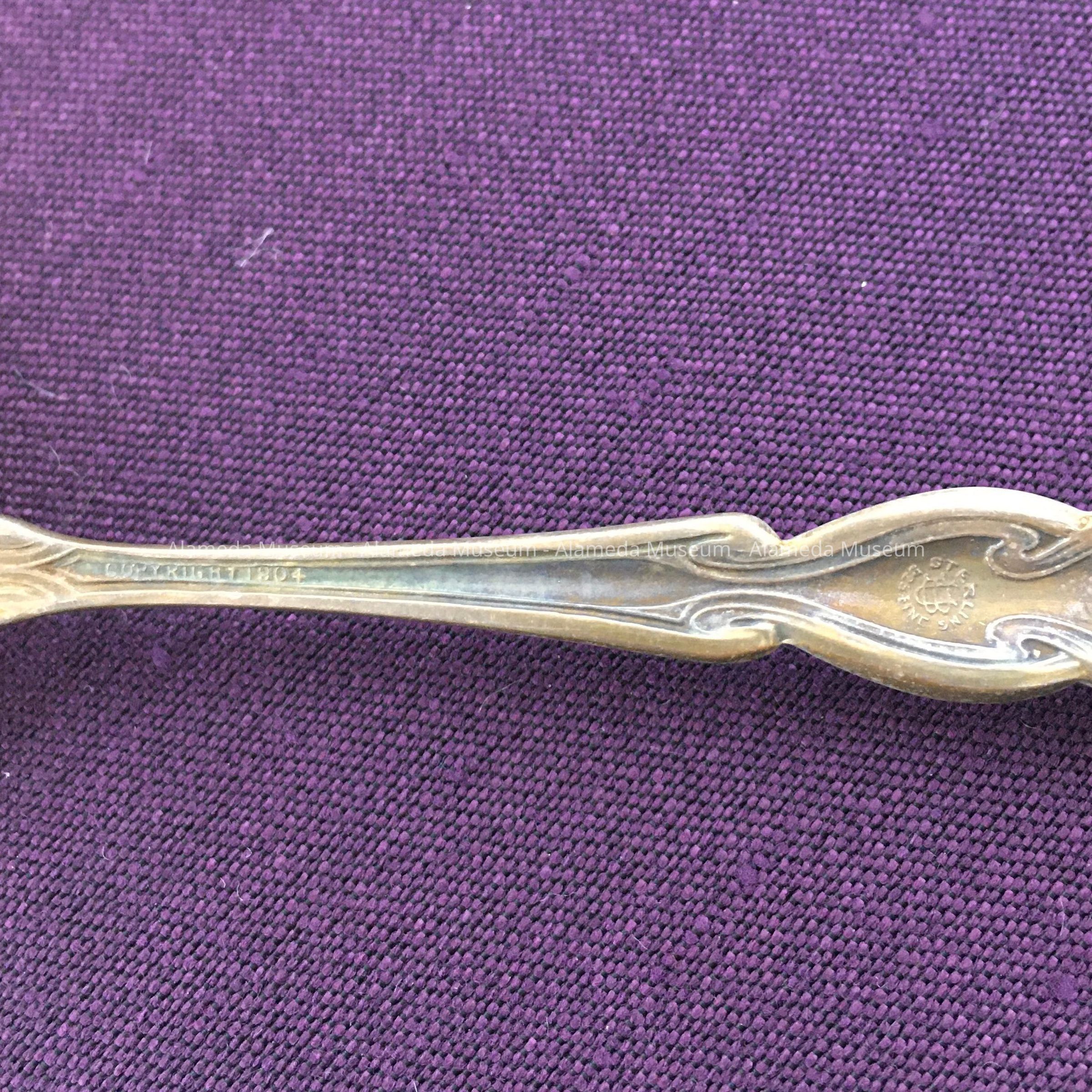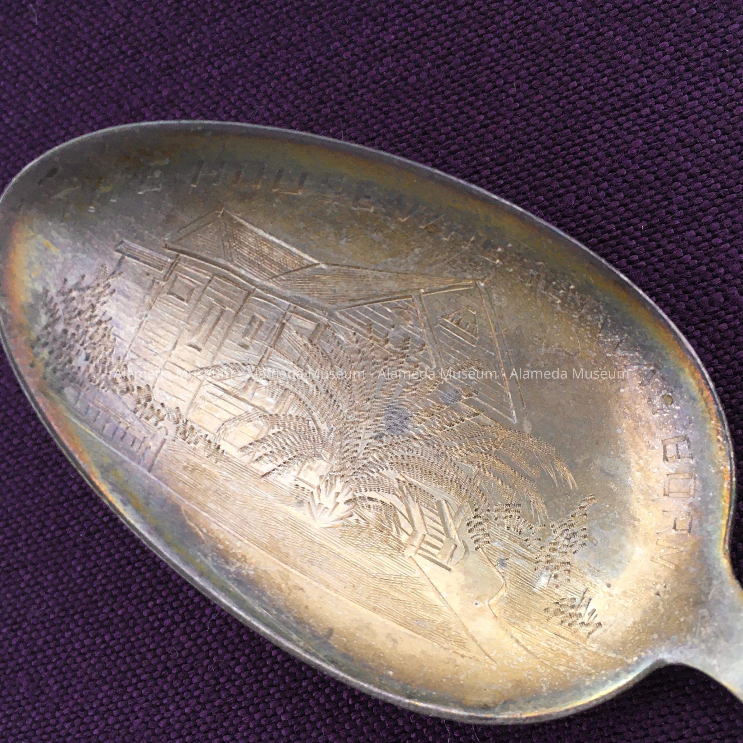 Souvenir spoon with engraved bowl depicting a Victorian style home (1409 Caroline Street) and the message "The House Where I Was Born." The donor’s parents rented the house following the earthquake & fire of 1906. It was here in 1907 that she was born. The spoon was possibly a gift commemorating the