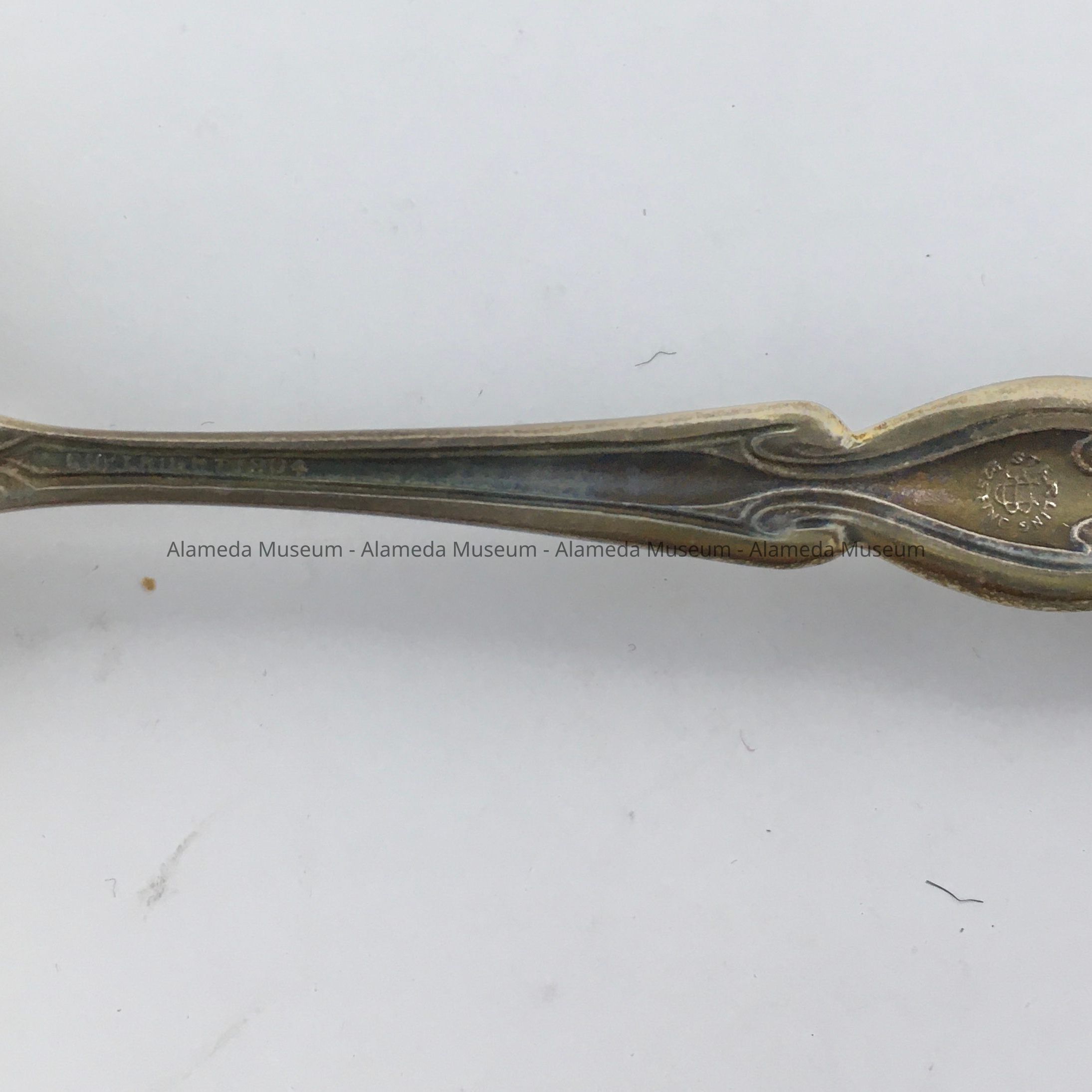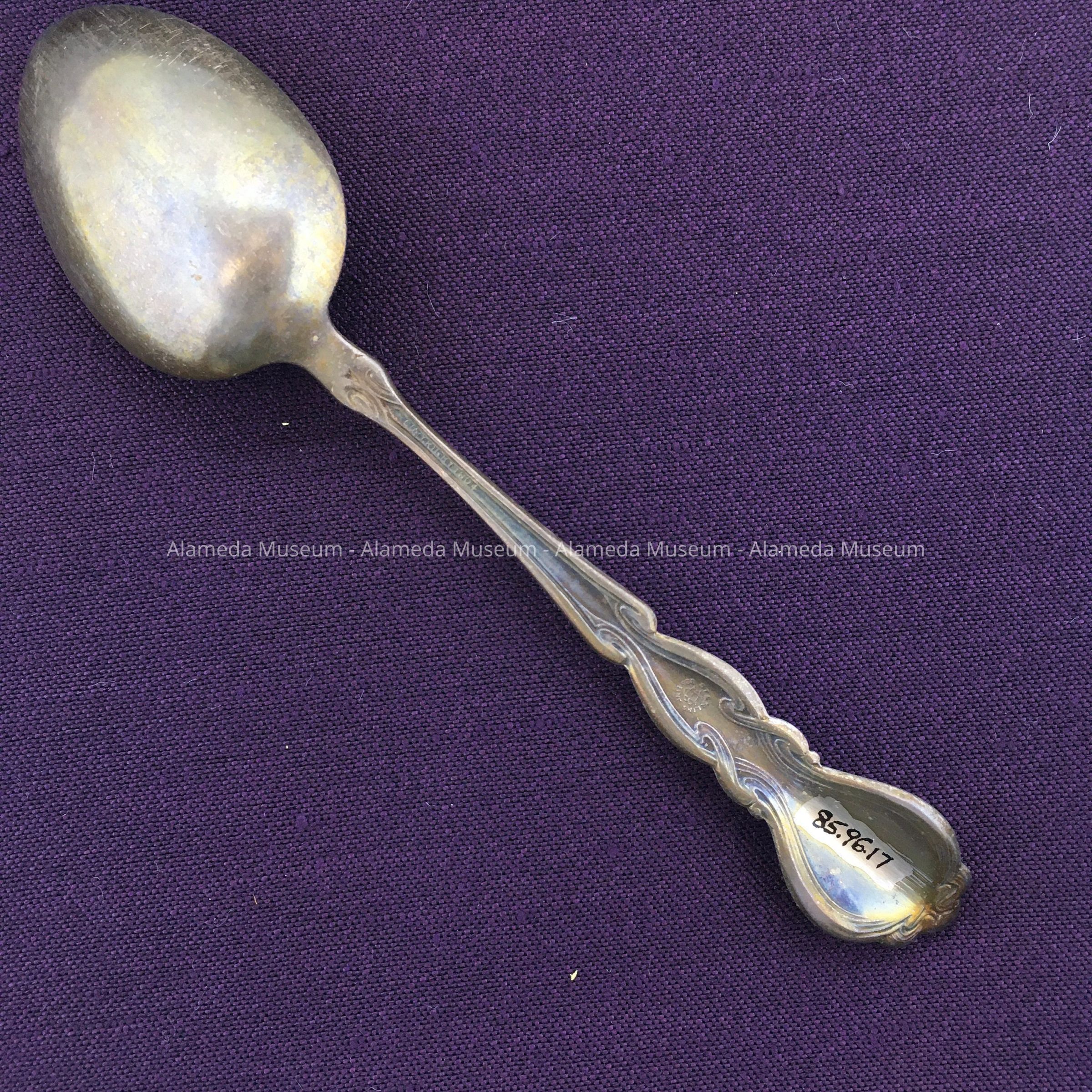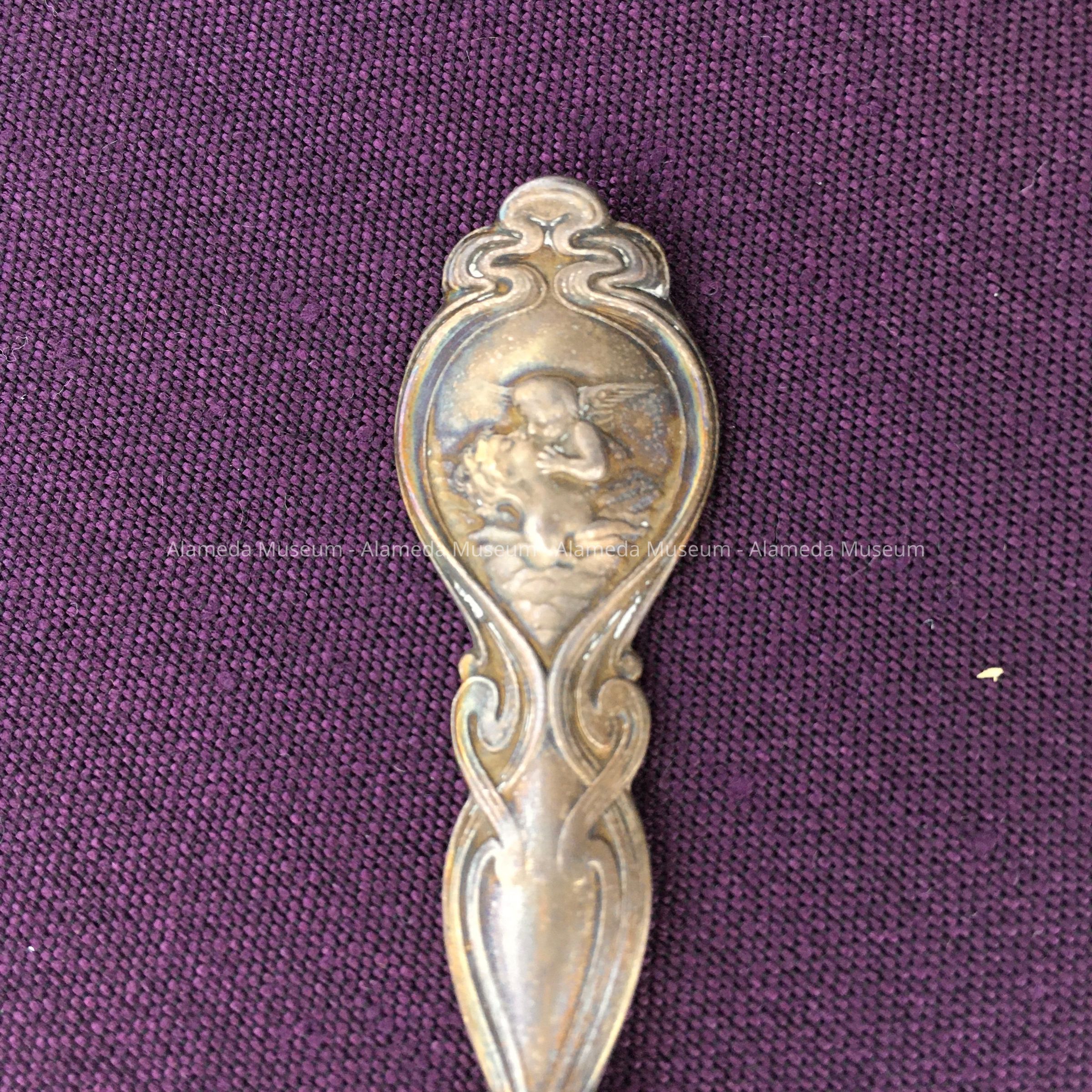 Souvenir spoon with engraved bowl depicting a Victorian style home (1409 Caroline Street) and the message "The House Where I Was Born." The donor’s parents rented the house following the earthquake & fire of 1906. It was here in 1907 that she was born. The spoon was possibly a gift commemorating the