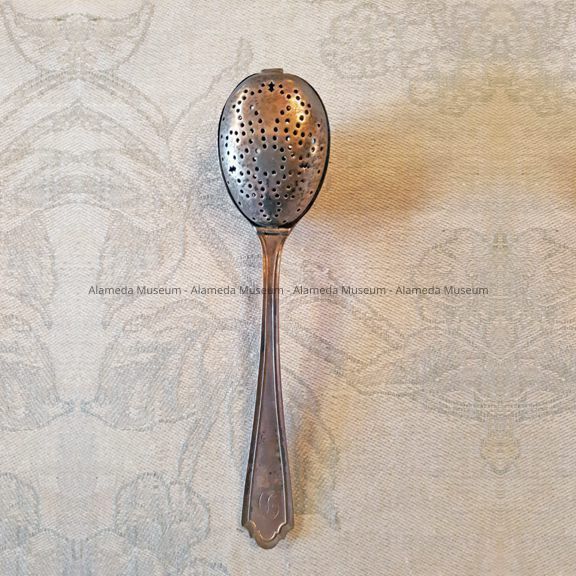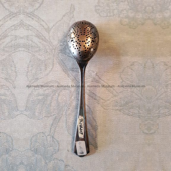 Description: Sterling silver spoon, bowl covered with pierced design. Domed bowl has a clasp and hinge; the hinged cover was used for retaining tea leaves. There is an engraved "D" on handle. Spoon appears to be of American manufacture.