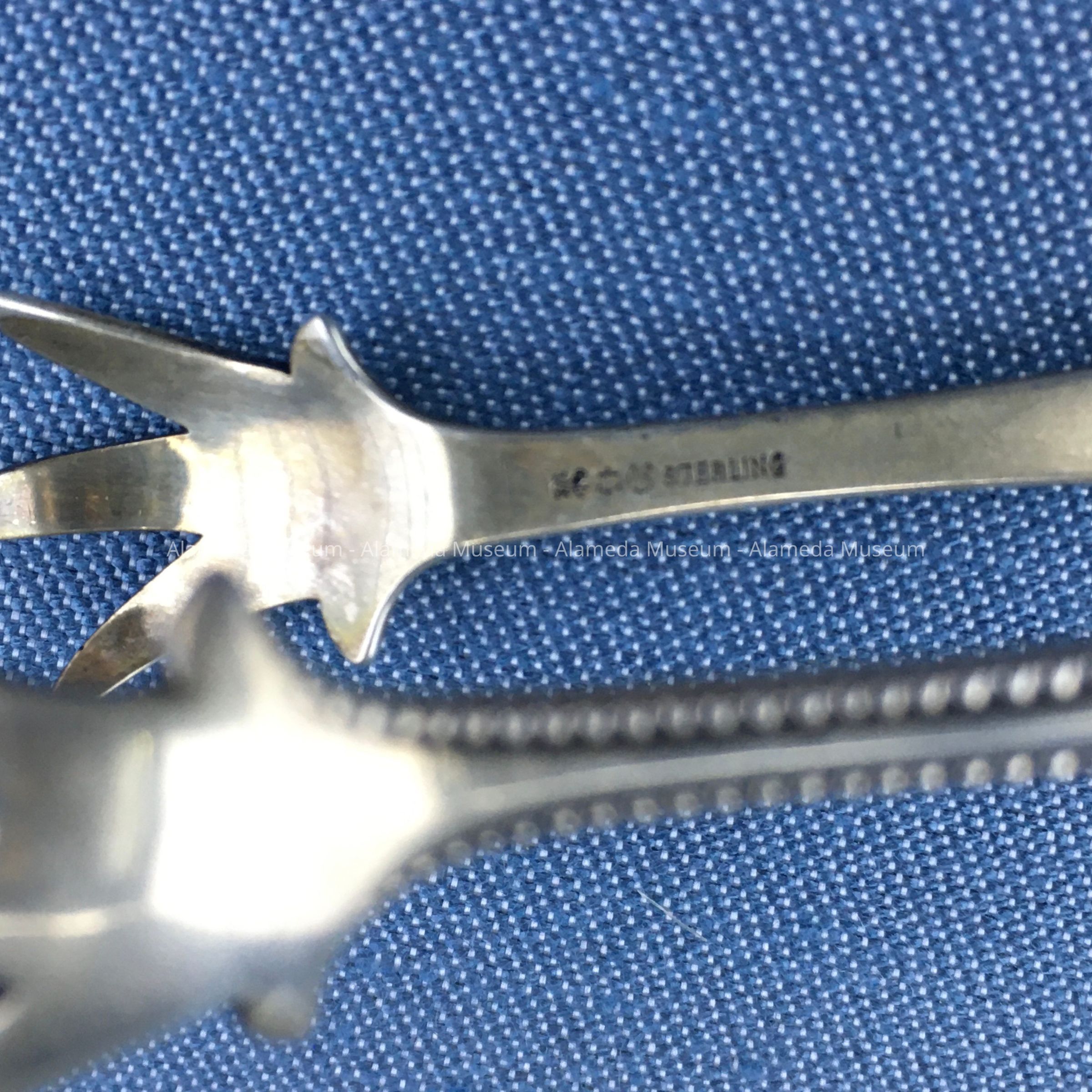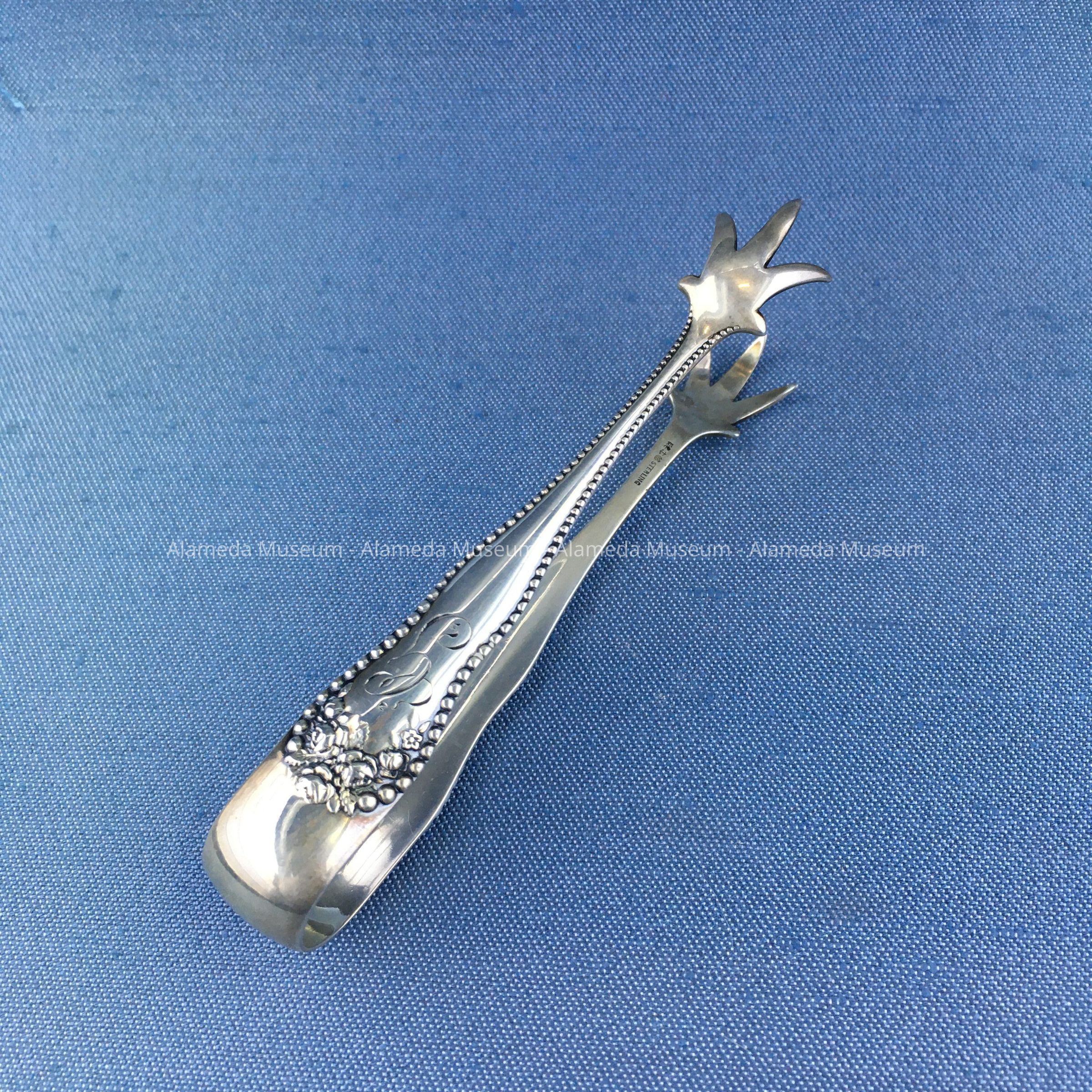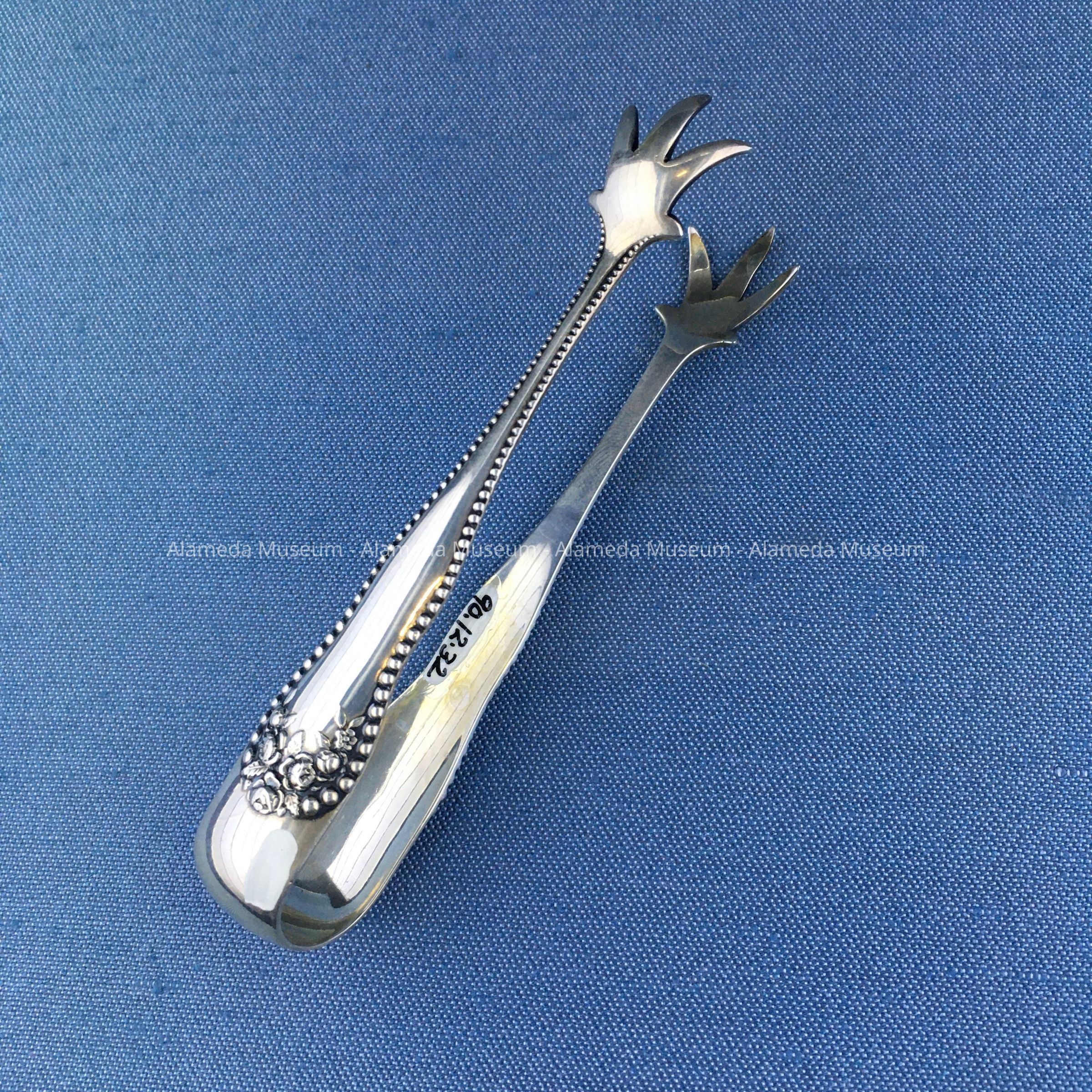 History of Object: Sterling silver sugar tongs engraved "G" (for Gilroy). Gilroy was the maiden name of Maude, wife of Neil Macdonald. The Macdonald family were old-time residents of Alameda.