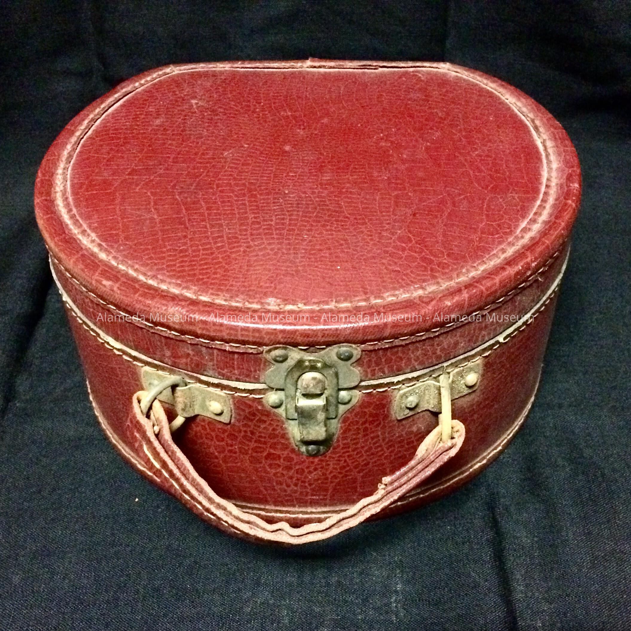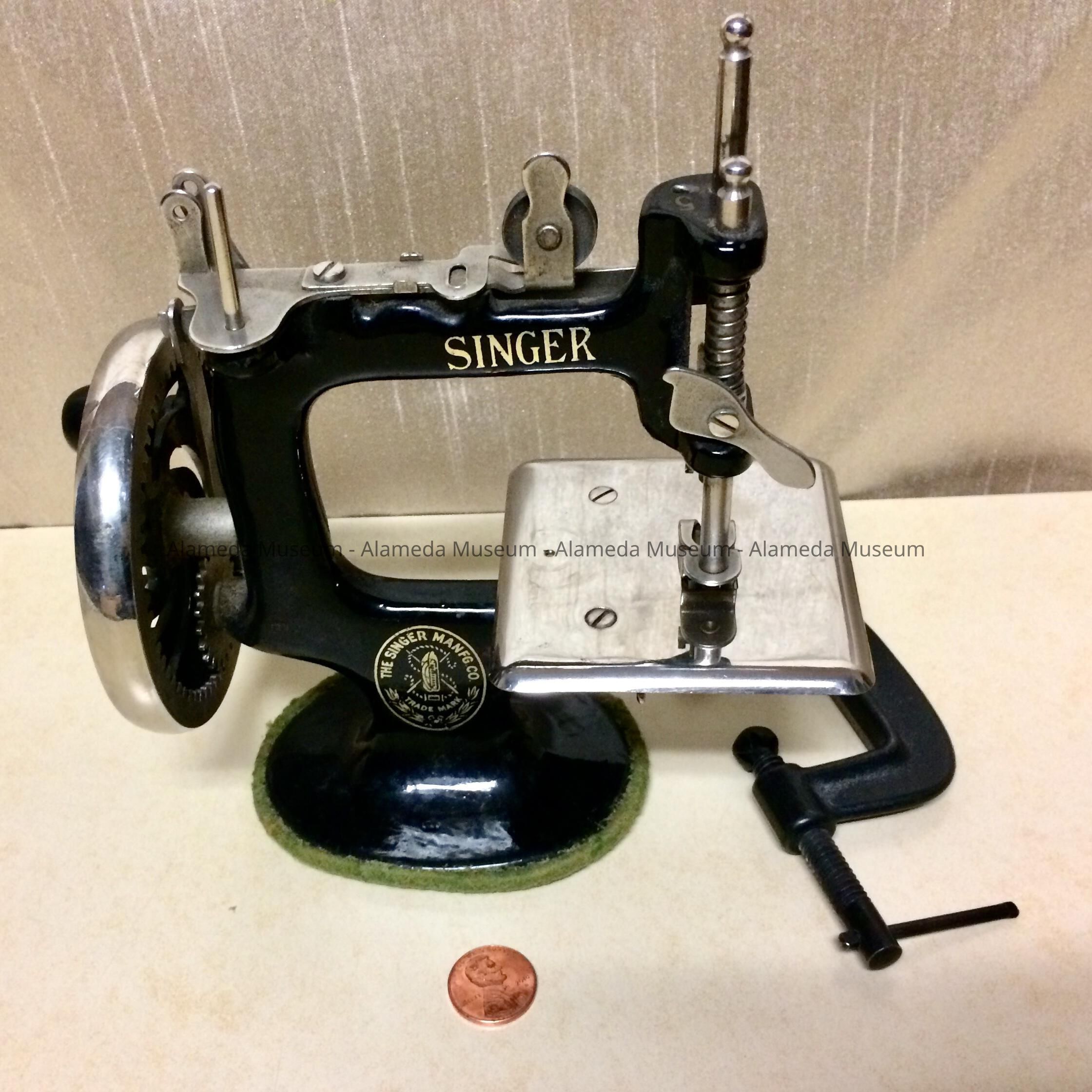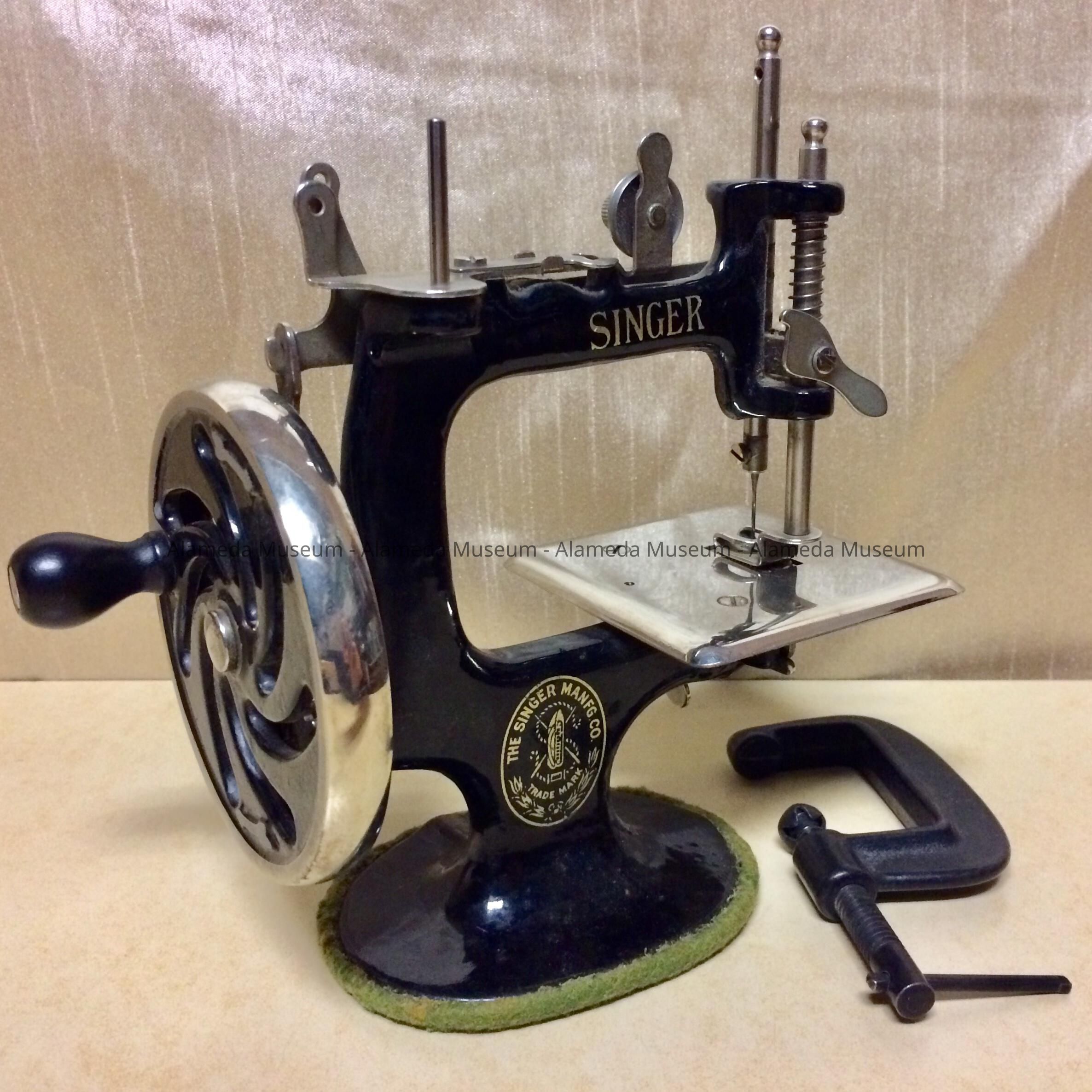 Description: A miniature replica of a hand activated table sewing machine, various parts are chrome plated. There is a circular shaped transfer medallion that states, "Singer Manfg. Co." It also includes an adjustable threaded clamp as a tabletop attachment. The original traveling case is covered in wine colored imitation leather with an attached bail handle.