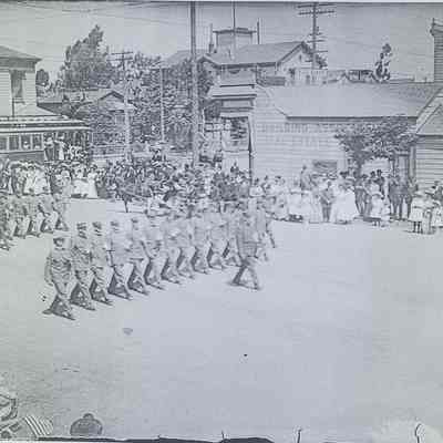 2024.74.1D is a glass plate negative showing solders marching in a parade. The negative is in very good condition, with minimal wear along the edges.