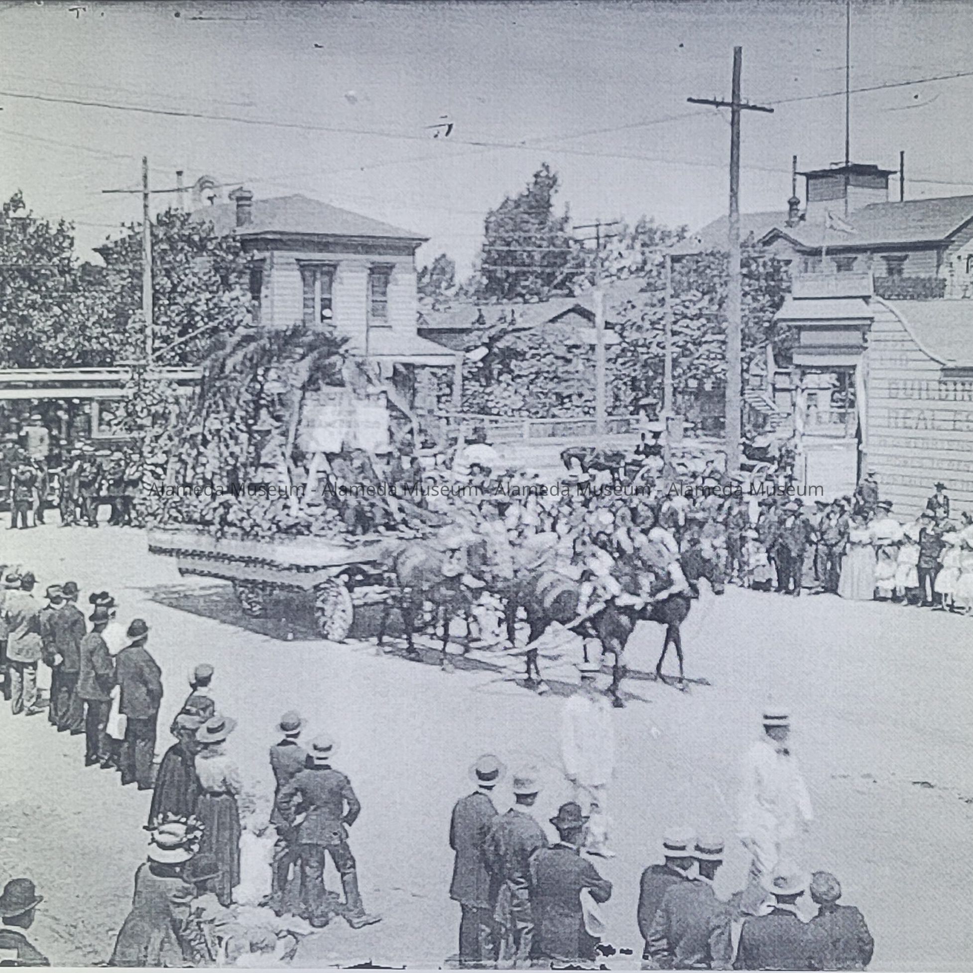 2024.74.1B is a glass plate negative also showing a parade float being pulled by four horses. A man riding a horse is about fifteen feet in front of it. The negative is in very good condition, with minimal wear along the edges and two small areas missing material near the bottom edge..