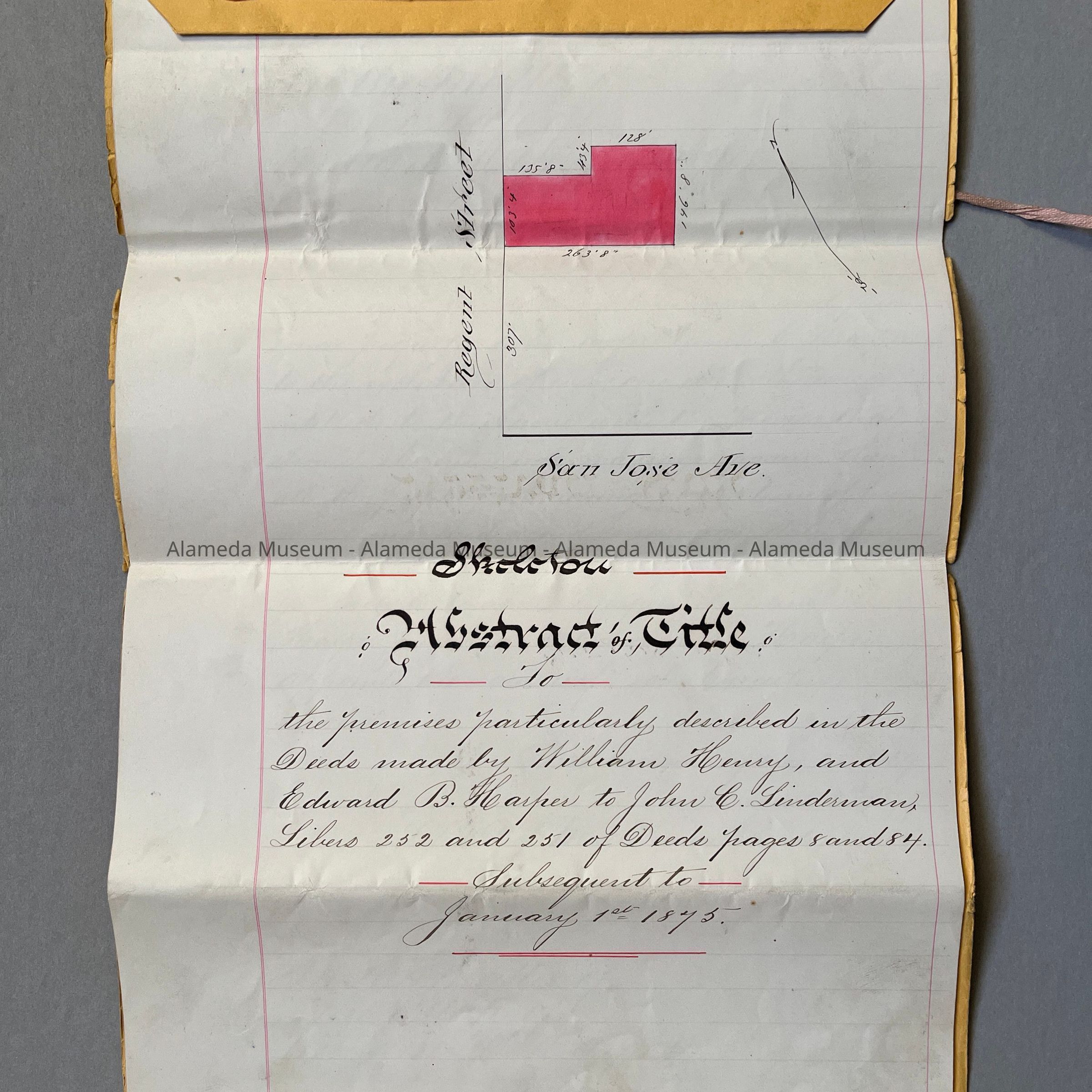 Description: A 6-page handwritten document on ruled paper containing yellow-colored paper coverlet, tied with a pink ribbon. Cover has bold-printed caption, "Skeleton Abstract of Title." First page includes a map, with a lot filled in in red, with Regent Street and San Jose Ave indicated. Dated January 1, 1875.