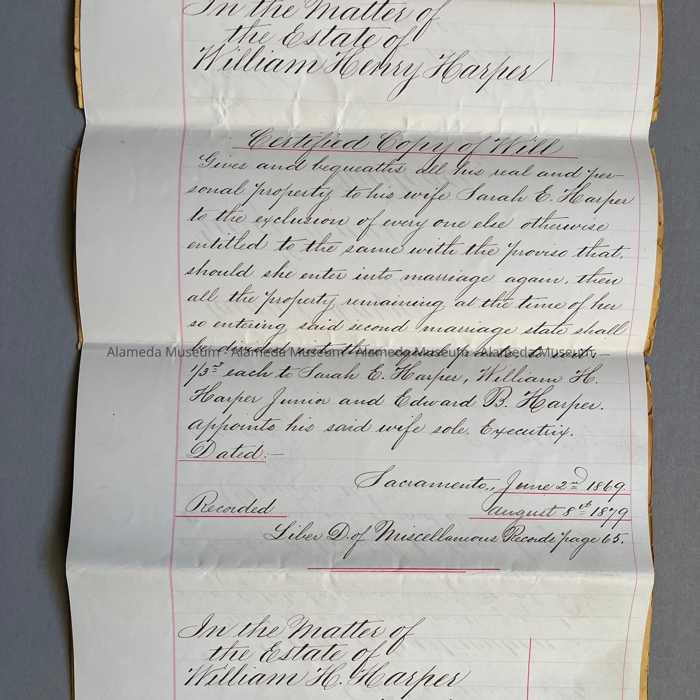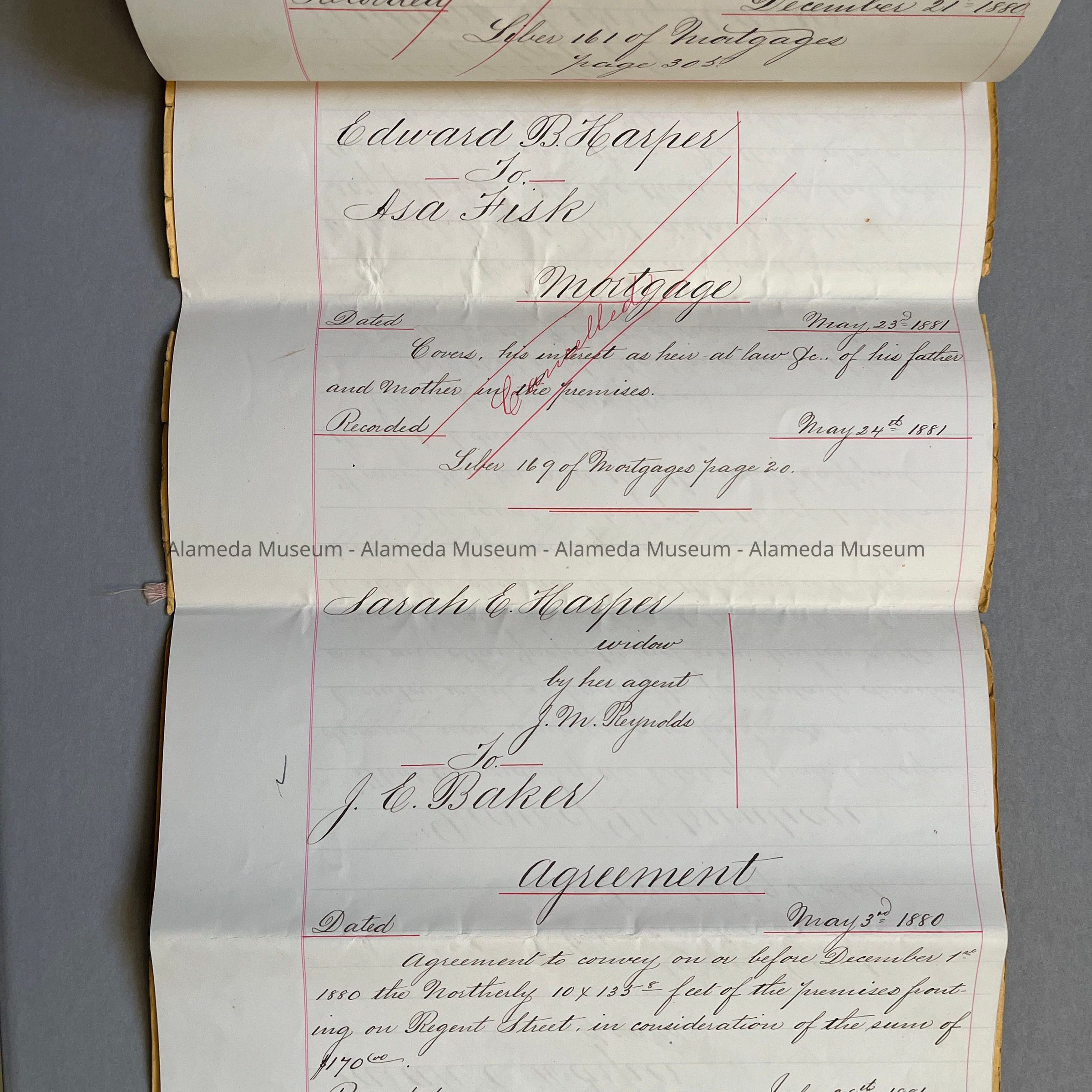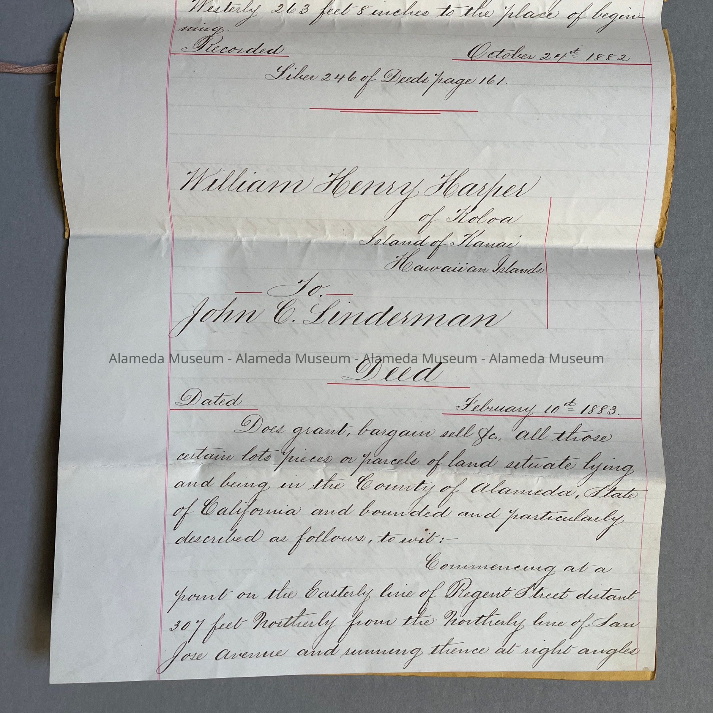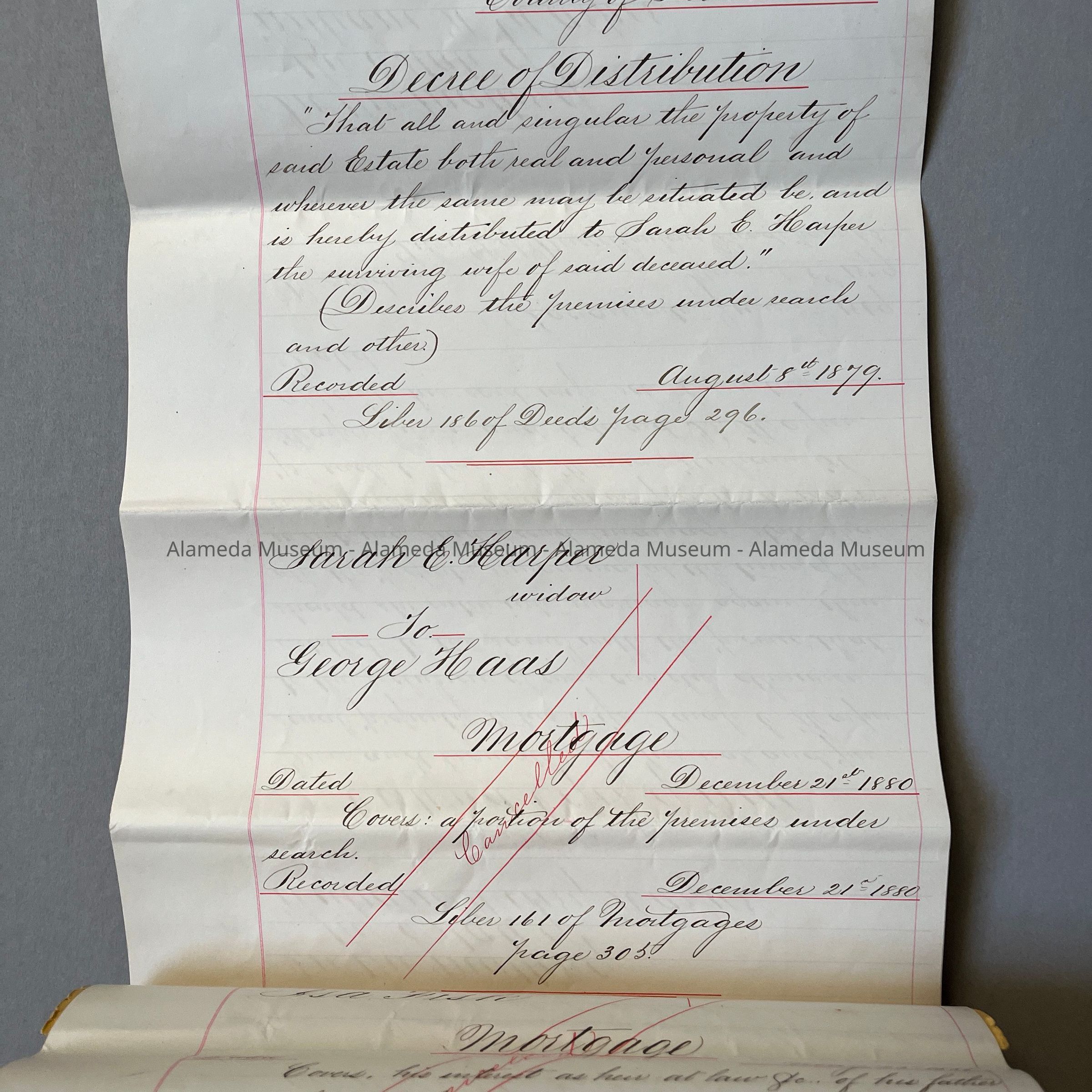 History of Object: "Skeleton Abstract of Title" concerning a property in the East End of Alameda, dated 1875. The document concerns the inheritance and sale of the property. The description pertains to a property now split into 1232, 1236 and 1238 Regent Street. Ownership passed from the estate of William Henry Harper, to Sarah Harper to George Haas, to J.E. Baker, and to John C. Linderman.