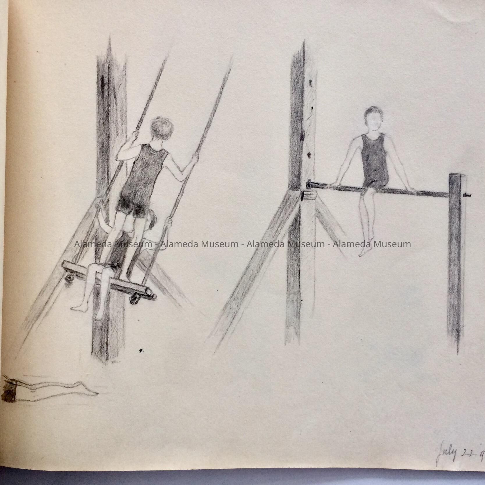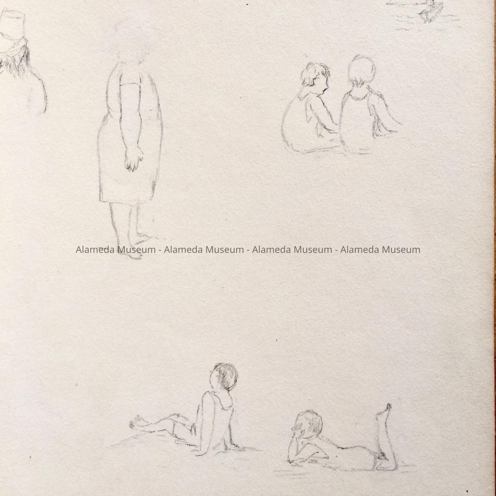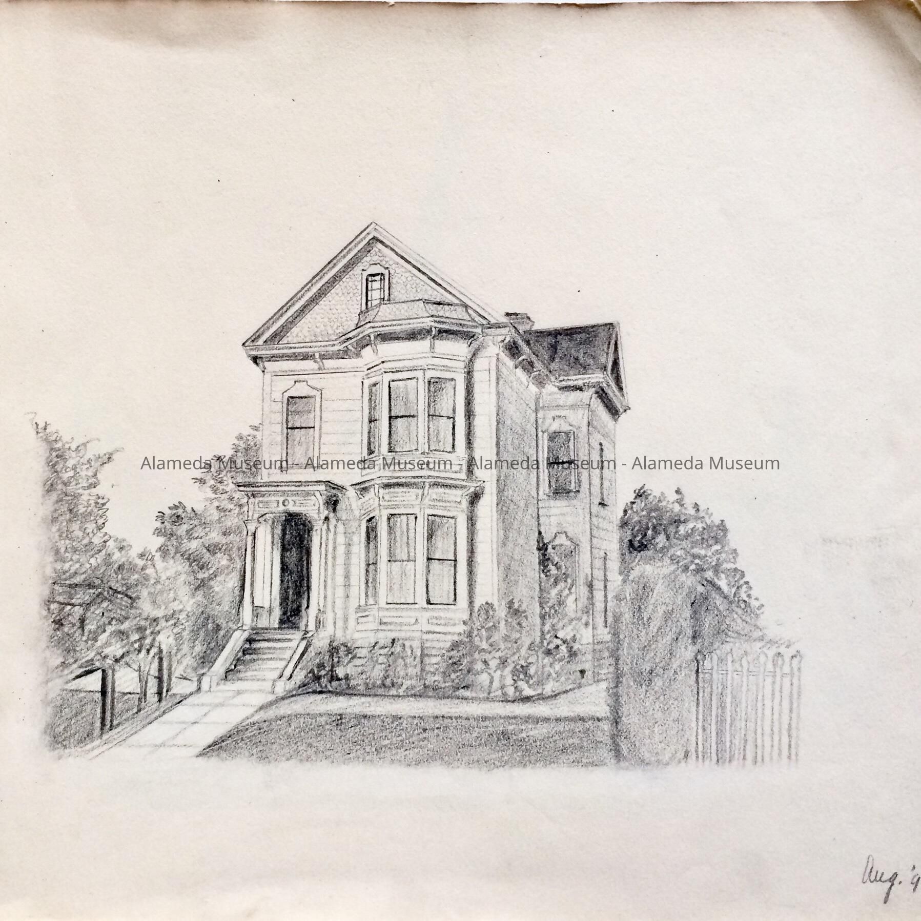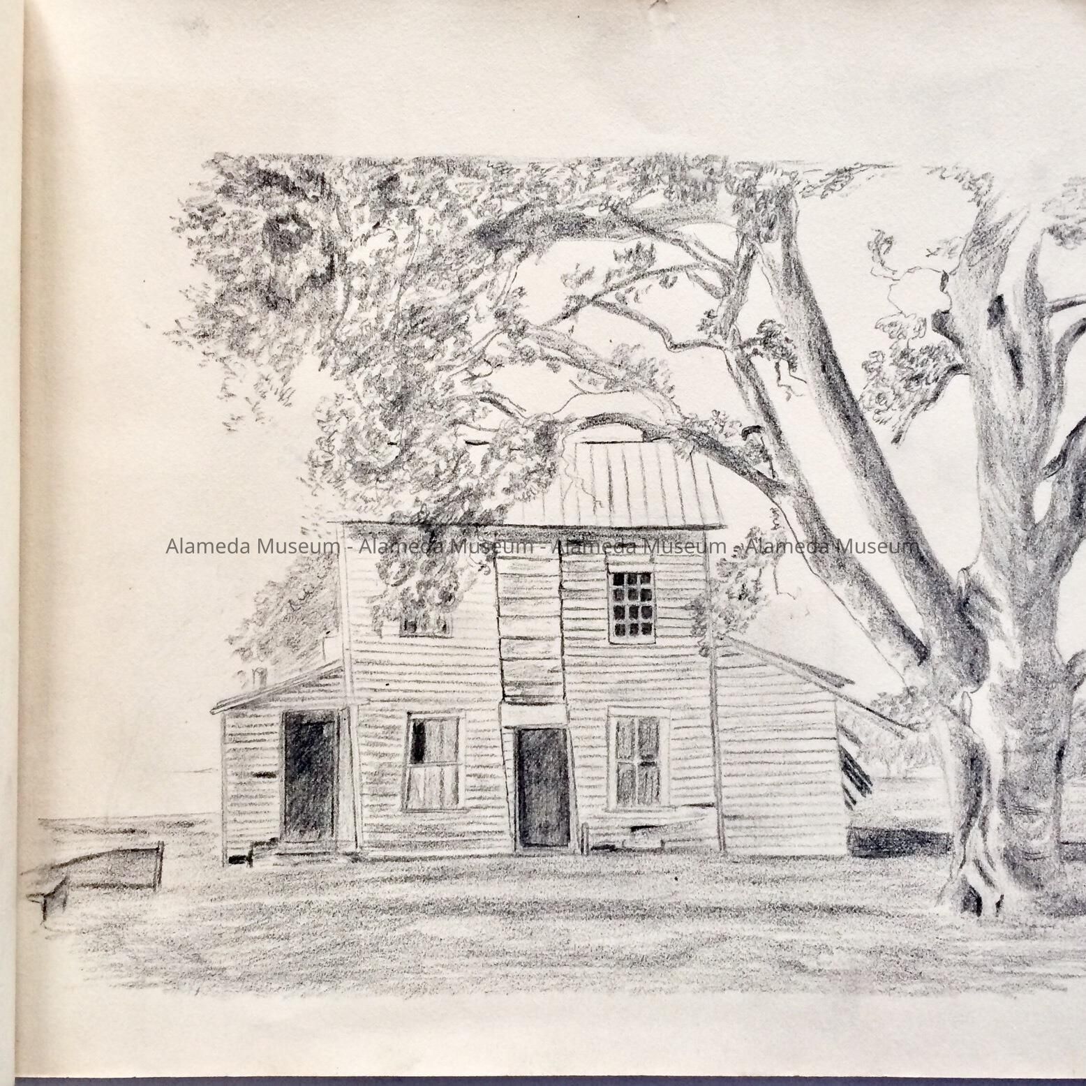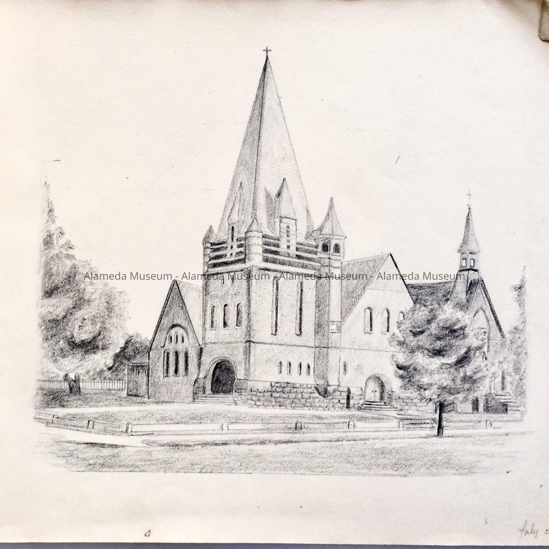 HISTORY OF OBJECT: THE SKETCH BOOK CONTAINS THREE IMPORTANT COMPLETED DRAWINGS. PAGE 3, THE DEAS FAMILY HOME, 1729 SAN ANTONIO, ITALIANATE RESIDENCE, WITH LATER ADDITION OF A QUEEN ANNE ROOF LINE. DATE, AUG, 1896. PAGE 4, CHRIST CHURCH, CORNER GRAND & SANTA CLARA, DESIGNED BY COXHEAD, AND DESTROYED BY FIRE. DATED, JULY 25, 1896. PAGE 6, THE MOST IMPORTANT PICTURE, ON THE SITE RENDERING OF THE FIRST HOUSE IN ALAMEDA, LOCATED ON SAN JOSE AVENUE, NOT FAR FROM THE DEAS RESIDENCE, DATED SEPT 11, 1896. THE SKETCH BOOK BELONGED TO LOTTIE (CHARLOTTE A. DEAS), 1877 TO 1973.