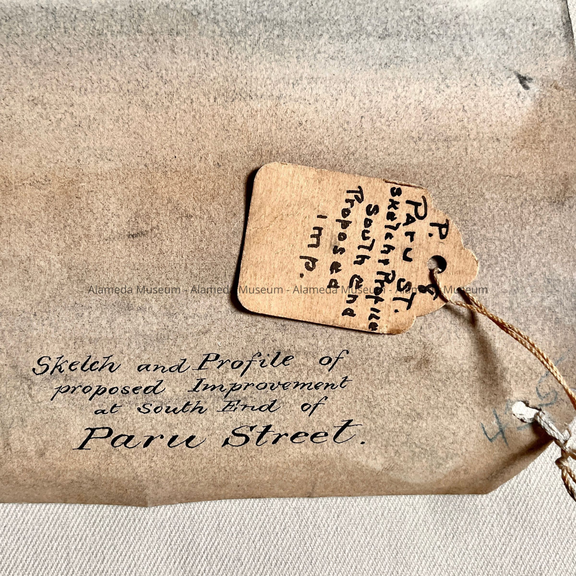 DESCRIPTION: HAND-DRAWN SKETCH IN BLACK COLORED INK ACCENTUATED WITH WATERCOLOR. SKETCH HAS A BOLD-PRINTED CAPTION, "PARU STREET, ALAMEDA."