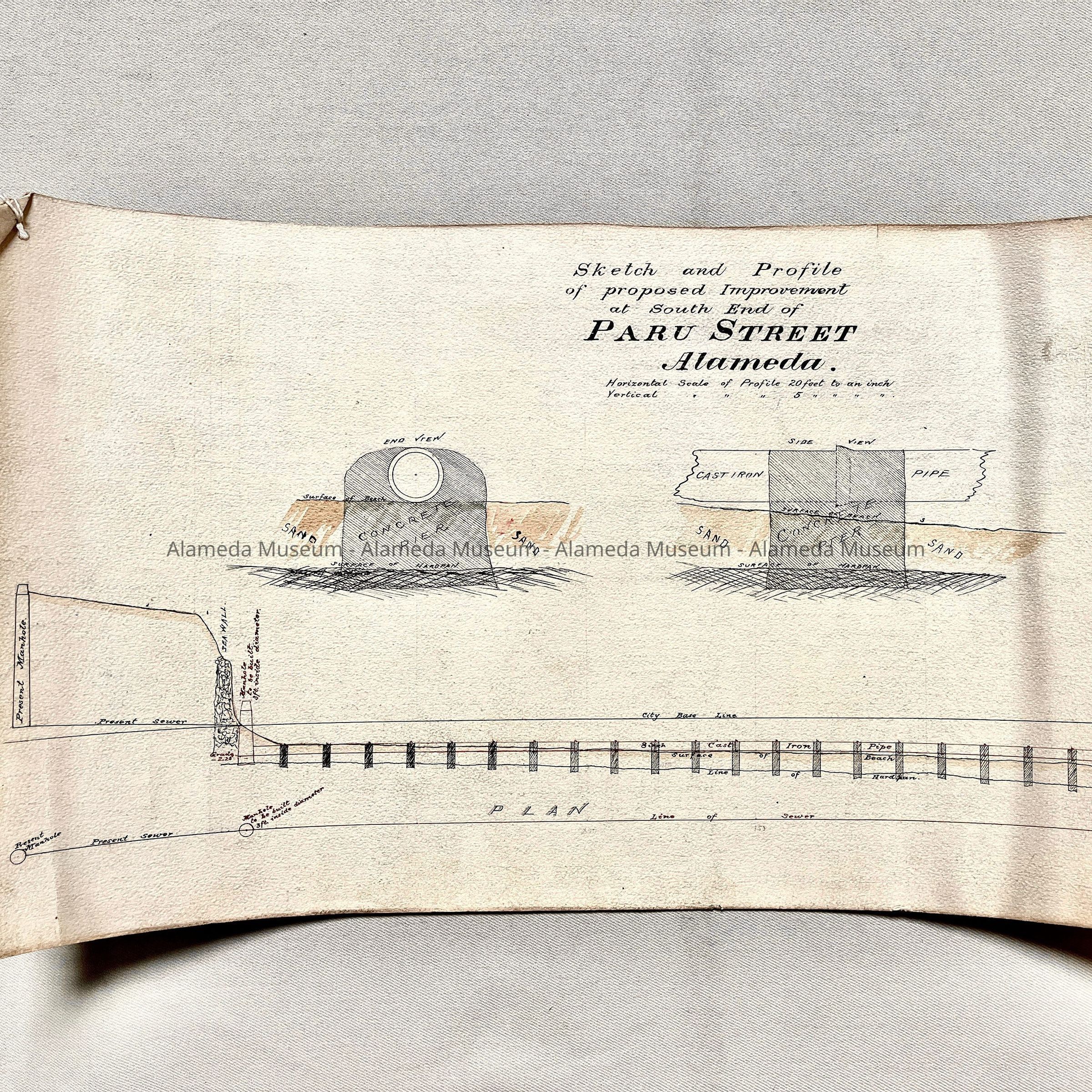 HISTORY OF OBJECT: SKETCH OF WHAT APPEARS TO BE A CONCRETE PIER OR BULKHEAD AT THE SOUTH END OF PARU STREET. DRAWING WAS CREATED FOR APPROVAL BY THE BOARD OF TRUSTEES, CITY OF ALAMEDA, CA.