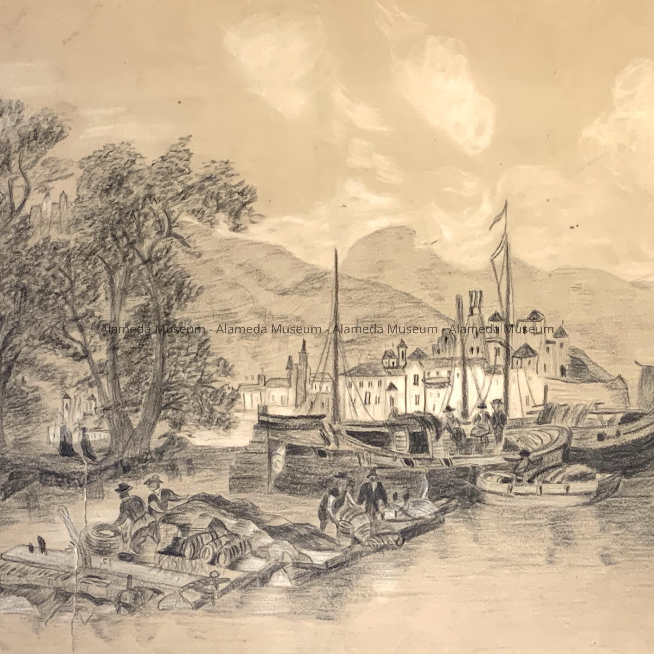 Description: A pencil sketch on paper depicting a river scene of boats and rafts with buildings in the background, signed, "Alice M.C."