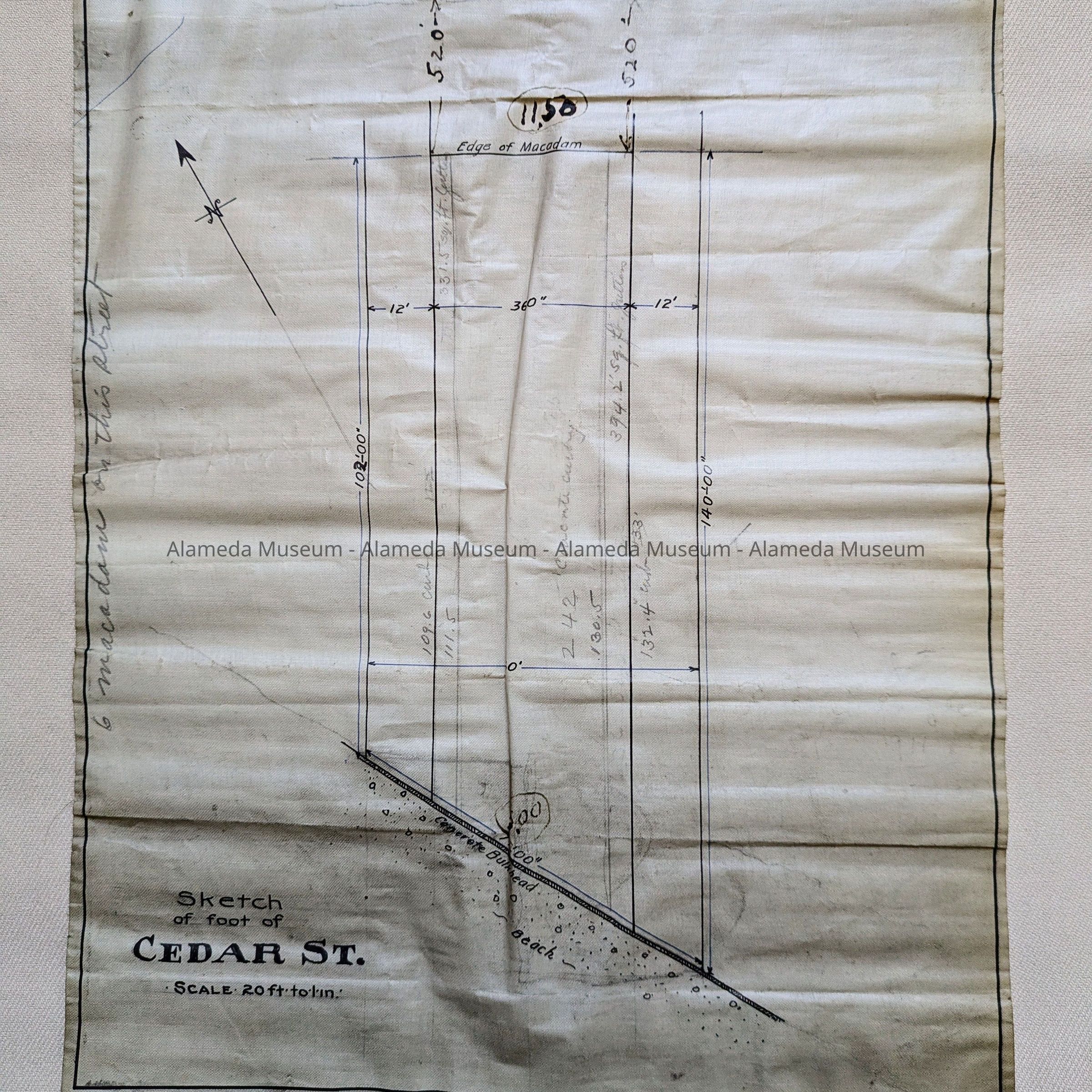 Description: A Plan, hand-drawn on off-white linen paper, with blocks marked in black ink. Title: ‘Sketch of foot of Cedar St.’. Scale 20ft to 1 in. In pencil, ‘6 macadam on this street’.