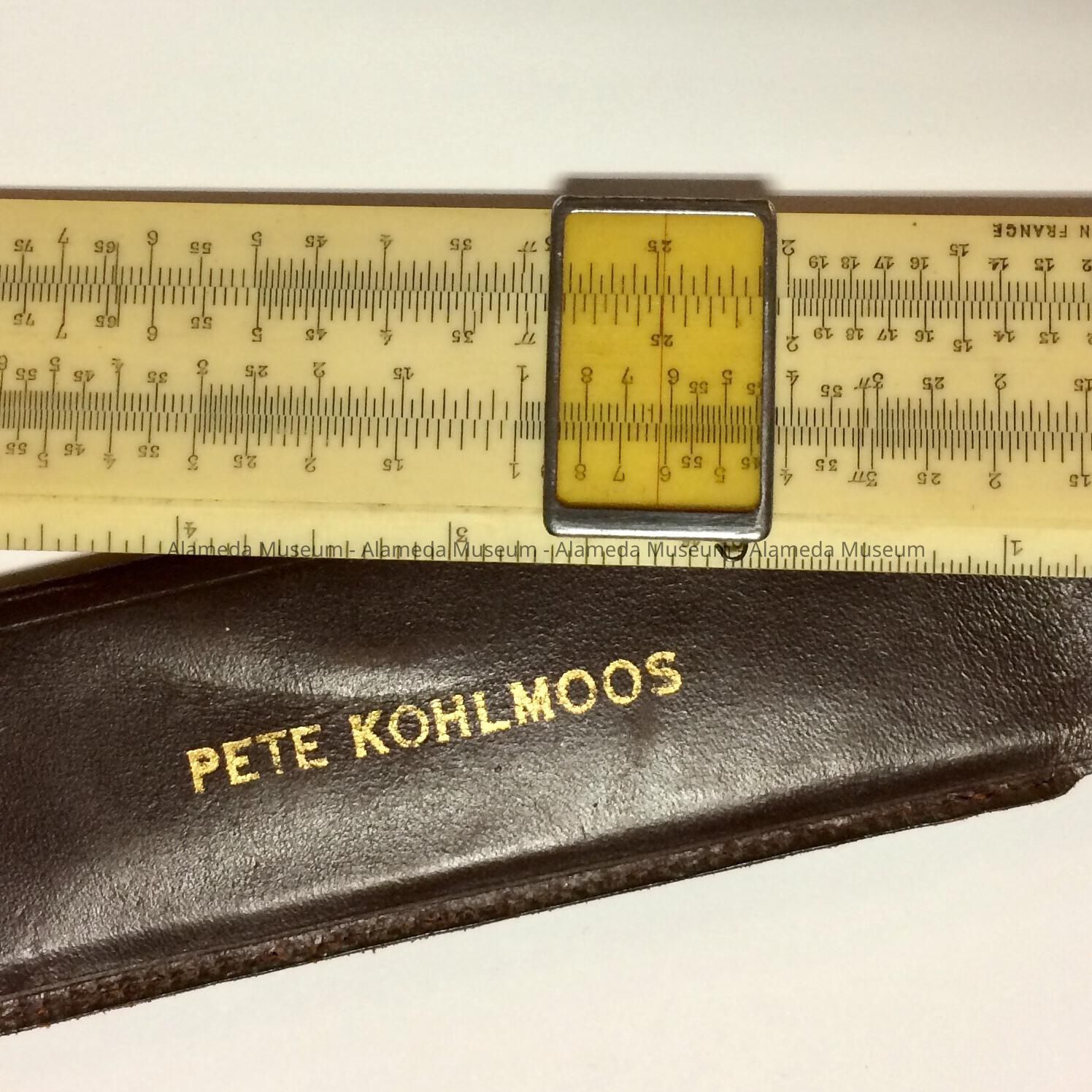 Description: A celluloid slide rule with its original leather jacket. An inscription on the jacket reads: "Pete Kohlmoos" in gold colored type on brown leather.