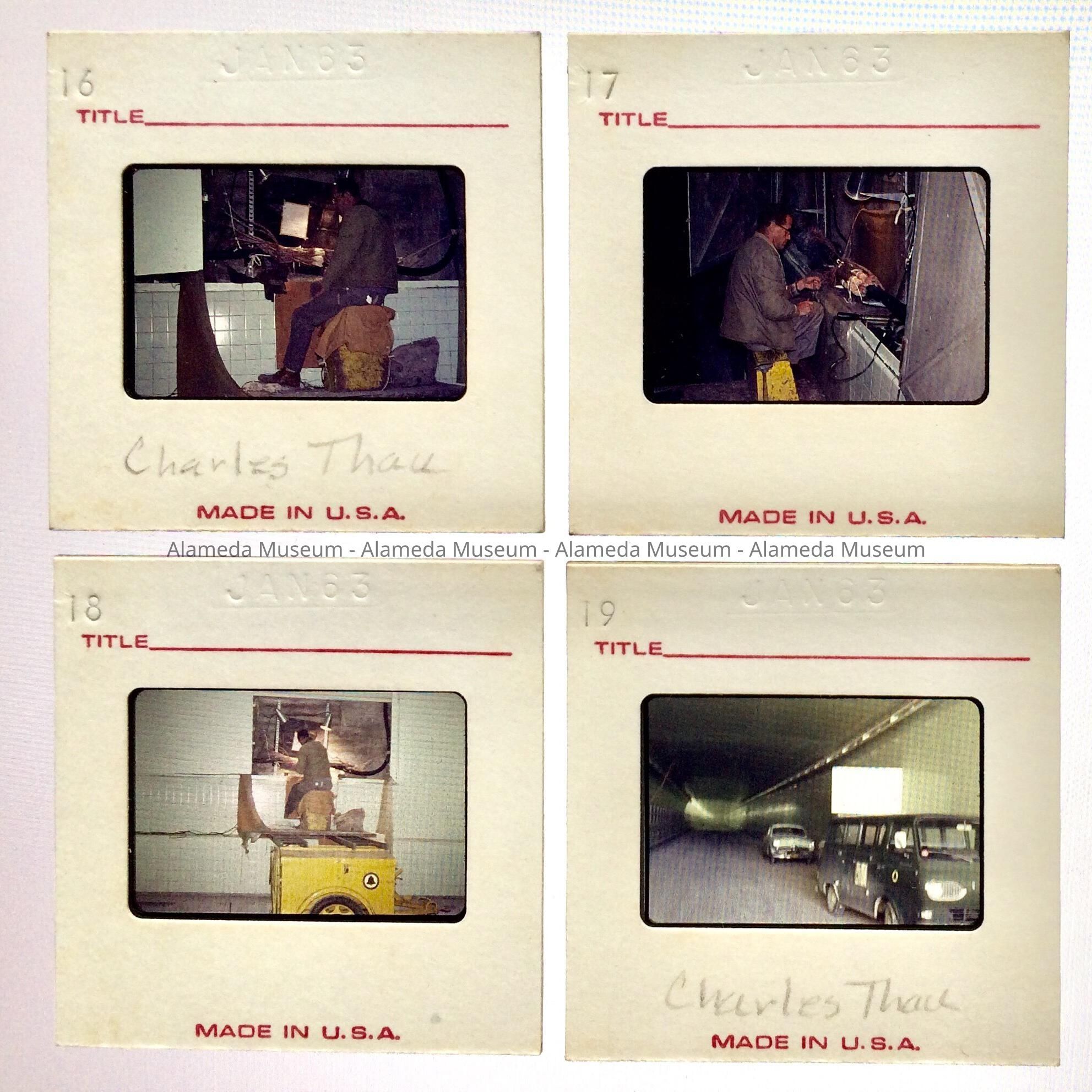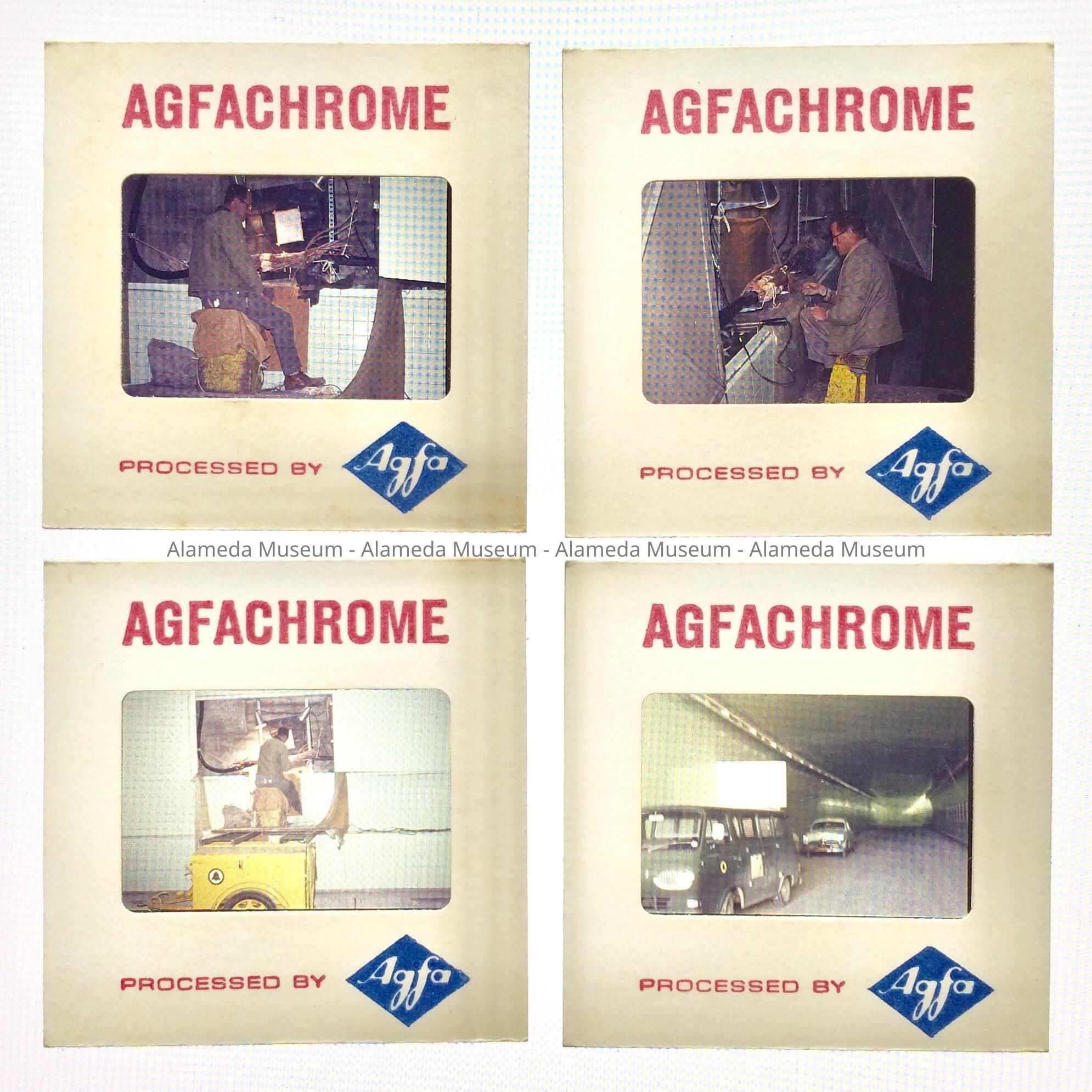 History of Object: Slides of color images of work being done on the Webster Street Tunnel before opening; 3 slides appear to show tiling and one shows three vehicles riding in the tunnel.