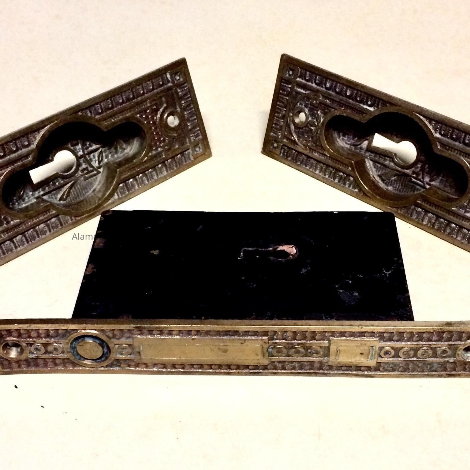 (A) Oblong-shaped mortise sliding door escutcheon with matching elaborate cast brass with Eastlake-style motifs. The grip part of the escutcheon is indented and has large cut-outs for insertion of keys.