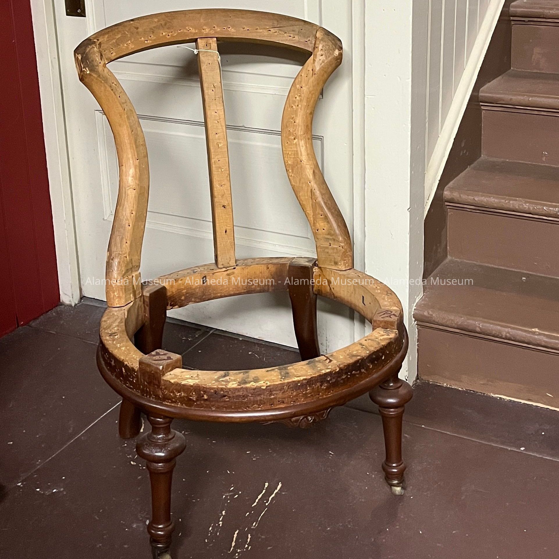 UPDATE 2025: THE INAPPROPRIATE UPHOLSTERY WAS REMOVED AT SOME POINT IN THE PAST. NOW JUST A BARE FRAME, AWAITING FURTHER RESTORATION OR DEACCESSION.